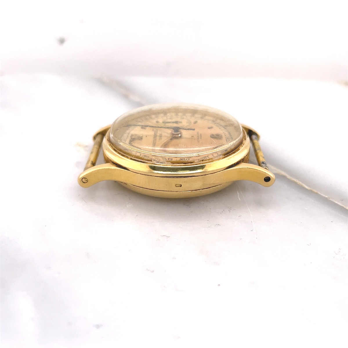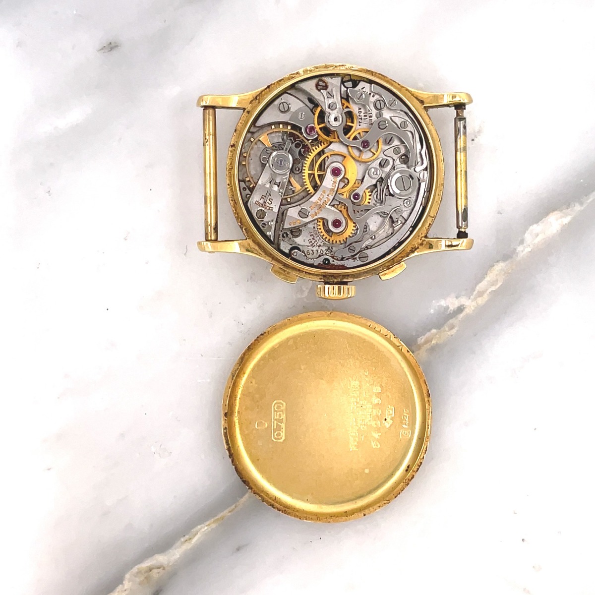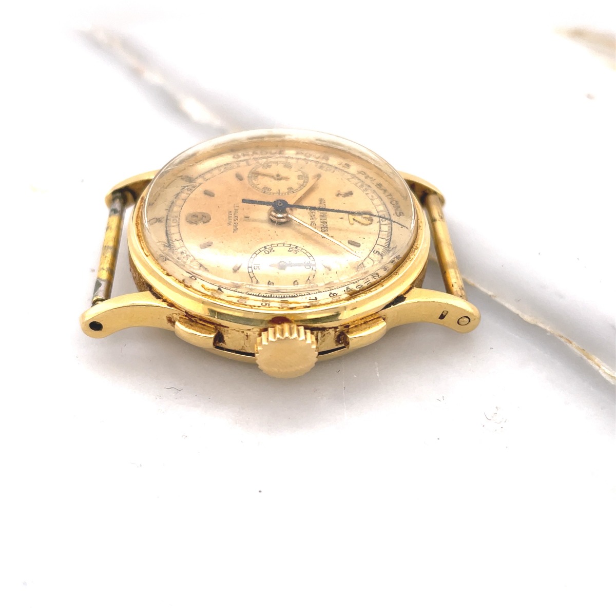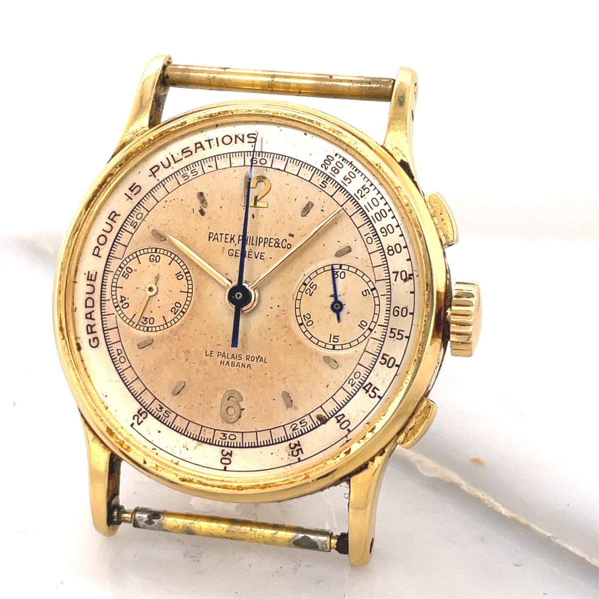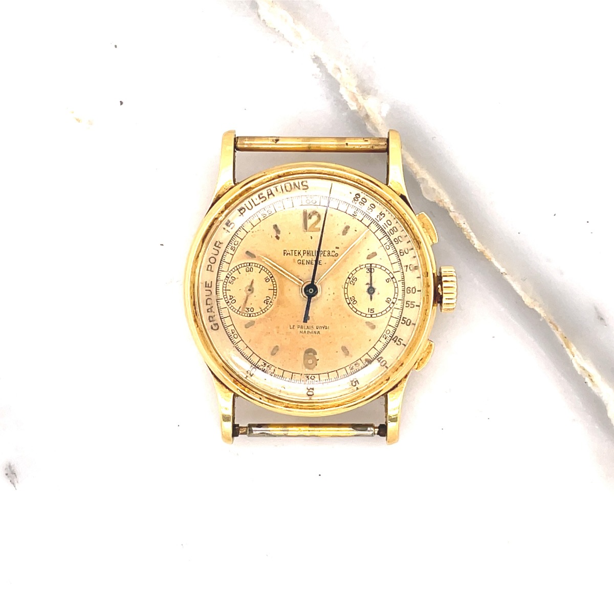 MK Personal Collection The present lot is part of a larger privately held collection and is intended for exhibition purposes only. Rare Men's Patek Philippe La Palais Royal Habana Chronograph Wristwatch Circa 1947. The watch features a three piece 18K yellow gold circular case signed "Patek Philippe Geneve Swiss Serial #642.XXX". It has a high grade Swiss Patek Philippe chronograph nickel-finished lever movement, 23 jewels, bimetallic compensation balance and micrometer regulator Serial #863.702. It is topped with a rare original two tone silver 15 Pulsation (Doctors) dial with applied polished yellow gold stick indexes, subsidiary seconds and 30-minute register dials, outer minute and seconds divisions with Arabic five-second numerals, outermost pulsometer scale graduated for 15 pulsations. It is signed on the bottom "La Palais Royal Habana". The watch is in overall very good condition. First introduced in 1934 and produced until the mid-1960s, the reference 130 differs from other Patek Philippe chronographs of the era with its elongated and curved lugs and slim bezel. This model was made for La Palais Royal Habana , Cuba .