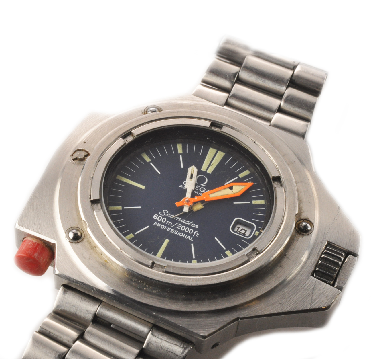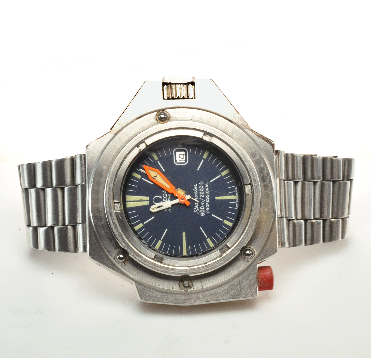 MK Personal Collection Rare Men's Steel Omega Ploprof (PloProf ) Seamaster 600 Wristwatch Circa 1970's. This is a rare massive steel three piece patented divers case topped with a revolving graduated bezel for decompression times with red security push-button at 2 o'clock to lock the bezel, hooded lugs, screwed-in and protected winding crown at 9 o'clock, bezel inclined and reeded, flat back with horizontal anti-slip groove pattern Serial # 166.077 measuring 45.40mm lug to lug x 55.50mm including the crown, sapphire grooved crystal, original matte blue with painted dial with luminous baton indexes, outer minute/seconds divisions, aperture for the date, luminous white hour and seconds hand and luminous orange minute hand. The watch has a high grade Swiss automatic Cal 1002 20 jewel movement that is in running condition. The watch was developed in conjunction with Comex and the Jacques Cousteau. Omega launched its first waterproof watch designed and built solely for the professional commercial divers in 1970. Seamaster 600 was nicknamed PloProf, which is short for Plongeur Professionnel (Professional Diver in French).