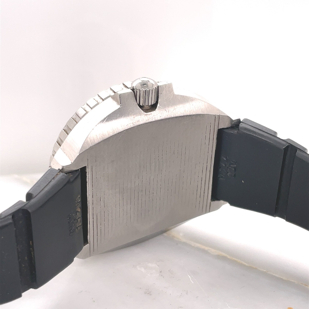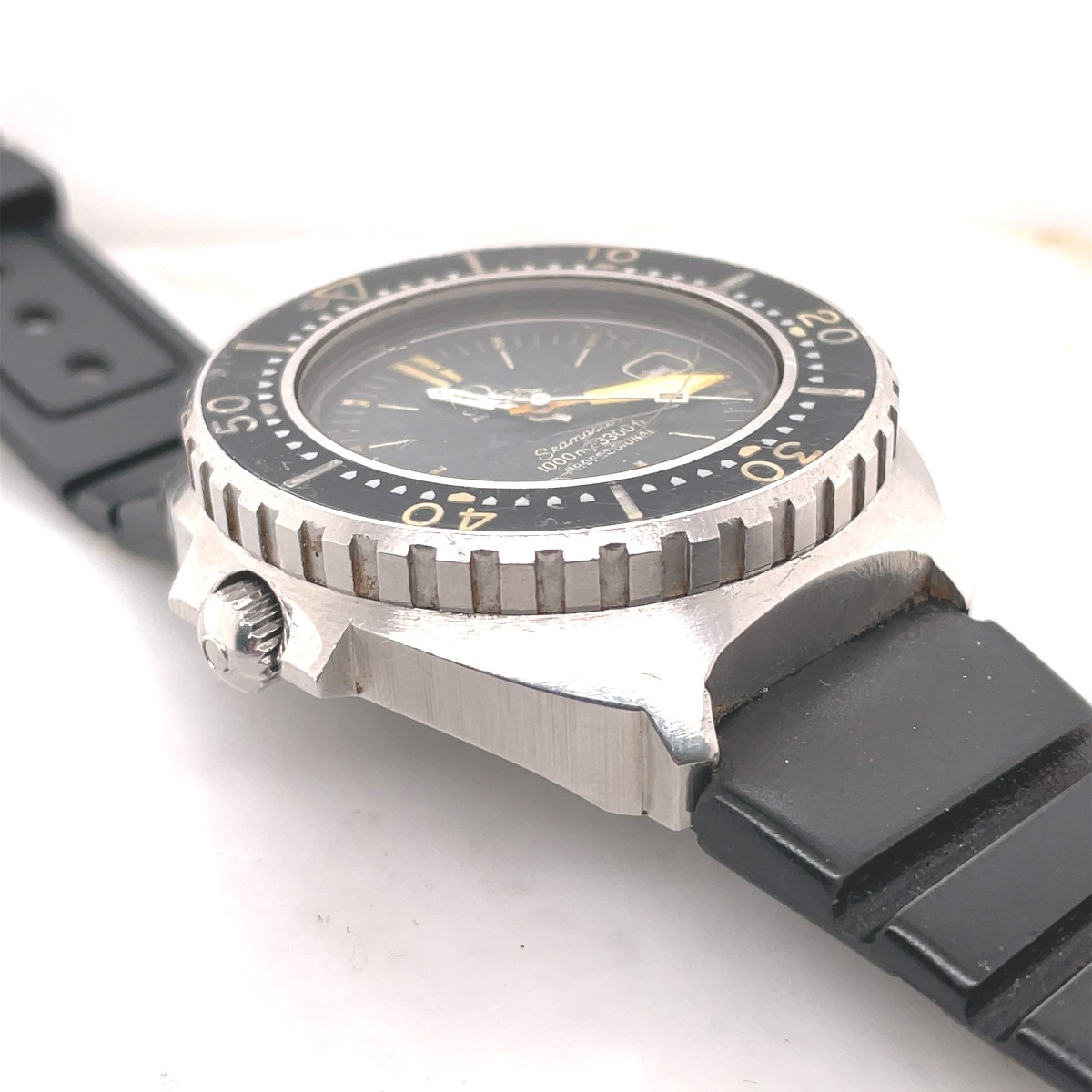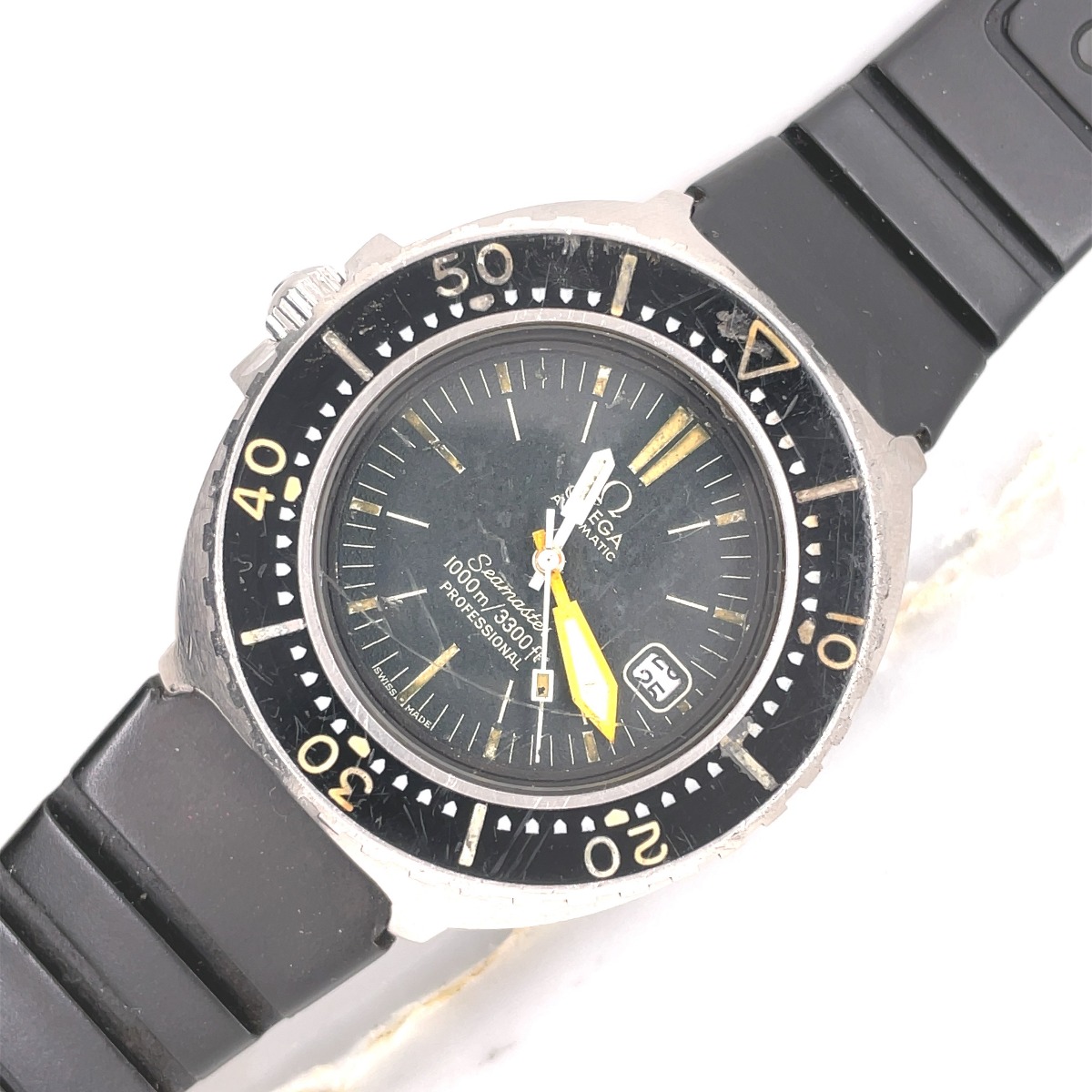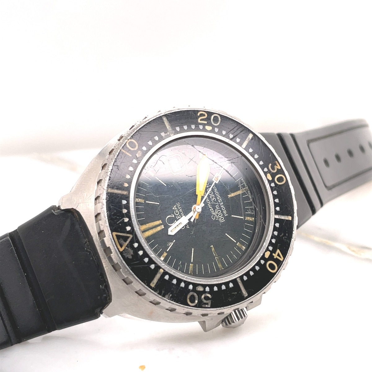 MK Personal Collection - Rare Men's Unique Steel Cut Lugs Omega Seamaster 1000 Wristwatch Circa 1974. This is a rare massive steel three piece patented divers case topped with a revolving graduated bezel for decompression times with hooded lugs, screwed-in and protected winding crown at 9 o'clock. The bezel is inclined and reeded, flat back with horizontal anti-slip groove pattern Serial # 166.096 that measures 47.00mm lug to lug x 49.00mm including the crown. The watch has a sapphire grooved crystal with an original matte blue with painted dial with luminous baton indexes, outer minute/seconds divisions and aperture for the date. The watch has luminous white hour and seconds hand, luminous orange minute hand and a high grade Swiss Automatic Cal 1012 20 jewel movement that is in running condition (Serial # 38.918.298). The Seamaster 1000 was launched in 1971 and became the first diver's watch to be rated to depth of 1000 meter. By placing the winding crown at 9 o'clock, Omega made these watches to be worn on the left arm to minimize the risk of damages while divin