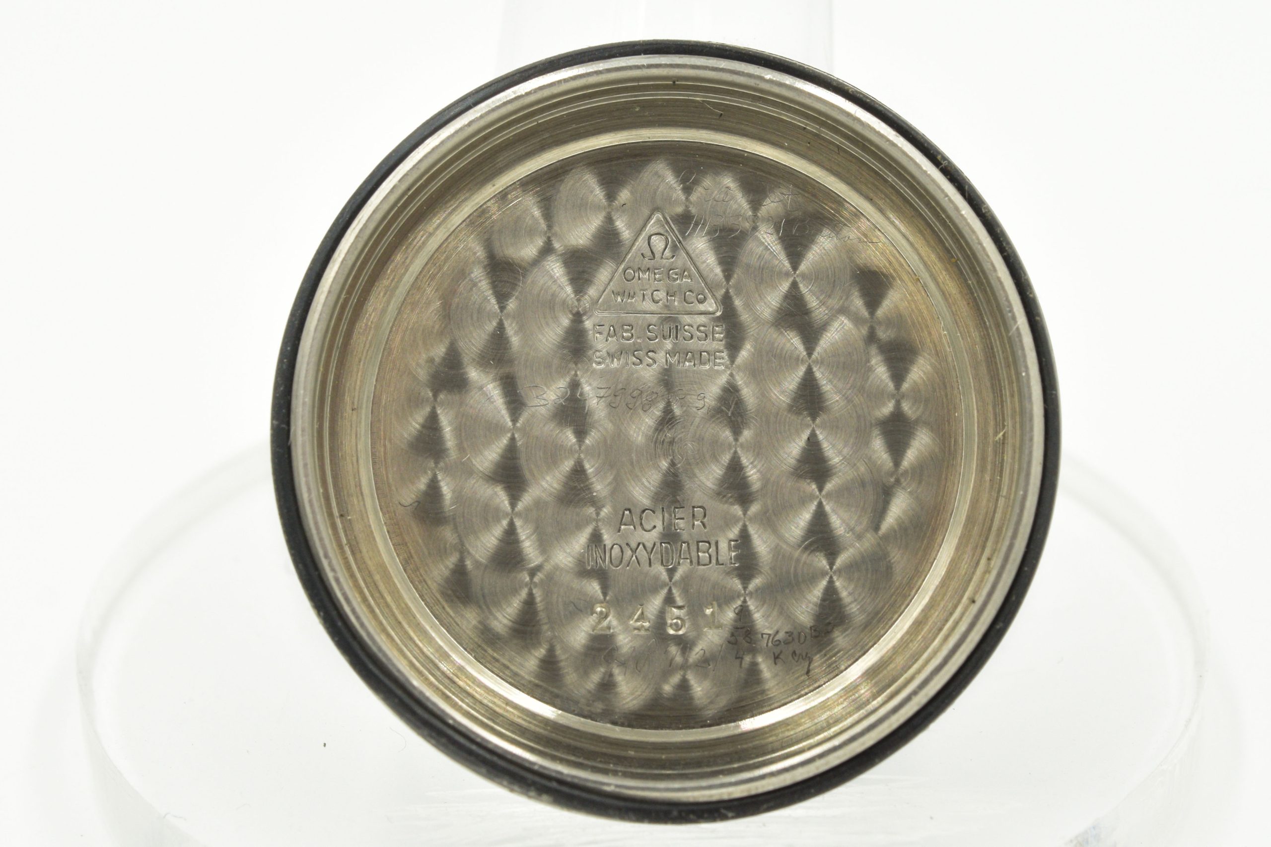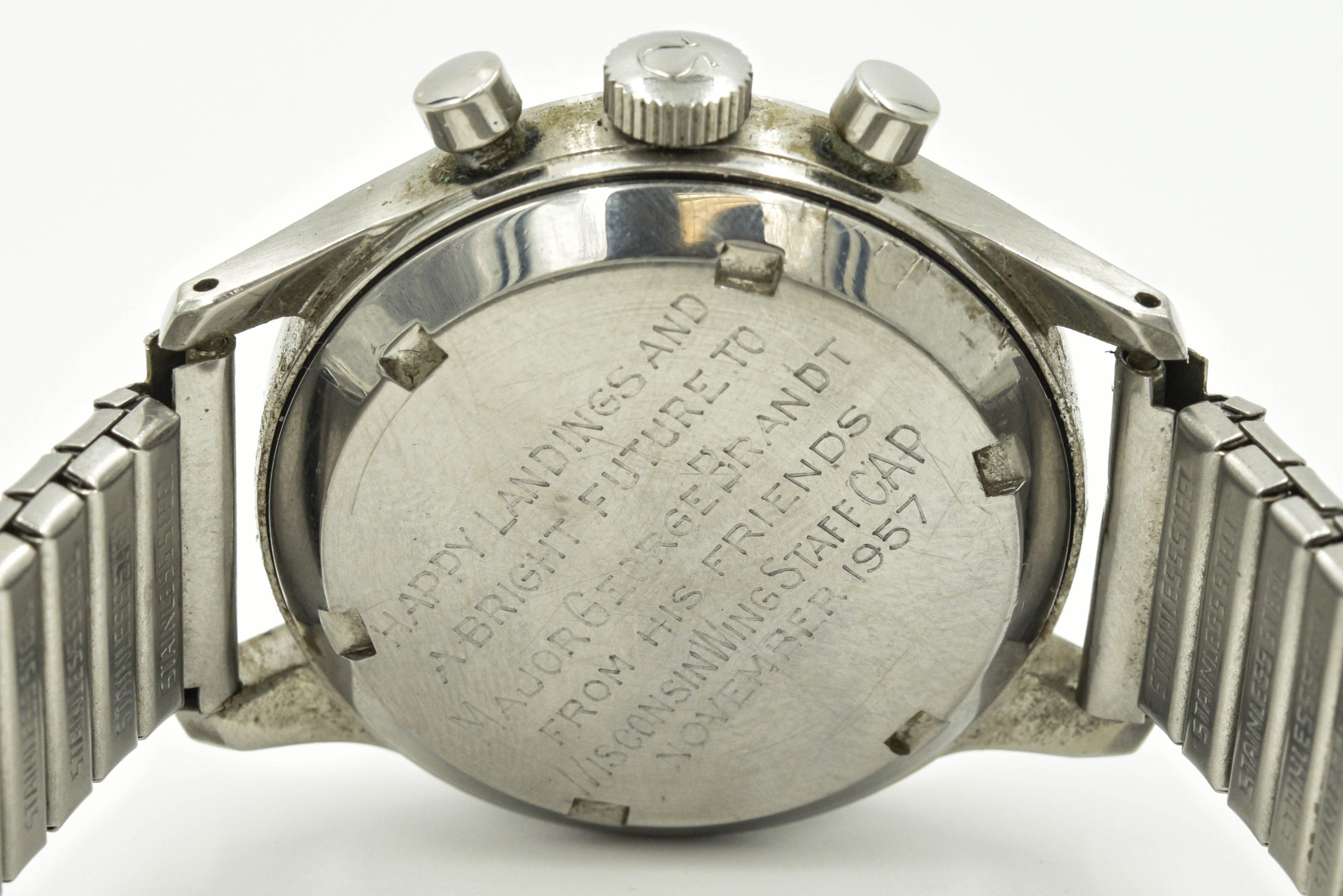MK Personal Collection Rare Military Omega Chronograph Ref 2451 Cal 321 Wristwatch Circa 1957 Fighter Pilot Distinguished Flying Cross Recipient . This steel Omega chronograph wristwatch was a gift to Major General George Brandt from "his friends" at the Wisconsin Wing Staff (CAP) Civil Air Patrol, Dated 1957. George W. A. Brandt Jr. was born on January 6,1920. He always wanted to be a pilot and started with enlisting with the Royal Canadian Air Force in 1941. He earned his wings as a RACF Sergeant and in 1942 he was repatriated into the U.S. Army Air Corps and received his battlefield commission in 1943 ready for WWII. George flew over 50 missions over Germany in his B-17 Bomber nicknamed "Queenie". One of his missions earned him the Distinguished Flying Cross for heroism. George was flying on his 50th mission back from Germany into North Africa on a hope and a prayer because he was missing an engine, had a shot up plane and had no landing gear but he managed to land that B-17 36,000lbs bomber on the runway saving him and his 10 crew members which was simply amazing. He continued with an illustrious career in the U.S. Air Force eventually retiring as a Full Colonel in 1973. This watch is a rare chronograph in a three piece stainless steel circular case with applied beveled lugs that measure 42mm x 39mm including the crown and 18mm between the lugs. It is signed on the inside back cover "Omega Watch Co Fab. Swiss Made Ref 2451". The watch has an Omega caliber 321, 17 jewels, straight line lever escapement, monometallic balance, self compensating Breguet balance spring with shock absorber (Serial #14.781.561) that is in running condition. As with most antique wrist watches, we recommend an overhaul service just so the watch keeps super accurate time. The watch is topped with a rare original silver painted dial with triple engine turned registers (30 minute, 12 hour and constant 60 seconds) outer 60 minute chapter ring. The watch is in overall good condition. It is engraved on the back cover "Happy Landings And Bright Future To Major George Brandt From His Friends Wisconsin Wing Staff CAP November 1957". The watch is accompanied with the fitted box.