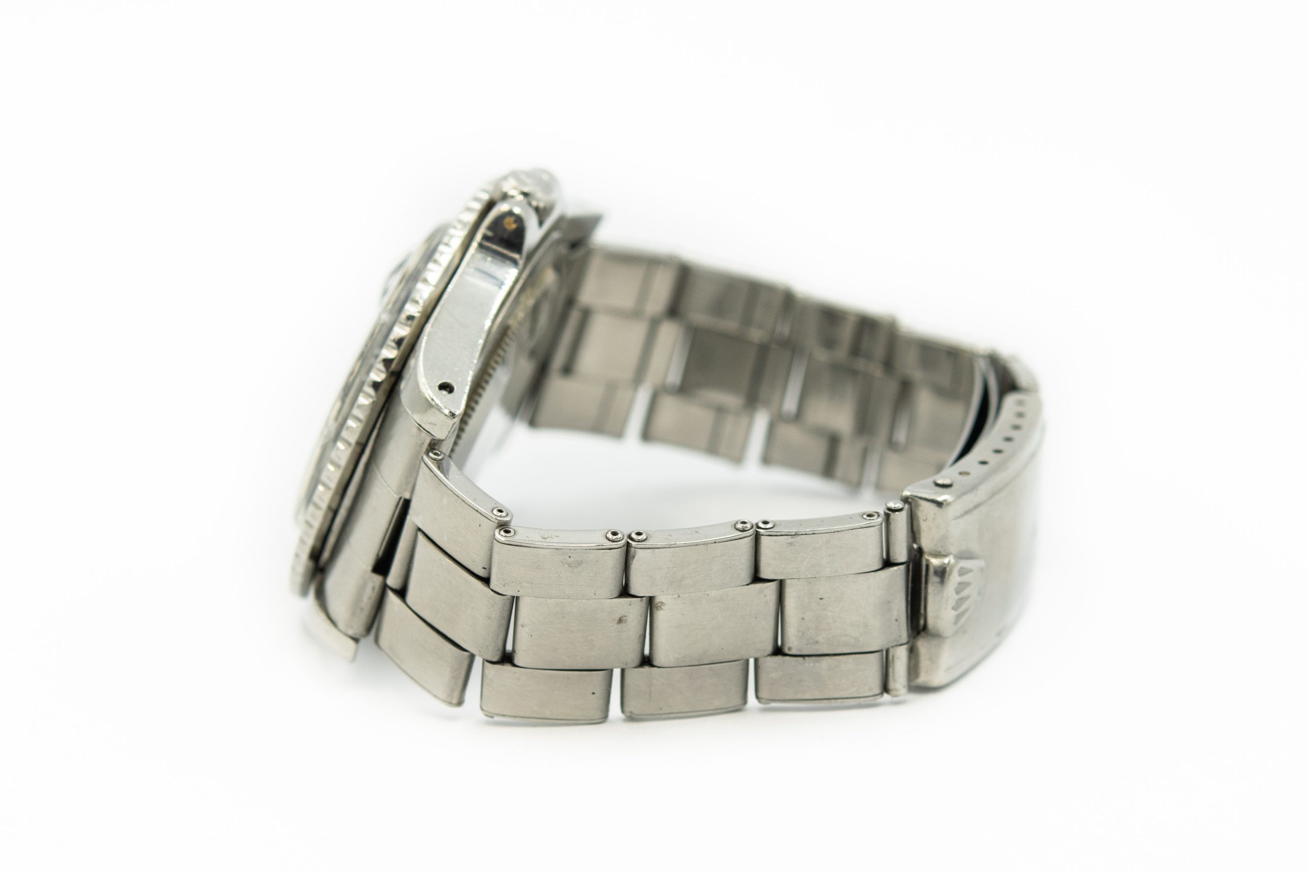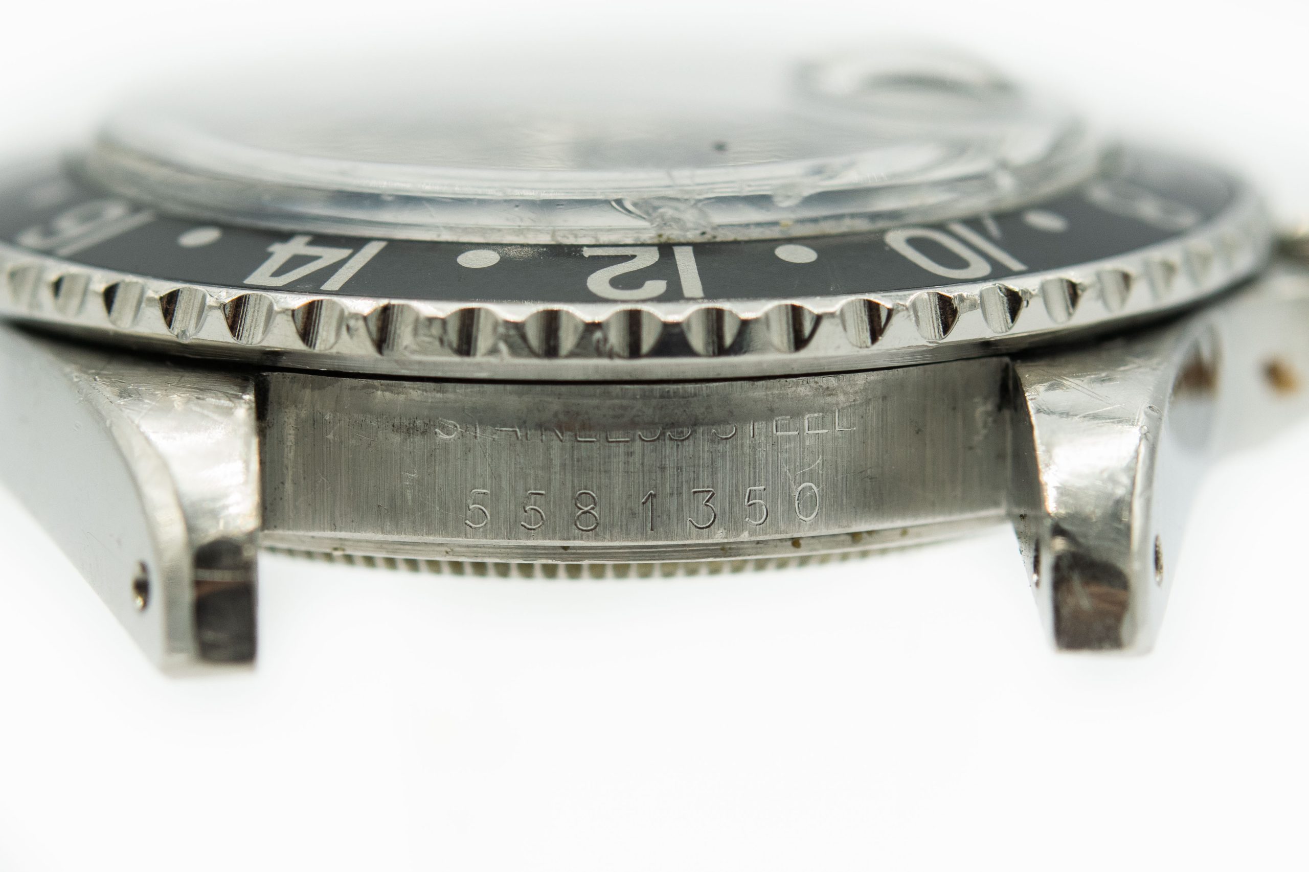 MK Personal Collection Rare Rolex GMT Master MK5 Wristwatch Ref 1675 Circa 1978/9. The watch features a vintage classic Rolex GMT Master in a three piece steel oyster case with a screw down waterproof back and crown, Ref 1675, Serial # 5.581.350. It is stamped on the back inside cover 1675. The watch has a high grade Rolex Cal. 1570 rhodium-plated movement with 26 jewels, straight line lever escapement, monometallic balance adjusted to temperatures and 5 positions, shock-absorber, self-compensating free-sprung Breguet balance spring that is in running condition, Serial # D526.807. The watch is topped with an original black GMT Master dial. This is a great looking watch and it is getting very hard to find in untouched "un-played" with condition. It is attached to a steel Oyster Rolex U.S.A band, Stamped "ROLEX USA 78" measuring 8" including the watch.