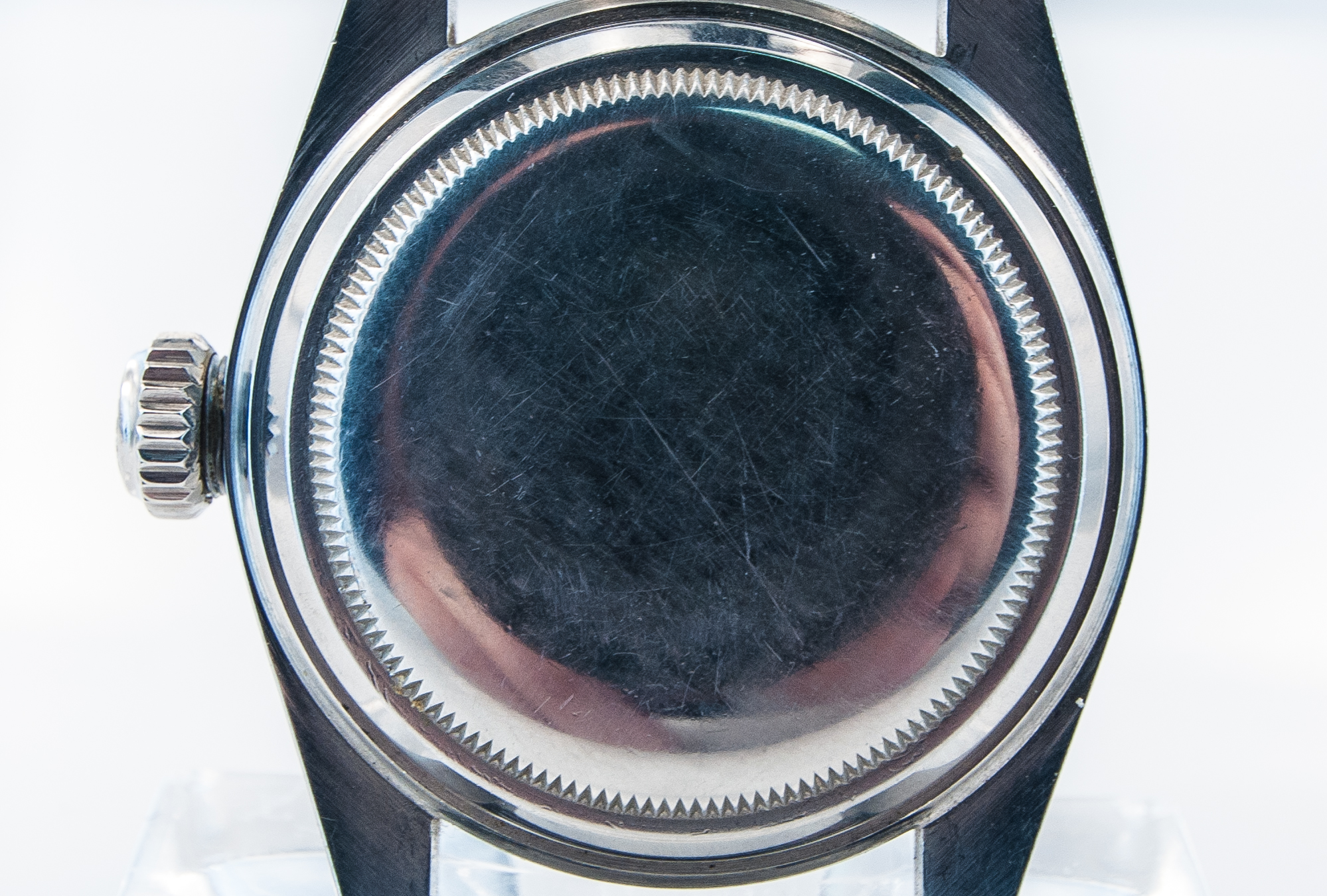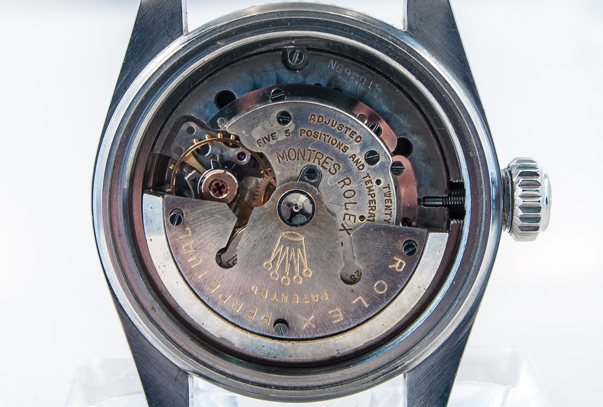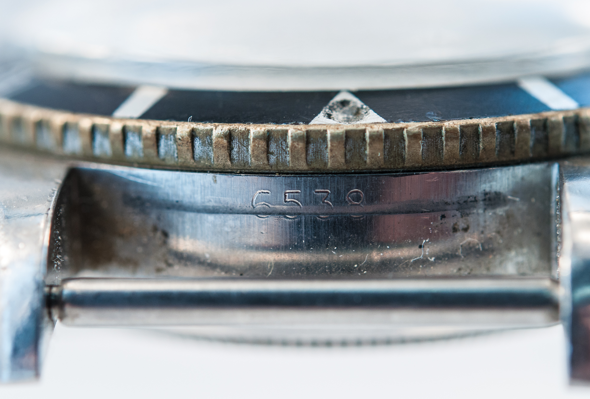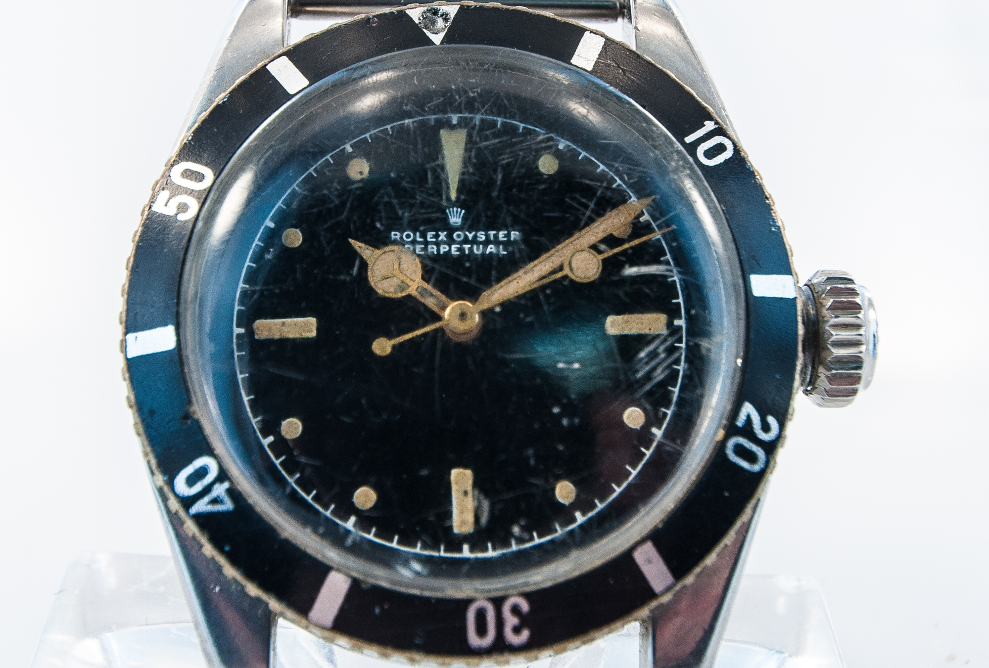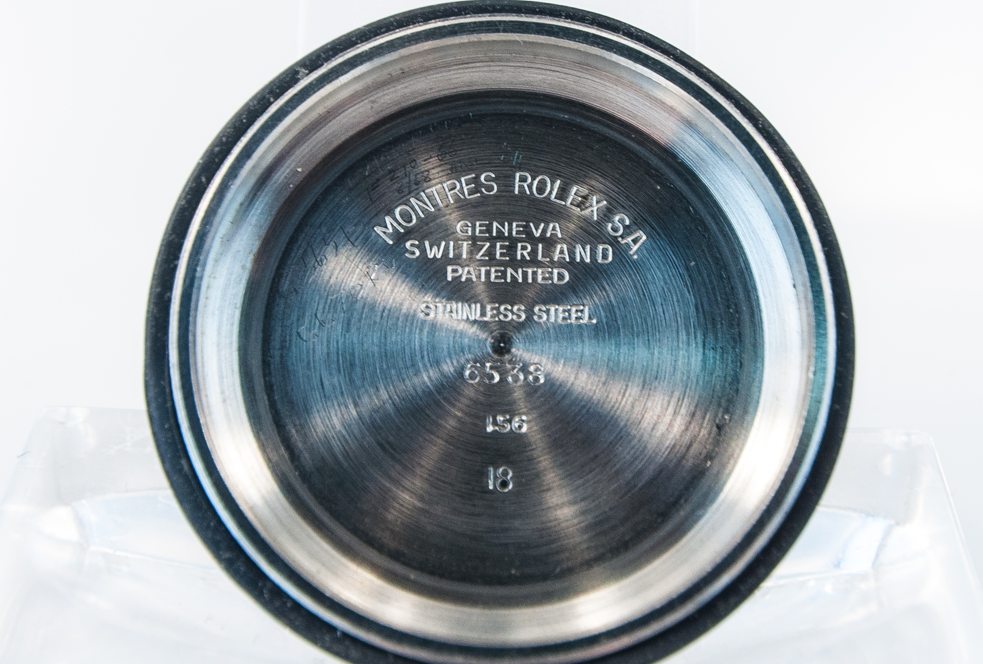MK Personal Collection The present lot is part of a larger privately held collection and is intended for exhibition purposes only. Rare Rolex James Bond Submariner Ref 6538 "Fat Font" Bezel Wristwatch Circa 1956. This fine and very rare men's wristwatch by the Rolex Watch Co is a so called "James Bond" that features an over sized steel three piece oyster case without the crown guards and over sized Rolex crown Ref 6538 Serial # 158,XXX. The watch has a Cal. 1030, rhodium-plated, 25 jewels Rolex movement with a straight-line lever escapement, monometallic balance adjusted to 5 positions and temperature, shock absorber, self-compensating Breguet balance spring that is in good running condition. It is topped with a black painted dial with dot indexes and gilt gold hands (refinished). It is stamped on the inside back cover "6538 I.56 18:. The watch is in overall very good condition. The reference 6538 was introduced in 1955, replacing the 6204 (launched the year prior alongside the 6205 and 6200). With a different movement, the caliber 1030, the case was slightly thinner and featured prominent bevels to the lugs. The crown of the 6538 was also enlarged to 8 mm, thus giving the model its nickname 'Big Crown' and differentiating it from the ref. 6536. Interesting to note that the present example features a 'fat font' bezel insert with a silver 12 o'clock triangle, and without markers for the first 15 minutes