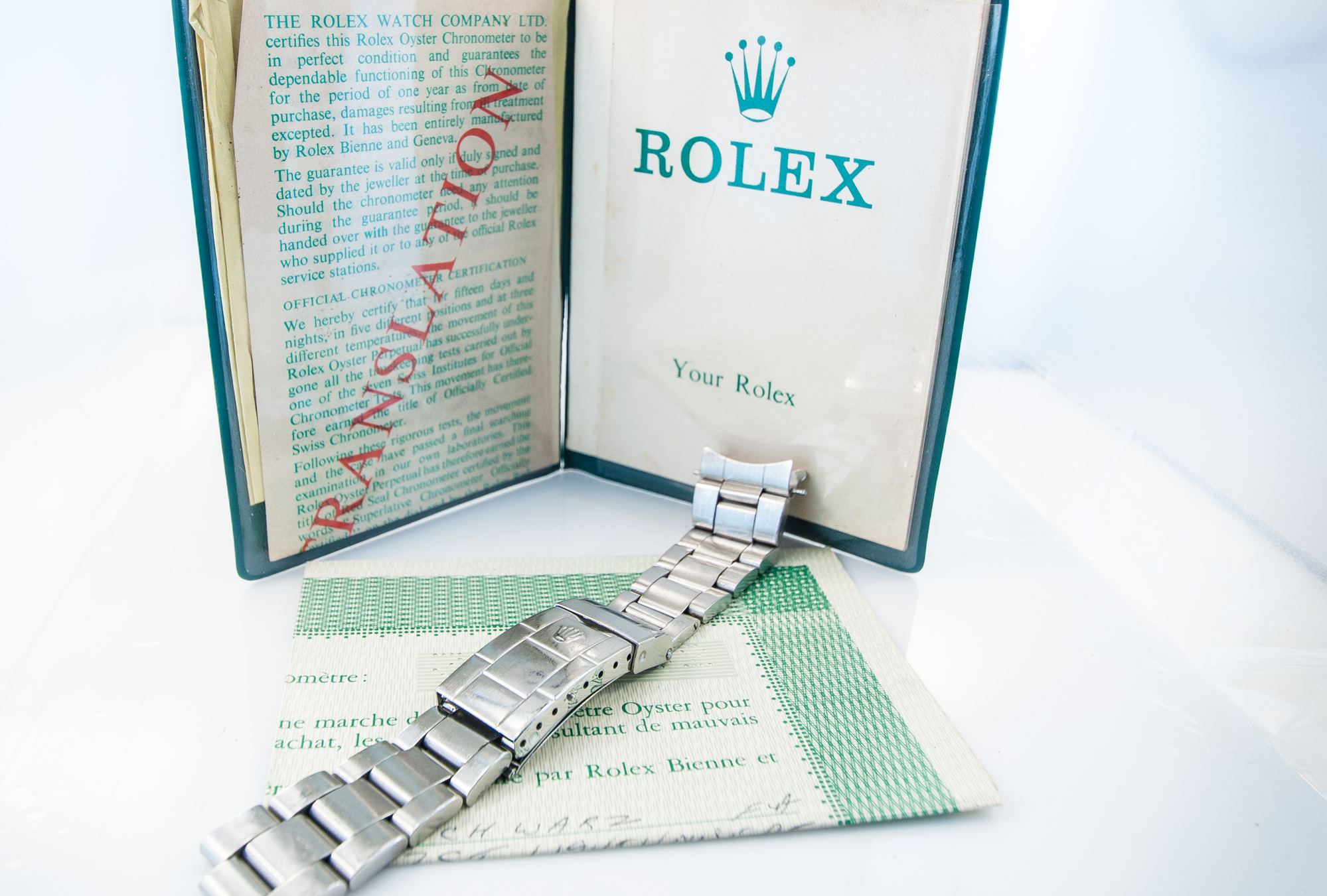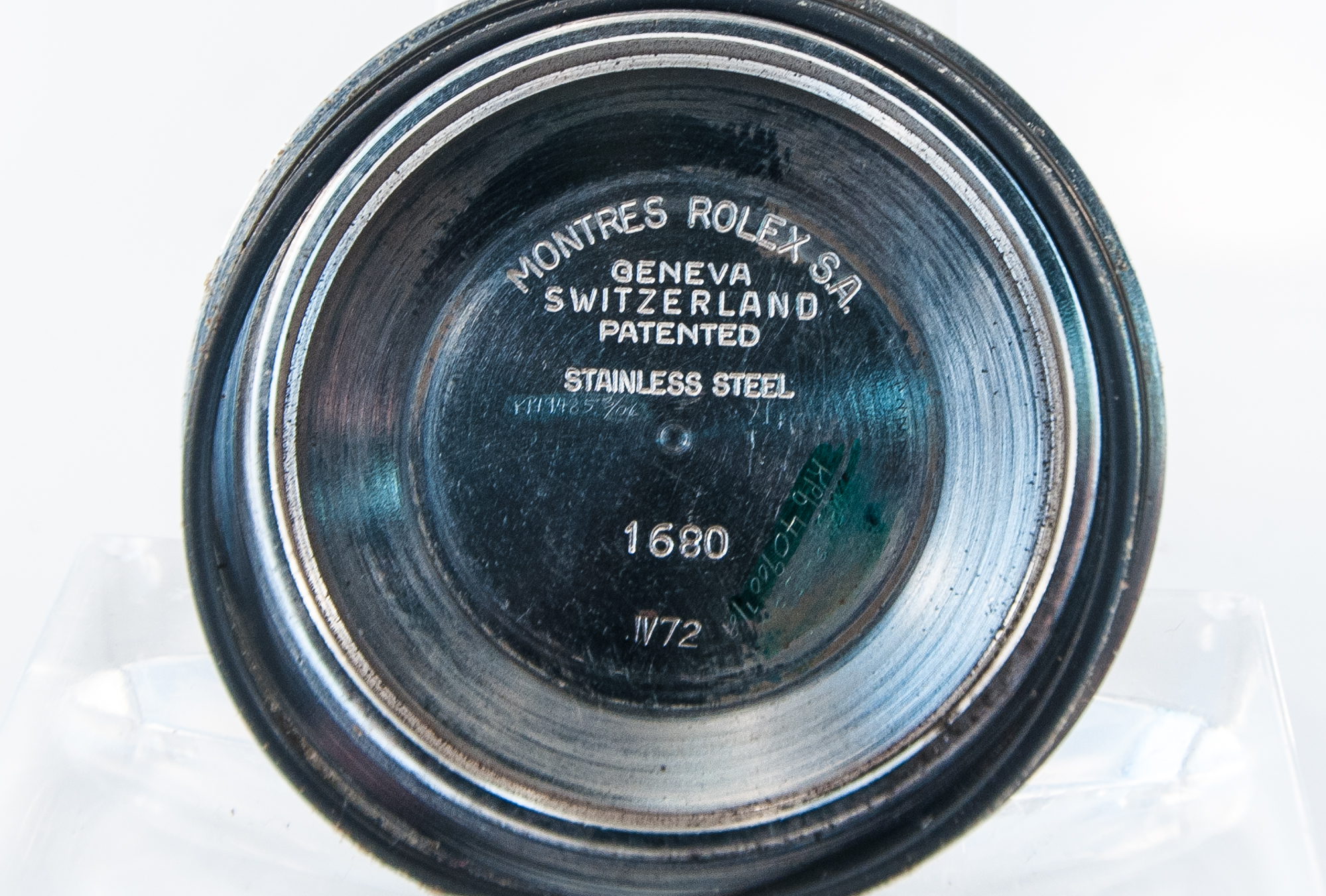 MK Personal Collection The present lot is part of a larger privately held collection and is intended for exhibition purposes only. Rolex Single Red Mark V Submariner Ref 1680 Wristwatch with Box & Papers Circa 1973. This very fine and rare Rolex Submariner Superlative Chronometer is accompanied with the original fitted box, original Rolex papers and the Submariner guarantee book. The watch features original cutout serial number paper work. You never see this model so complete it's amazing. The watch comes in a three piece steel oyster case, Ref 1680 Serial # 3.304.362, with an original black dial with luminous round, triangular and bâton indexes and luminous "skeleton" hands featuring the famous RED submariner on bottom. It has a Cal. 1570 rhodium-plated 26 jewel movement with a straight line lever escapement, monometallic balance adjusted to five positions and temperatures, shock-absorber, self-compensating Breguet balance-spring, Microstella regulating screws this is in overall excellent running condition. Introduced in 1969 the reference 1680 is the first Submariner to receive a date window, thus eventually gaining the official name the Submariner Date. The present example is known to be the "Single Red" Submariner among discerning collectors, featuring an eye-catching red line of text on the bold Submariner logo. In addition, the present example can be identified to be a MK V dial, features being the "660ft=200m" text placing feet in front of the metres, the "open 6" style 6 text.