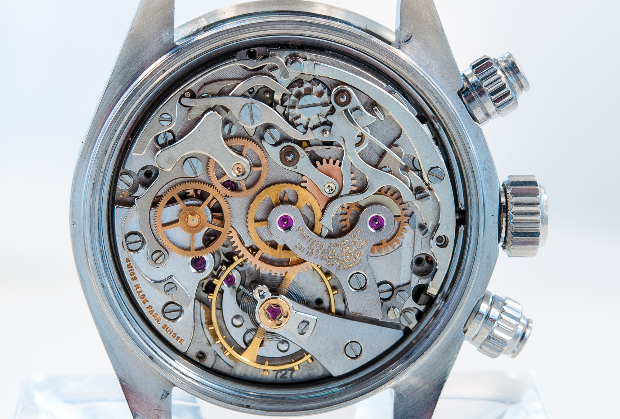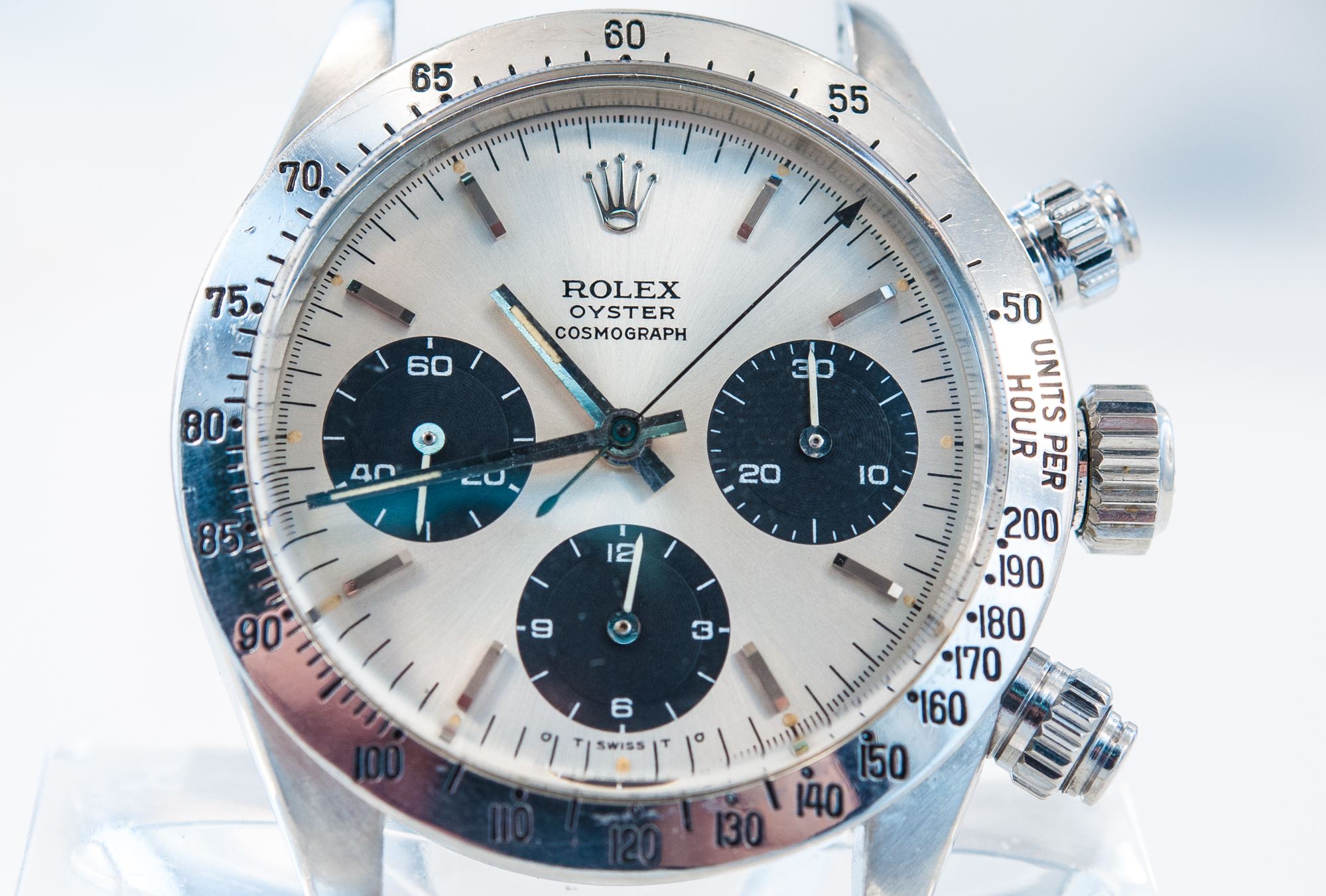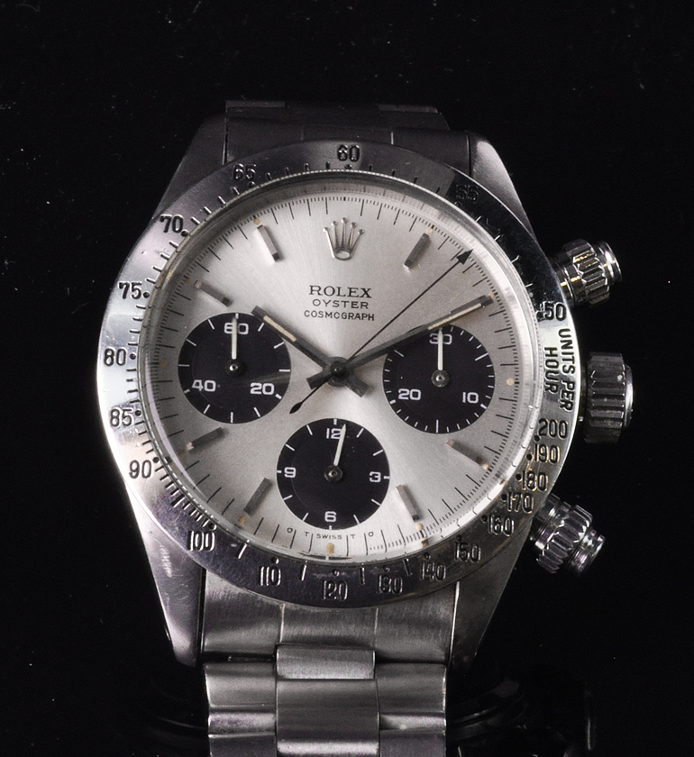 MK Personal Collection The present lot is part of a larger privately held collection and is intended for exhibition purposes only. Rare Rolex Steel Cosmograph Sigma Dial Wristwatch Ref 6263 Circa 1974. This fine men's steel Rolex Daytona Cosmograph with three-body construction case and screwed-down case back, buttons and crown Serial # 4,139,403 that measures 44.00mm x 41.00mm including the crown. The watch has a tachometer graduation on the steel bezel to 200 units per hour, bi-colored original black and silver with applied steel bâton indexes, luminous dots, outer minute/seconds track and subsidiary dials for the seconds, the 12-hour and 30-minute registers with luminous steel "bâton" hands, Rolex Cal. 727 rhodium plated 17 jewel movement with straight line lever escapement, monometallic balance adjusted to 3 positions, shock-absorber, self-compensating Breguet balance spring, microstella regulating screws. The dial, case and movement are all signed. Reference 6263 was in production - together with its metal-bezel sibling reference 6265 - since the late 1960s until 1987. The final evolution of the manual Daytona line, it is considered by many the most representative and iconic reference of the line, incorporating all the details which made the Daytona a masterpiece of design: bezel with black insert bearing a tachymetre scale, screw-down pushers, and the unmistakable Rolex Oyster case. The present version with silver dial and black sub-dials/registers has a stealth and sporty feel but also grants the timepiece an undeniably enormous aesthetic impact thanks to the black/white chromatic scheme which alternates obviously on the dial. The present example manufactured circa 1974 is a variant from the norm as it features an elegant and attractive "Sigma" dial. The "T Swiss T" signature at 6 o'clock is flanked by the Greek symbol Sigma, denoting the markers are white gold. Research shows that the "Sigma" notation appeared on Rolex dials in the early 1970s, following the issue of a set of guidelines by APRIOR (Association pour la promotion industrielle de lor: Association for the industrial promotion of gold). Such guidelines indeed suggested (but it was not compulsory, hence not all dials with gold bear the sigma) to add the Greek letter sigma to the dial of watches bearing gold details (such as the markers, in this case). Possibly due to the very cryptic nature of this designation, it was abandoned after a few years.