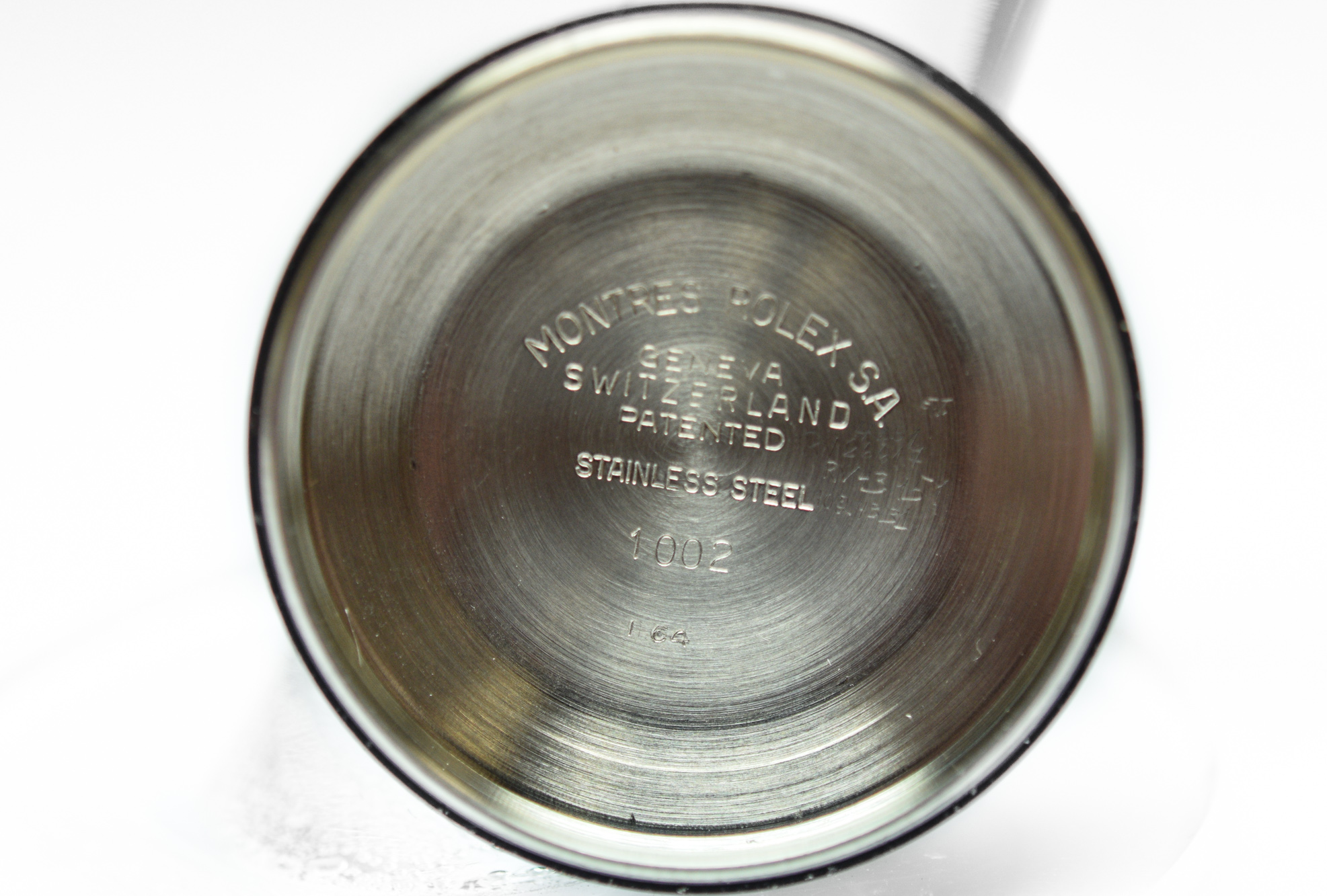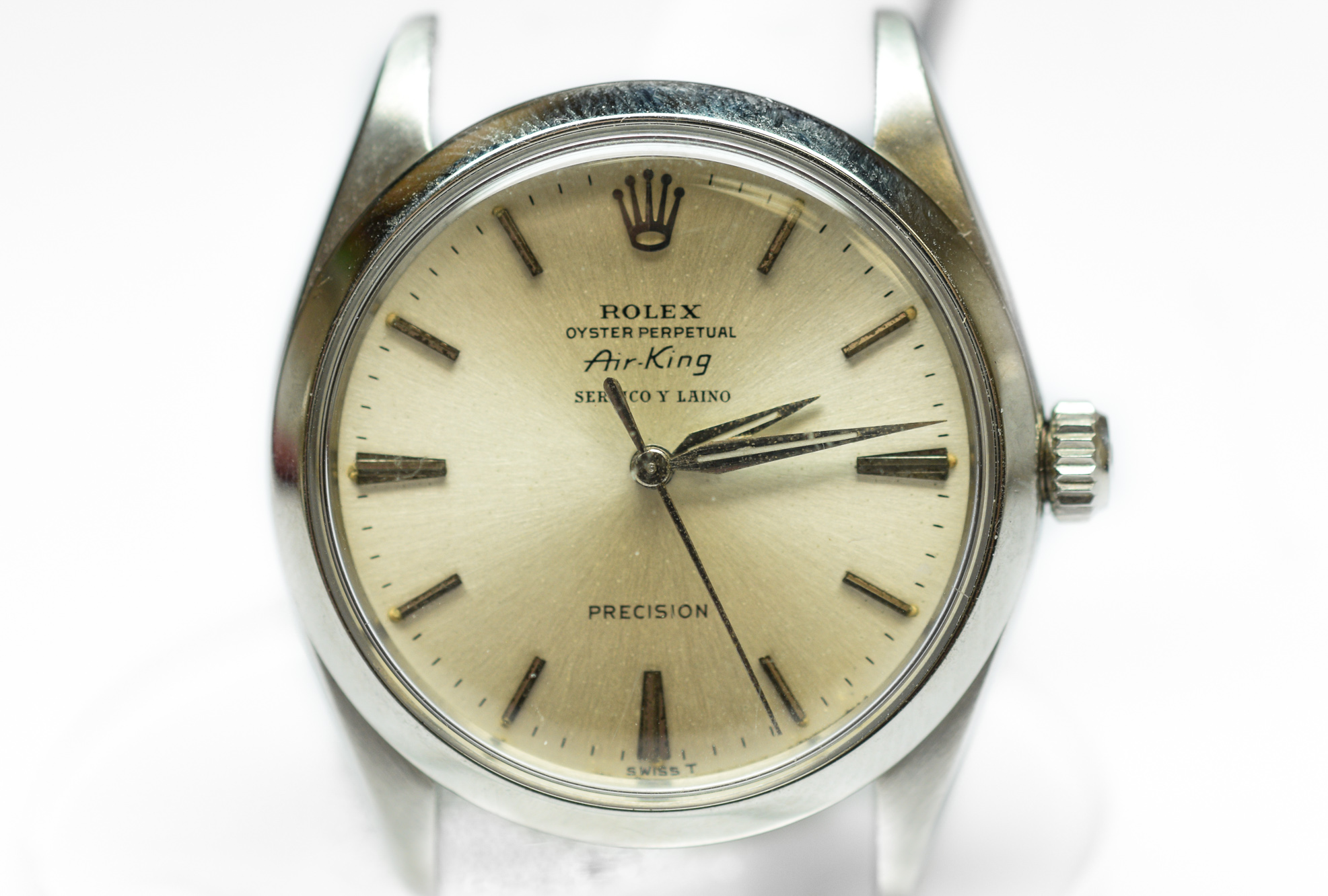 MK Personal Collection Rare Steel Rolex Oyster Perpetual Air King "Serpico Y Laino" Ref 5500 Wristwatch Circa 1964. This is a fine and rare men's steel wristwatch by the Rolex Watch Co so called Air-King in a three piece steel case Ref 5500 Serial #1.024.331. it features a Cal. 1530 Rolex movement with 25 jewels, lever escapement monometallic, self-compensating flat balance spring that is in running condition. The watch does need an overhaul. It is stamped on the inside back cover 1002 I.64, as well as S & L Agero. It is topped with an original silver painted dial with steel stick indexes. It is signed Air-King Serpico Y Laino. The watch is in overall good condition.