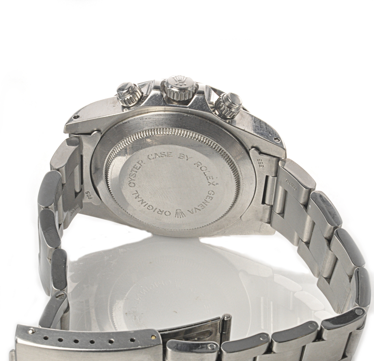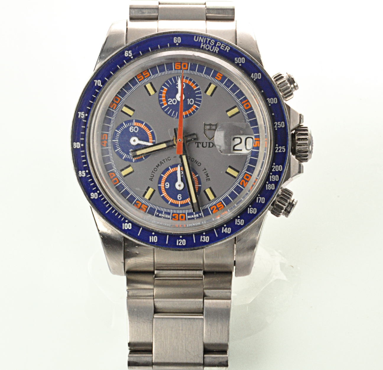 MK Personal Collection The present lot is part of a larger privately held collection and is intended for exhibition purposes only. Rare Tudor Big Block / Big Blue Tudor Chronograph Wristwatch Ref 79160 Circa 1980's. The watch has a three-body, polished and brushed, screwed-down case back, crown and buttons, black bezel with tachometer graduation to 500 UPH, Triplock winding crown protected by the crown guard, crystal with cyclops lens Serial # B440.784. High grade Swiss Automatic chronograph movement Cal 7750 rhodium-plated, 17 jewels, Glucydur balance, cam type fine adjusting device, shock protection for balance in good running condition topped with a original, Dial with applied steel baton indexes and luminous dots, outer 1/5th seconds scale, subsidiary dials for the seconds, the 30-minute and 12-hour registers, aperture for the date at three o'clock, high grade swiss . As you can see from the photos the watch is in overall very good condition.