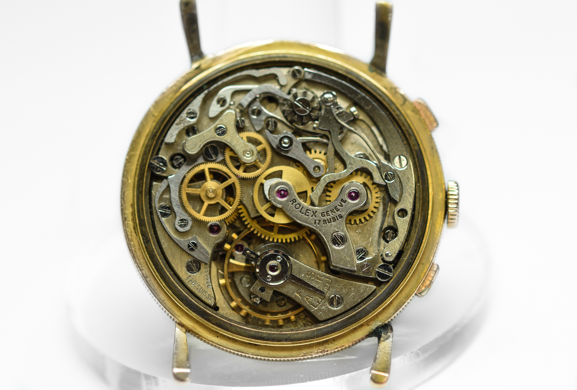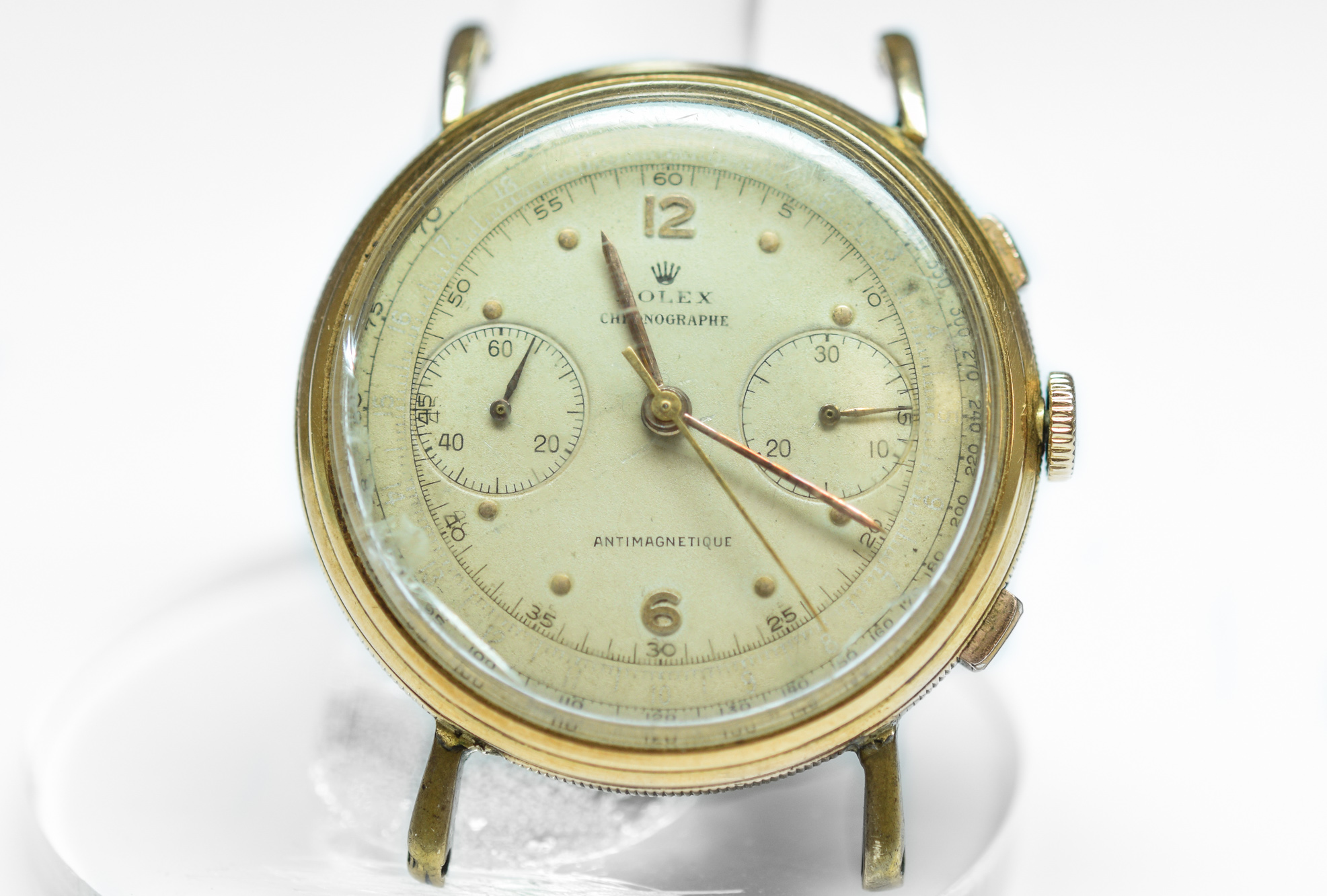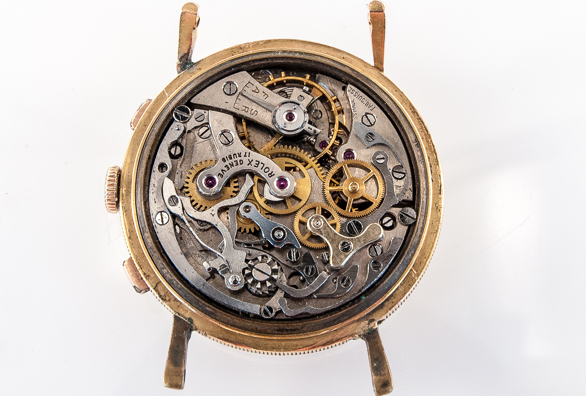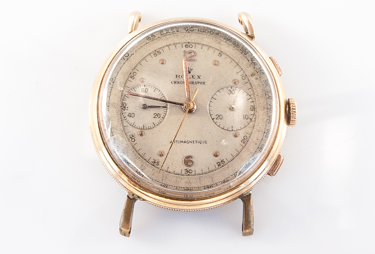MK Personal Collection This watch is part of a larger privately held collection and is intended for exhibition purposes only. Rolex 18k "Coin Edge" Anti Magnetic Chronograph Wristwatch Ref 4062 Circa 1950's. This very rare and fine men's Rolex Anti-Magnetic Chronograph wristwatch comes in a three-body 18k pink gold case construction case with a coin-edge band and thin teardrop lugs, sloped bezel and snap-on back featuring a rare Rolex chronograph Cal. 23 rhodium-plated, 17 jewel movement with a straight line lever escapement, monometallic balance, self-compensating Breguet balance-spring and index regulator topped with a original white painted dial with applied pink gold dot and Arabic 6/12 indexes, outer minute/seconds divisions with Arabic five minutes/ seconds, subsidiary seconds and 30-minute register dials, outer tachometer and telemeter scales. The watch is in overall very good condition. The Rolex Anti-Magnetic chronograph ref. 4062 was introduced to the market in the early 1940’s bearing a design that perfectly reflects the exciting era for chronograph timepieces, the reference was discontinued in 1963. Admired for featuring unusual coin-edged casebands and the side of the lugs, some examples featured a satin finished caseband referenced 4062L with “L” meaning “Lisse” (French for “smooth”).
