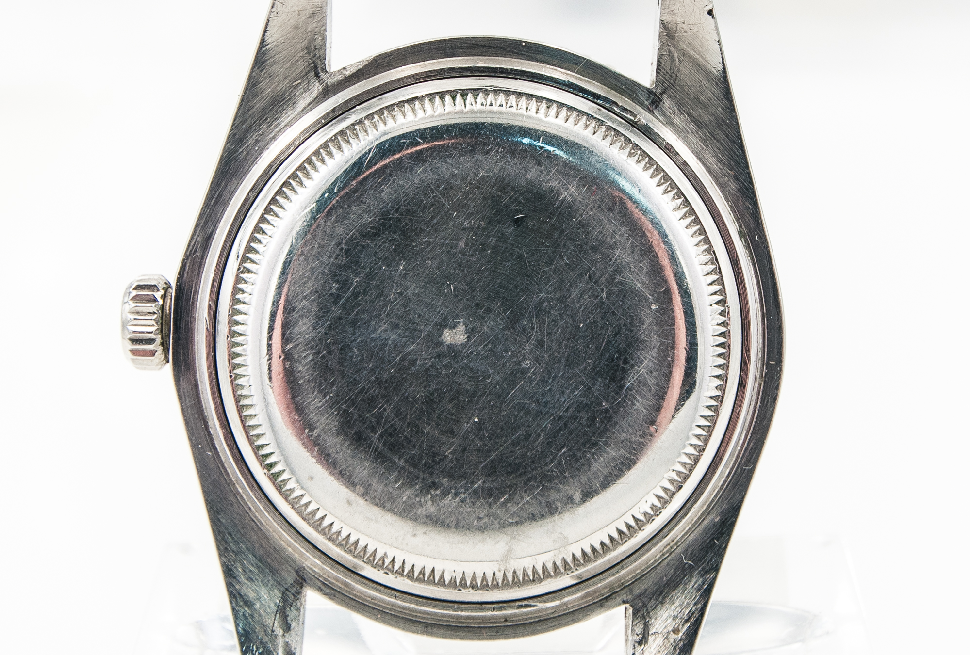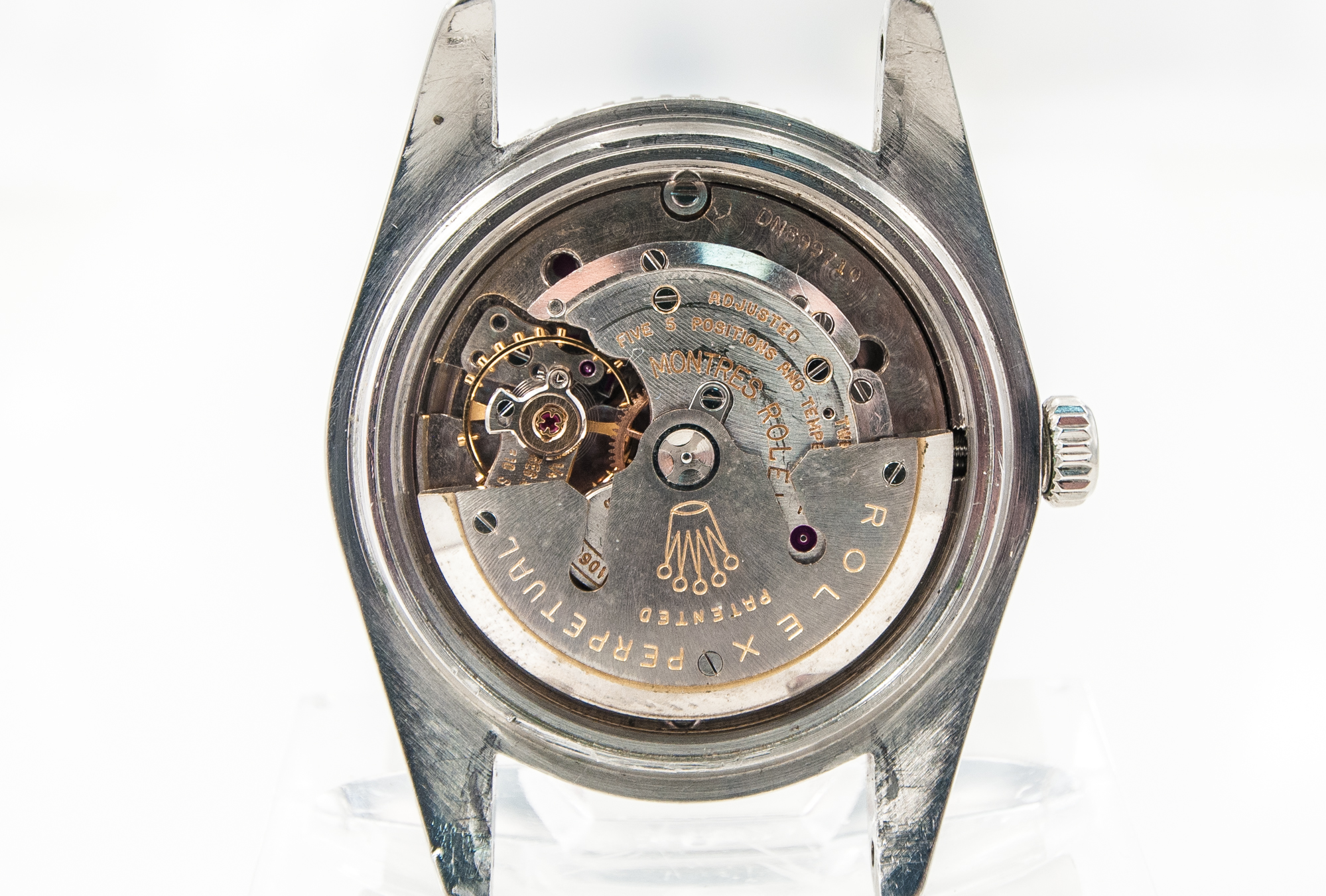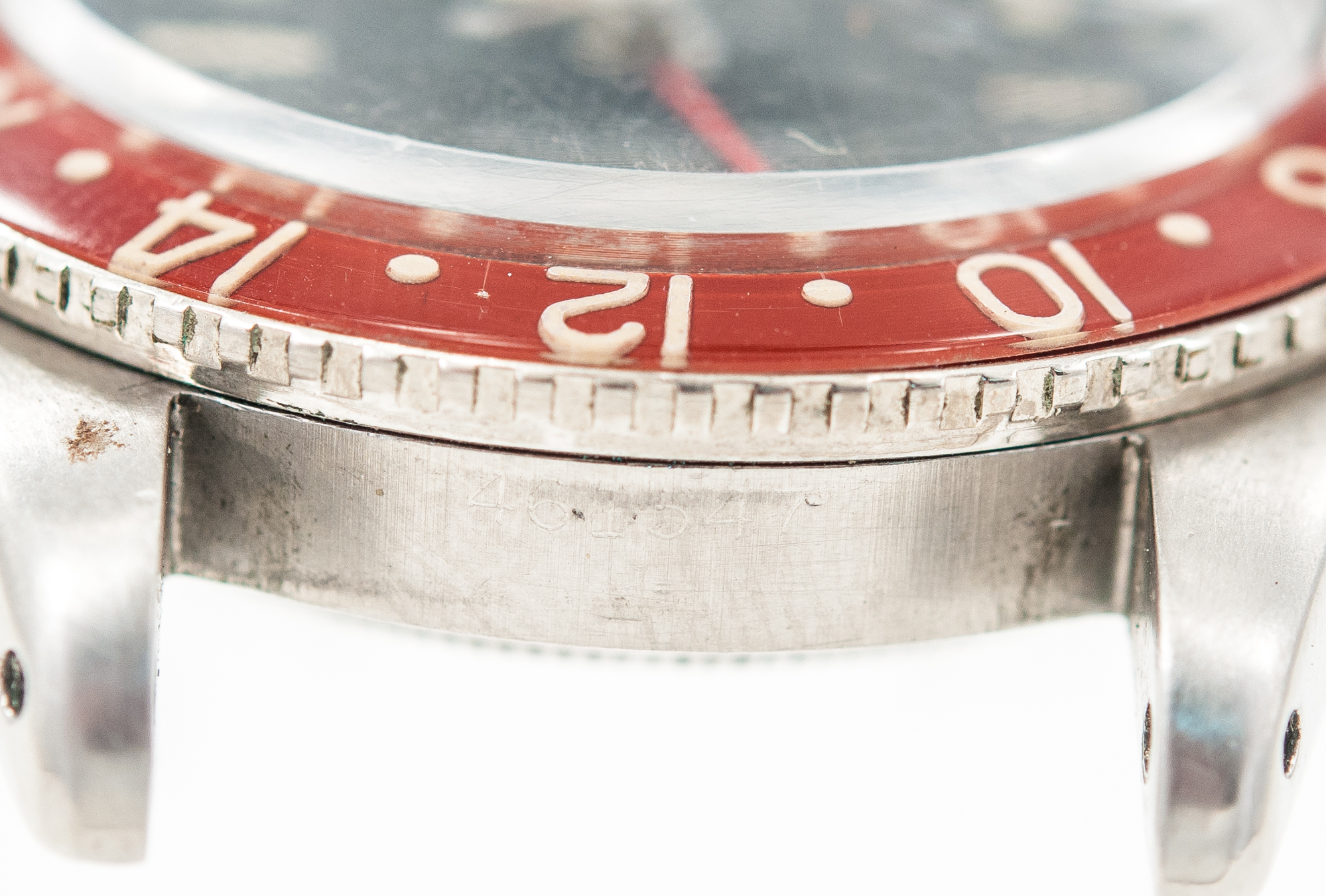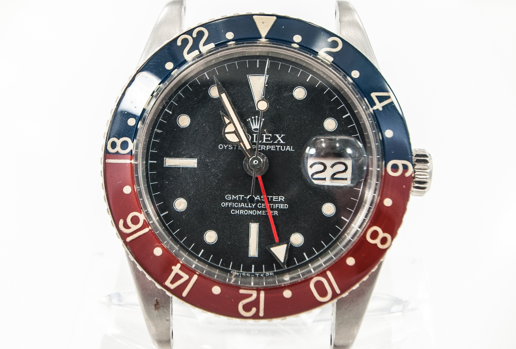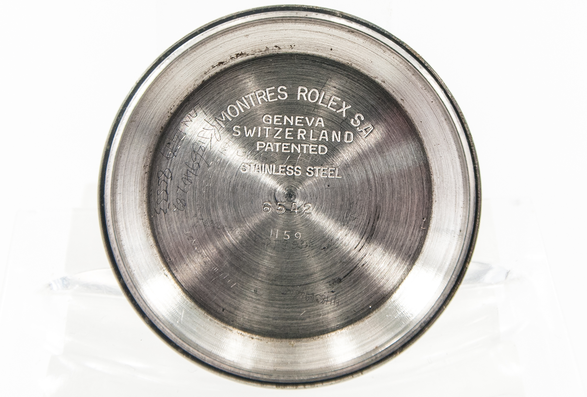 MK Personal Collection The present lot is part of a larger privately held collection and is intended for exhibition purposes only. Steel Sports Model Rolex GMT Master Ref 6542 No Crown Guard Wristwatch Circa 1959. This is a super rare watch Ref 6542 Serial #461.547 in a three-body construction screwed-down case back and crown, red and black graduated revolving bezel for the second timezone in 24 hours, crystal with "cyclops" lens. It has a mint original black dial with white gold writing and radium-coated round, triangular and bâton indexes, aperture for the date, "skeleton" radium-coated hands Cal. 1066 with a rhodium-plated 25 jewel movement, straight line lever escapement, monometallic balance adjusted to temperatures and 5 positions, shock-absorber, self-compensating Breguet balance-spring Serial #DN899.710. The immense popularity of the Rolex GMT-Master series to this day is a testament to the timeless design of the reference that started it all, the reference 6542. Widely considered the "Unicorn" of the GMT-Masters, the reference started production in 1955 and was only manufactured for 4 years, the model being discontinued in 1959. The reference is based in the mid-century glamour of air travel, having been originally designed for Pan Am pilots during the golden age of flight. It was then lifted to further accolade adorning the wrist of Honor Blackman’s Pussy Galore in James Bond, Goldfinger released in 1964.