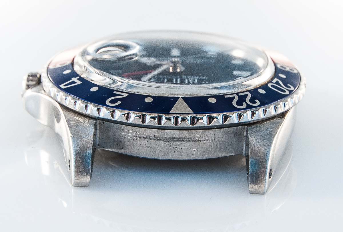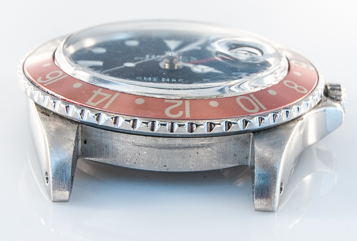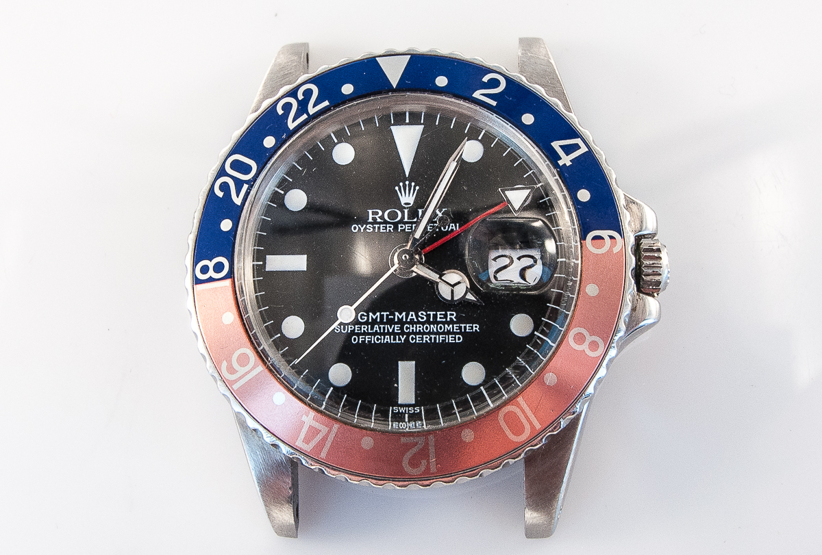 MK Personal Collection The present lot is part of a larger privately held collection and is intended for exhibition purposes only. Rolex GMT Master Steel Wristwatch Ref 1675 Circa 1979 with Box and Papers. This is a vintage Rolex GMT Master Ref 1675 from 1979 so called Pepsi Cola because of the red and blue bezel. It comes in a three piece steel oyster case with a screw down waterproof back Ref 1675, Serial # 5.631.551 measuring 47.00mm x 42.00mm including the crown guards. It is attached to a steel oyster Rolex band # 580 78360 that measures 8". The watch has a Cal. 1570 rhodium-plated Rolex movement with 26 jewels, straight line lever escapement, monometallic balance adjusted to temperatures and 5 positions, shock-absorber, self-compensating free-sprung Breguet balance spring and Microstella regulating screws. The watch needs a complete overhaul and the rotor is loose. It is topped with a GMT Master black dial and date widow at 3:00 o'clock. As you can see from the photos the watch is in overall very good original condition. It is accompanied with the original fitted box and papers.