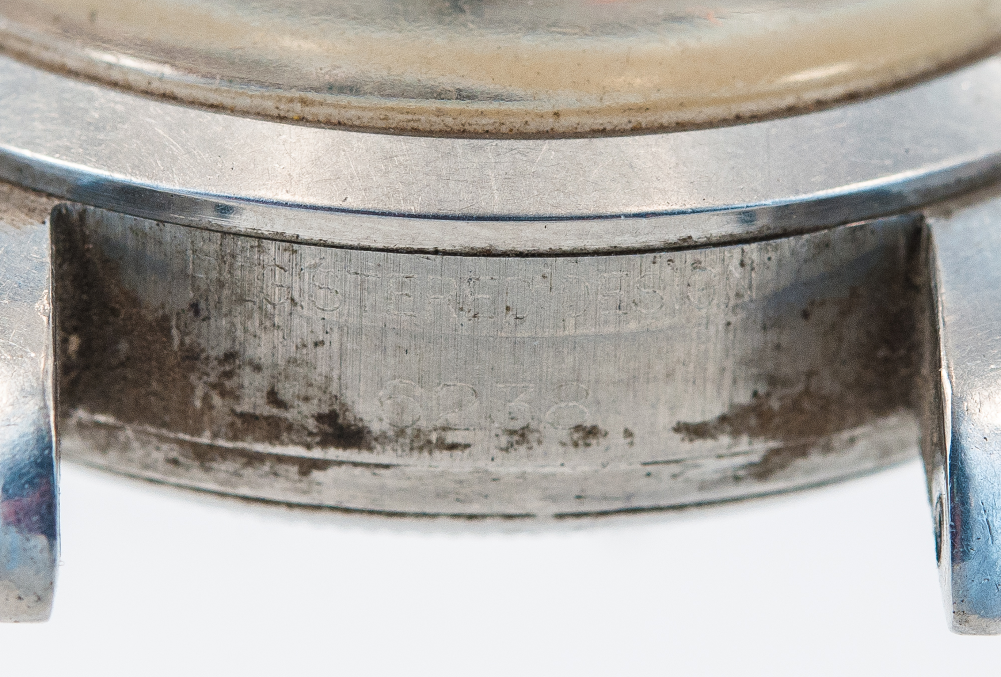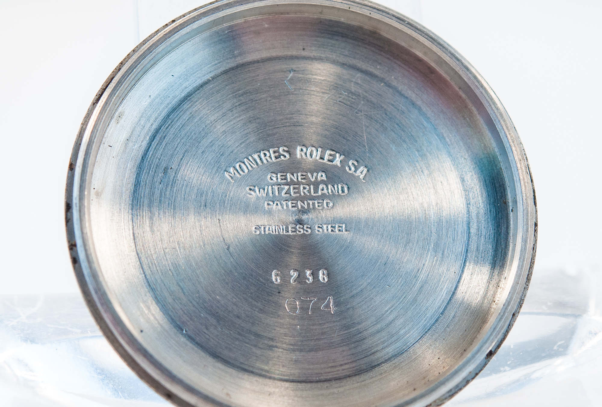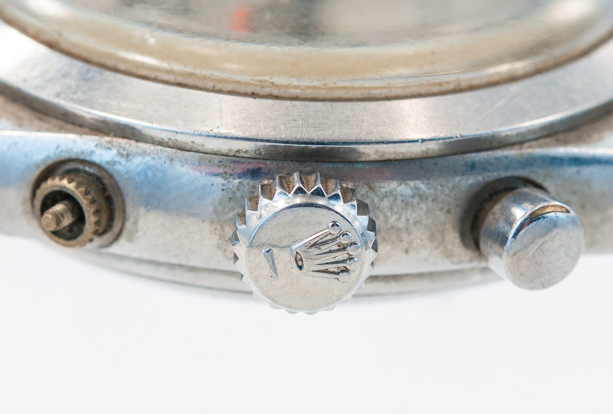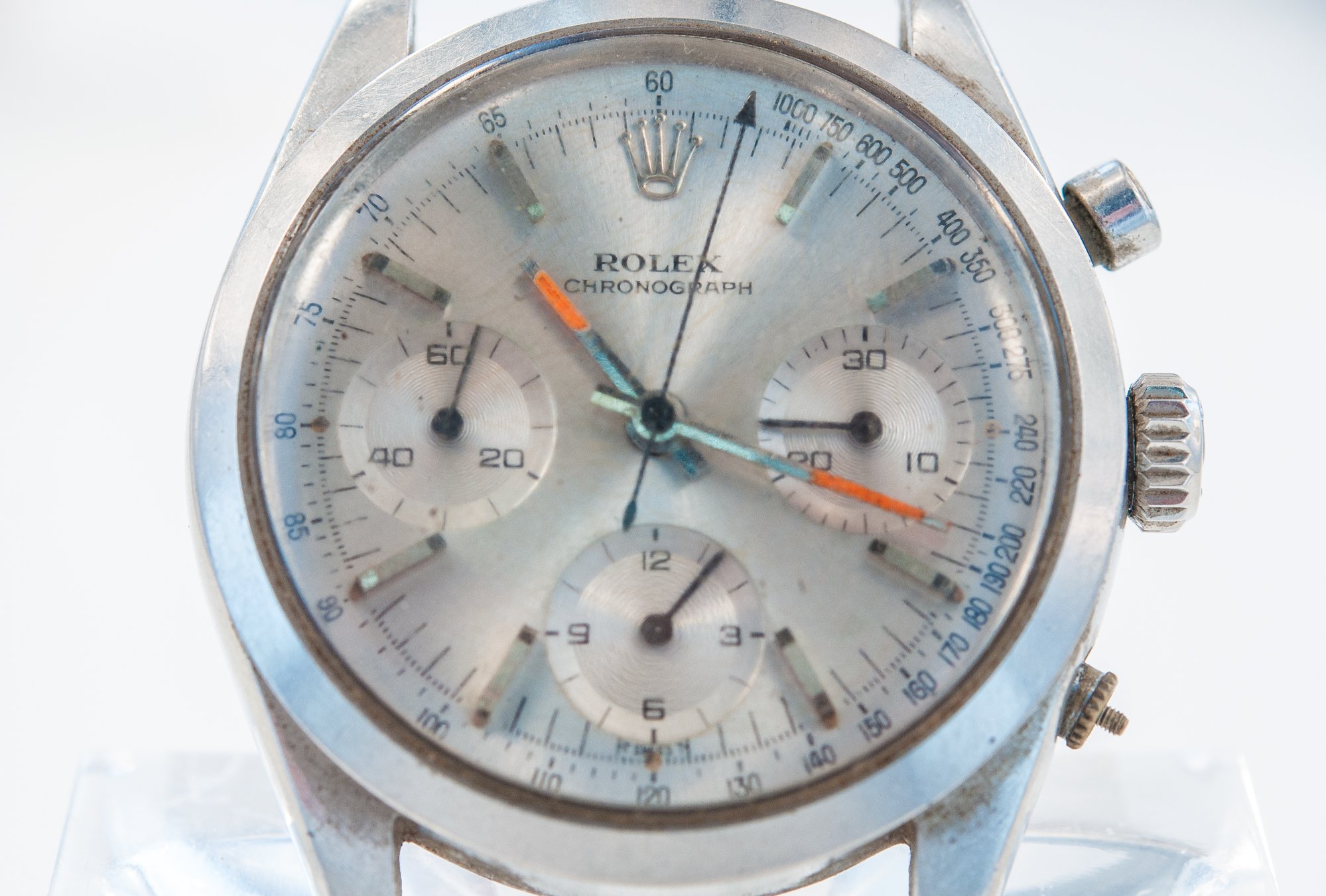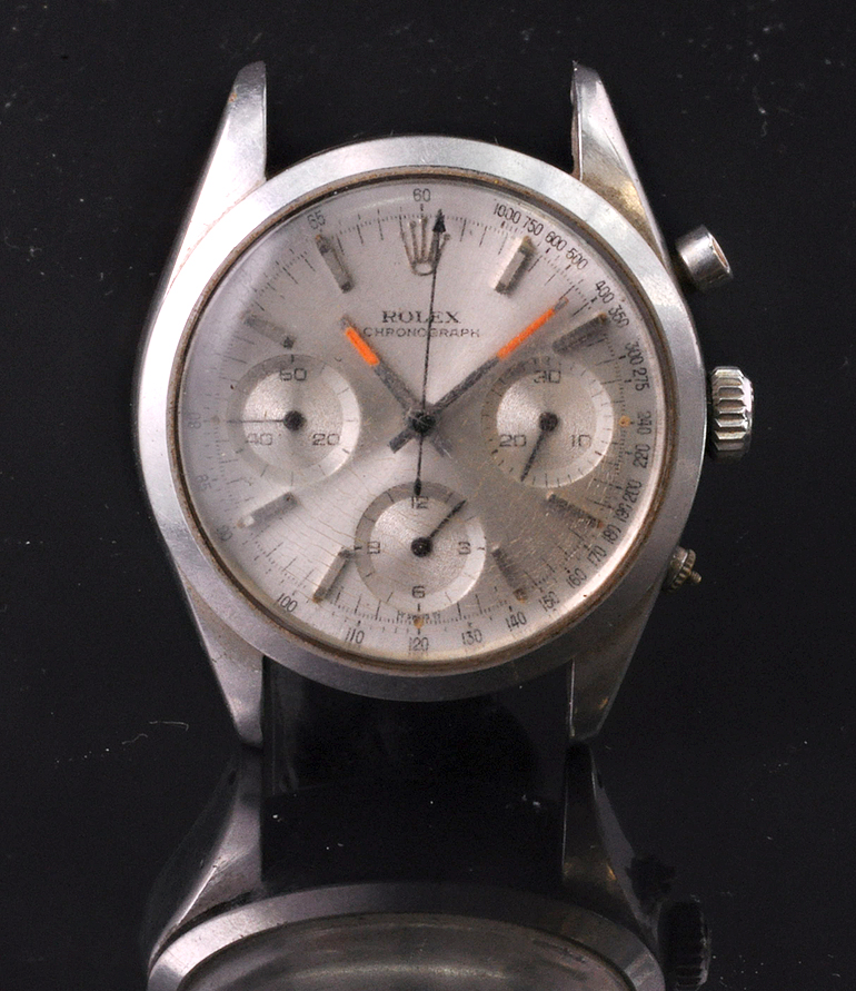 MK Personal Collection The present lot is part of a larger privately held collection and is intended for exhibition purposes only. Rolex Ref 6238 Pre Daytona Oyster Chronograph Wristwatch "Fuerza Aerea del Peru" Circa 1966. This very fine men's steel Rolex Cosmograph Pre "Daytona" has a three body construction case and screwed down dedicated case back engraved "Fuerza Aerea del Peru" Peruvian Air Force Serial #1,104,XXX. The watch has the original silver painted dial with applied steel baton indexes and luminous dots, subsidiary dials for the seconds, the 12-hour and 30 minute registers, outer tachmometer scale, luminous steel baton hands, Cal 72B Rolex Chronograph movement with rhodium plated 17 jewels, straight line lever escapement, monometallic balance, shock absorber, self compensating free spring Breguet balance spring. The watch is in overall good condition. It just needs a polish. Produced from approximately 1960 to 1967, the Rolex reference 6238 is a perfect embodiment of the timeless chronograph. Referred to as the Pre-Daytona by collectors, the reference 6238 shares similar case size, pushers and baton hands as its contemporary, the first Cosmograph Daytona reference 6239. However, while the Cosmograph Daytona always features a two tone dial with either black with silver sub dials or vice versa, the reference 6238 was offered only with a monochromatic dial. Marking the end of an era, the 6238 was also the last Rolex chronograph to feature a smooth bezel and a graduated tachymeter scale printed on the dial. Rolexs later Daytona models would all display the scale on the bezel.