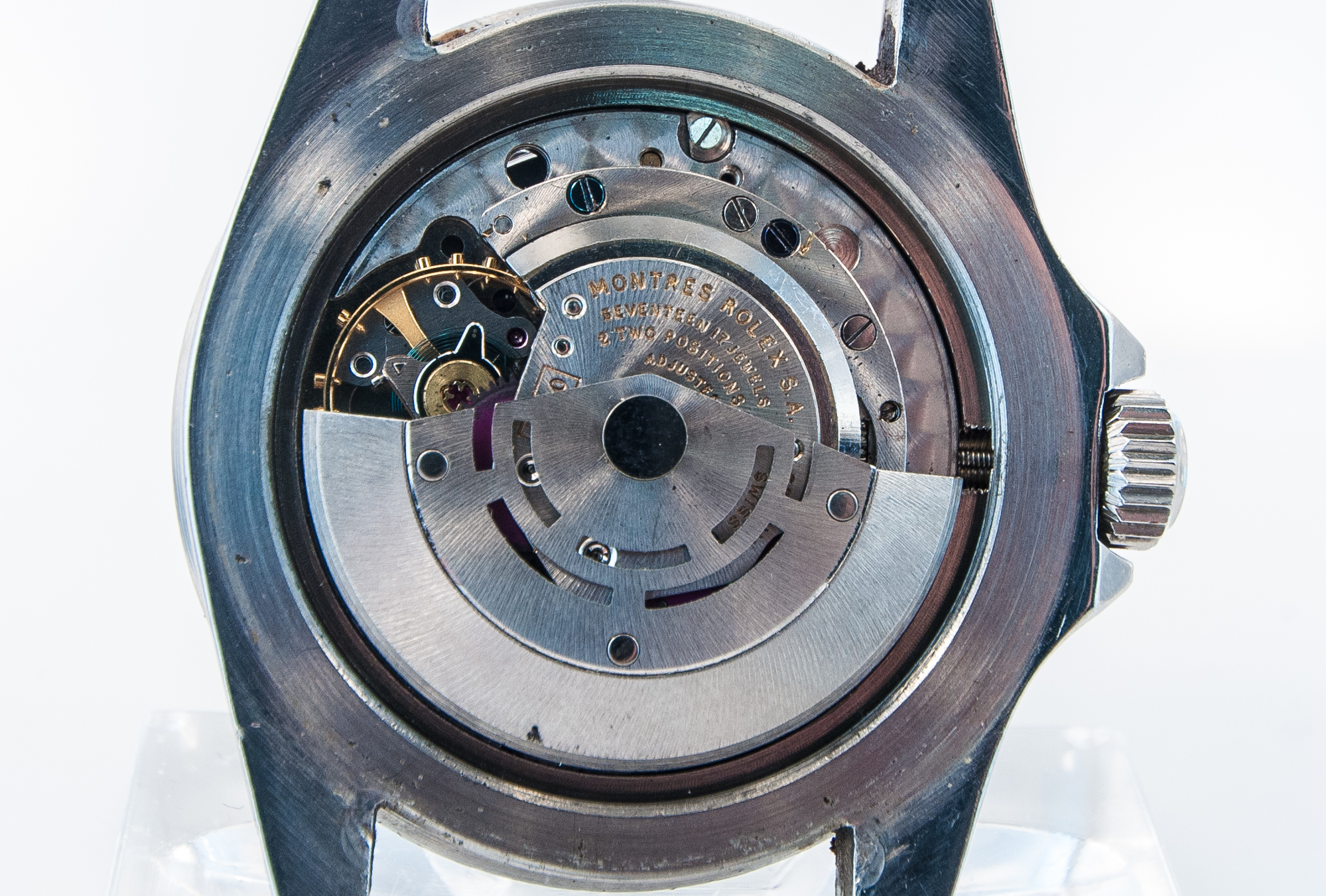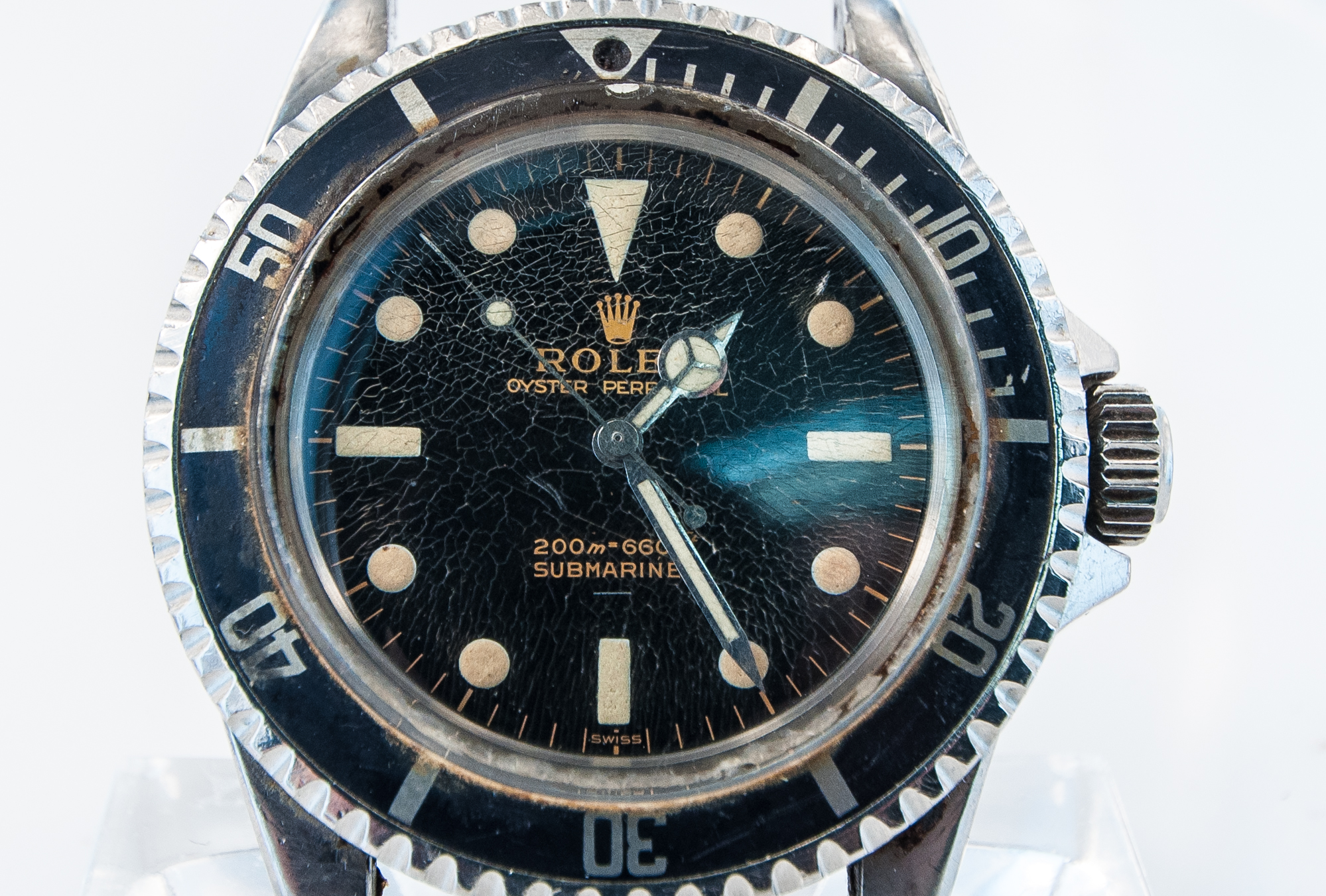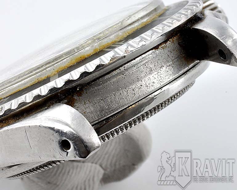 MK Personal Collection The present lot is part of a larger privately held collection and is intended for exhibition purposes only. Super Rare This is a super rare First Series Pointed Crown Guard Rolex 5513 Submariner Underline Gilt Dial Wristwatch. It features a three piece steel oyster case and it is stamped on the inside back cover "Rolex 5513 III.63, Serial #1.024.XXX". It has a high grade Swiss Rolex movement featuring a Cal. 1530, rhodium-plated, "oeil-de-perdrix" decoration Rolex movement with 17 jewels, straight line lever escapement, monometallic balance adjusted to temperatures and five positions, shock-absorber, self-compensating free-spring Breguet balance-spring and Microstella regulating screws that is in running condition. It does need an overhaul and a crown adjustment. It is topped with a rare and exotic original black glossy dial with gold (gild) coated lettering making it even more rare and unusual. It has a round, triangular and bâton indexes, outer minute divisions. Introduced in 1962, the Rolex Submariner ref. 5513 and 5512 were the first Submariner models to feature crown guards, which gave the timepiece a completely different appeal whilst enhancing its robustness at the same time. Early examples of the reference were fitted with glossy lacquered dials with a short production span of approximately four years. In 1967, Rolex replaced its glossy lacquered dials with the more common matte dial. Admired and praised by collectors, these early examples are highly sought after and rare with varying dial examples commanding more than others. The present Rolex Submariner ref. 5513 certainly belongs to one of the rarer examples, as it features two elements that separates itself from its later peers, bearing a Swiss only underline dial and pointed crown guards. Exceedingly rare, pointed crown guards were only featured in the first year of production from 1962 to 1963. Furthermore, early examples of the reference featured an underline either below OYSTER PERPETUAL or under SUBMARINER. Believed by enthusiasts and aficionados of Rolex timepieces, the underline on the dial signifies the use of Tritium for the luminous material on the dial.