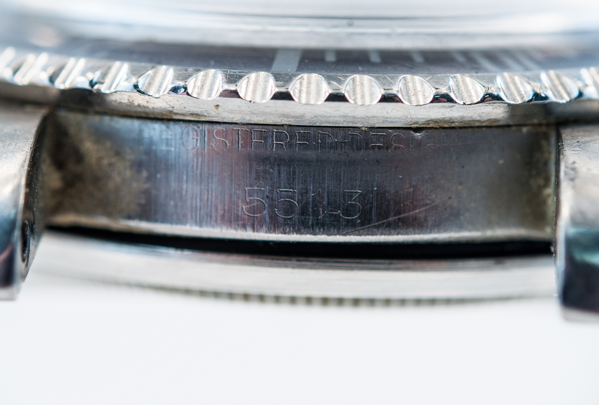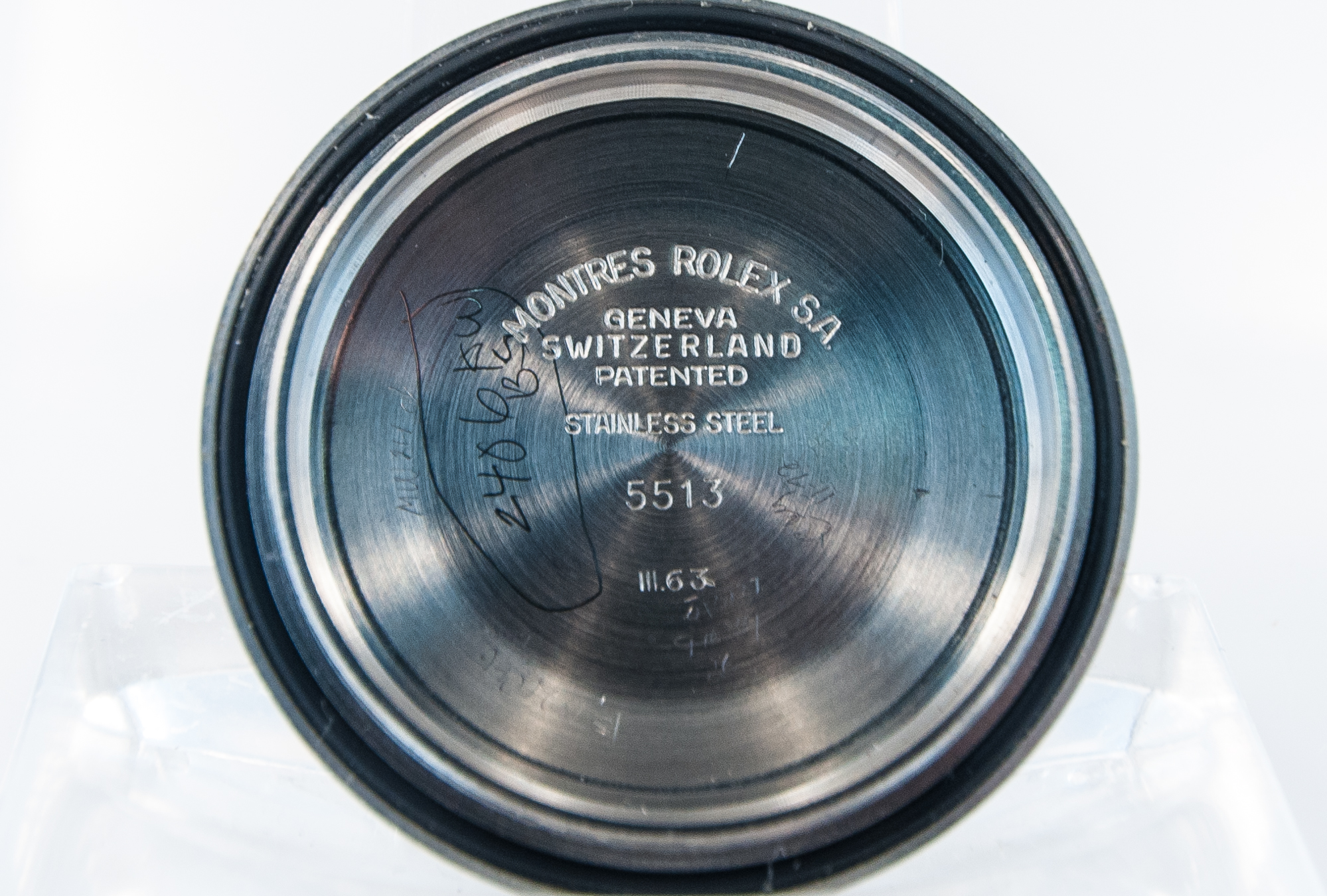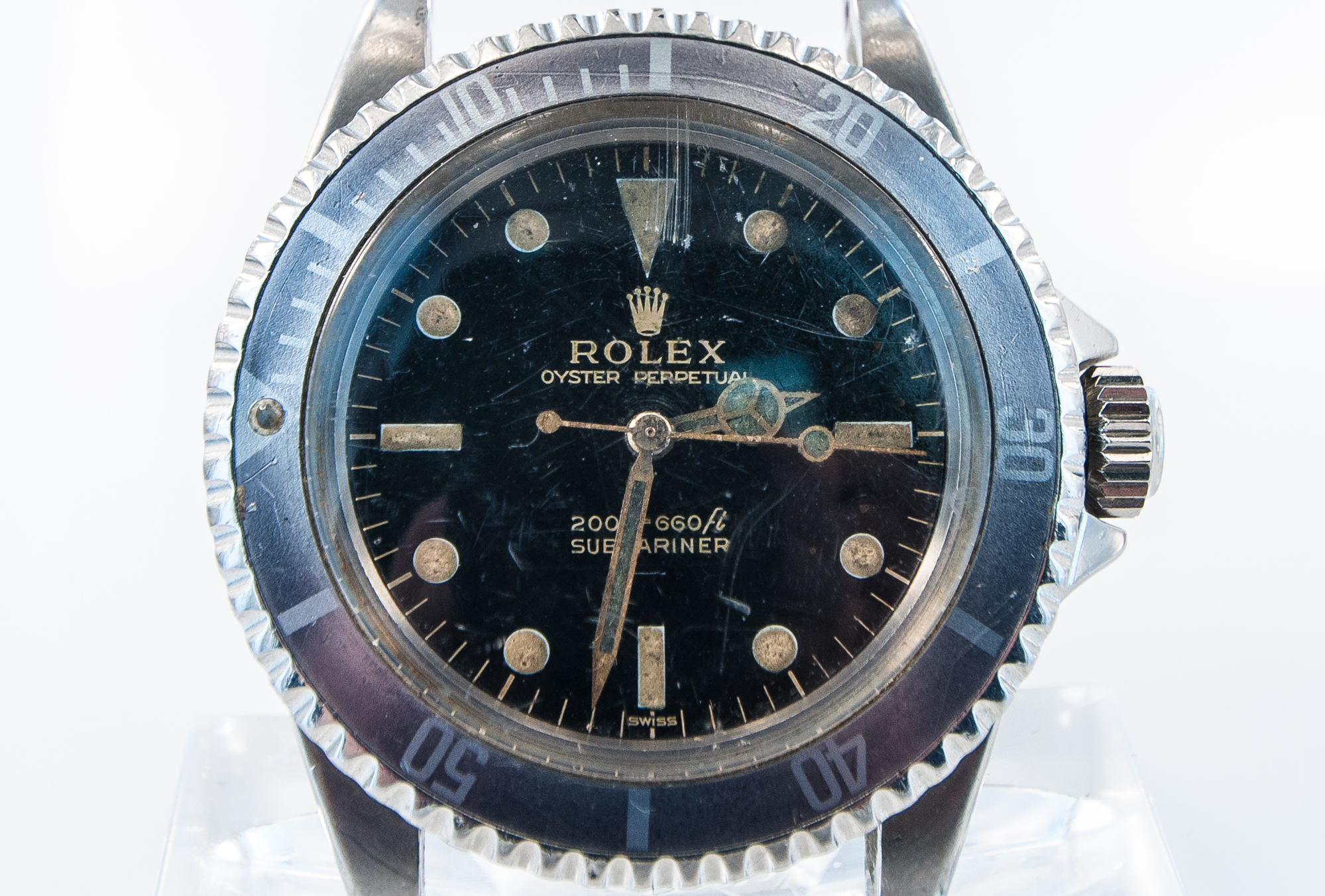 MK Personal Collection The present lot is part of a larger privately held collection and is intended for exhibition purposes only. Super Rare Gilt Underline Dial Rolex Submariner Ref 5513 Pointed Crown Wristwatch Circa 1963. This is one of the rarest Rolex watches made. It features a Submariner Ref 5513 with pointed crown guards Serial # 1.011,564 Ref 5513 stamped on inside back 5513 III.63. It features a Cal. 1530, rhodium-plated, "oeil-de-perdrix" decoration Rolex movement with 26 jewels. It has a straight line lever escapement, monometallic balance adjusted to temperatures and five positions, shock-absorber, self-compensating free-spring Breguet balance-spring and microstella regulating screws that is in running condition. The watch does need an overhaul and crown adjustment. It is topped with a rare and exotic original black glossy dial with gold (gild) coated lettering which makes it even more rare, the unusual underline. It has a round, triangular and bâton indexes, outer minute divisions. The dial is outrageous and the watch is all original. The Rolex Submariner reference 5513 was introduced in 1962 and its production was carried on for 28 years, making it one of the longest-lasting Submariner references in Rolex history. The 5513 was retailed alongside its sister reference 5512, a Chronometer certified 4-line Submariner introduced in 1959. The reference 5513 was progressively improved over the course of its life, starting with matte dials and transitioning to glossy dials.