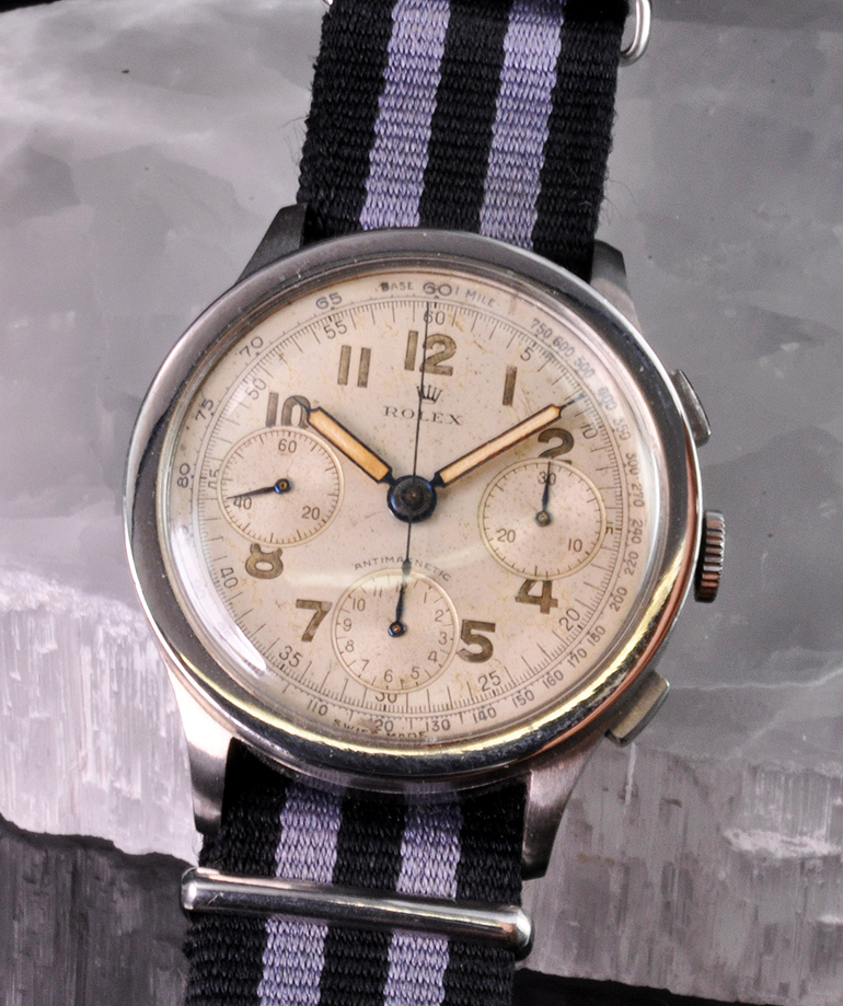 MK Personal Collection Super Rare Jumbo Steel Rolex Anti-Magnetic Flat Button Chronograph Wristwatch Ref 3330 Circa 1940’s