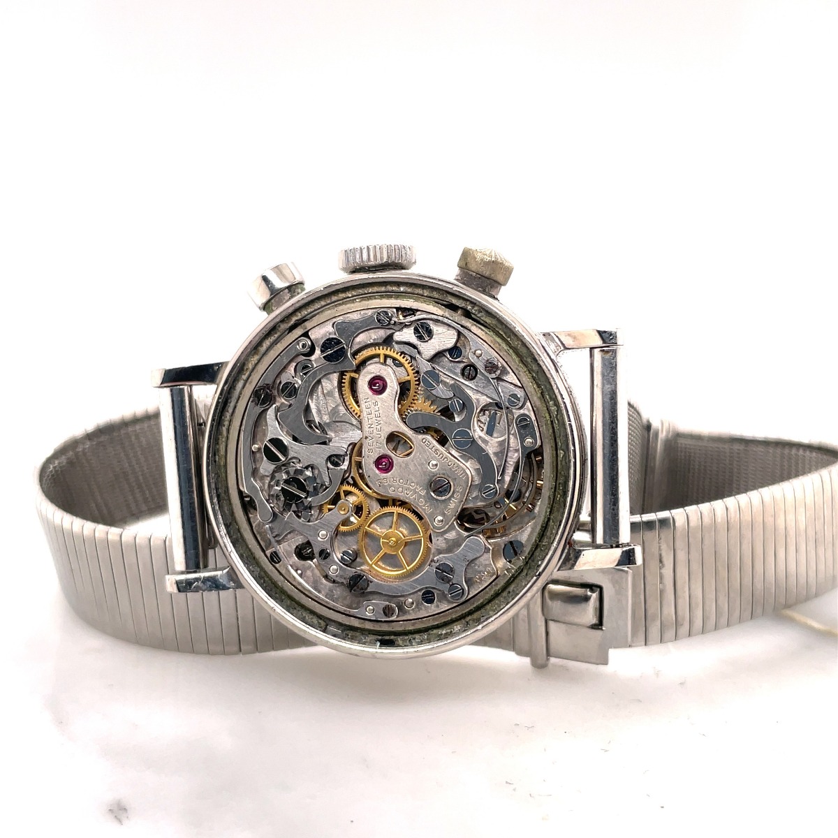 MK Personal Collection Super Rare Movado Ref 98159 Original Dial Chronograph Wristwatch with Francois Borgel Waterproof Steel Case Circa 1940. The watch features a two piece circular case signed on the inside back cover Movado with FB Makers Marks (Francois Borgel). It measures 35.50mm including the crown and pushers and 32.50mm without, 40.50mm in length lug to lug, 12.50mm thick. The watch has round waterproof pushers Serial # 98.159 and a high grade Swiss Movado Cal. 90 nickel-finished lever movement, 17 jewels with a lever bimetallic escapement that is in running condition. The chronograph buttons work "zeroing" the sweep second hand but the watch needs a complete overhaul. It is topped with a rare original silver painted dial with three large registers and outer 60 second telemetry. It is attached to a steel band. Movado earned a strong reputation for its chronograph movements, the 2-register caliber 90M and the 3-register caliber 95M. Both offer quirky function activation, starting and stopping with the lower pusher while the upper one resets; this charming mechanical difference is the exact opposite of most chronographs. The diameter of the case might be only 35mm, but it wears much larger thanks to its faceted lugs. And did we mention that it was manufactured by Taubert Freres (formerly Borgel), the casemaker of the grail Patek reference 1463