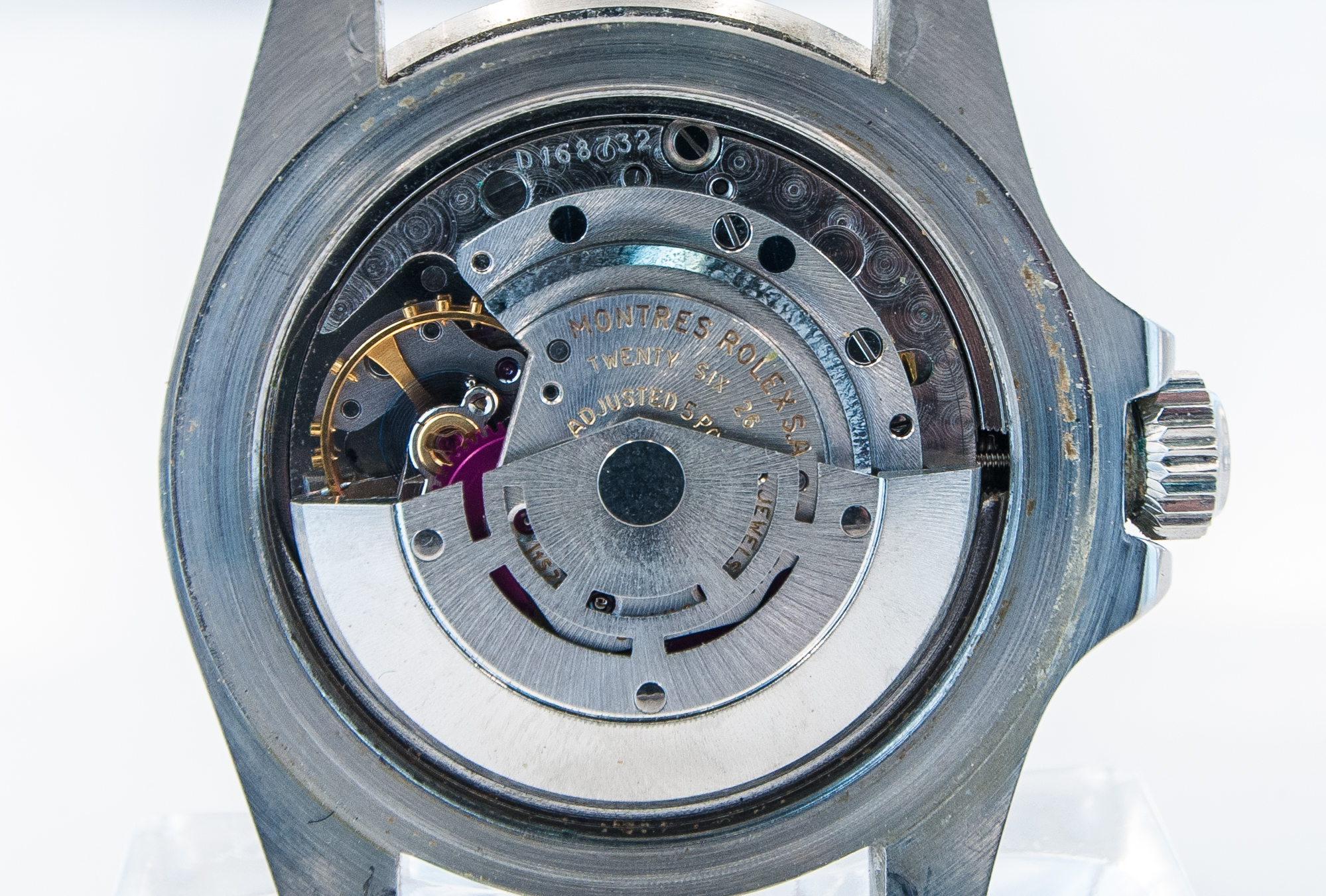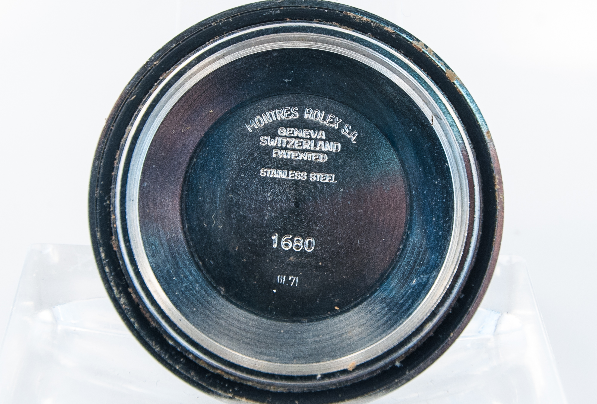 MK Personal Collection The present lot is part of a larger privately held collection and is intended for exhibition purposes only. This is a super rare Rolex Red Submariner Ref 1680 Wristwatch Circa 1970. This very fine and rare Rolex Red Submariner Superlative Chronometer in a three piece steel oyster case, Ref 1680 Serial # 3.061,XXX, measures 48.00mm x 44.00mm including the crown. It is stamped on the inside back cover "III.71". It features an original outrages black dial with luminous round, triangular and bâton indexes and luminous "skeleton" hands featuring the rare submariner printed in RED ink. It has a Cal. 1570 rhodium-plated 26 jewel movement with a straight line lever escapement, monometallic balance adjusted to five positions and temperatures, shock-absorber, self-compensating Breguet balance-spring, microstella regulating screws Serial # D168,XXX that is in excellent running condition. It is very hard to find steel Red Submariners that are untouched by bad watchmakers. This example of the highly coveted ref. 1680 stands out by its very well preserved MK IV dial with red Submariner script. Nicknamed Red Sub by Rolex collectors, the timepiece features evenly aged luminous accents, the full case has never been subject to careless polishing. Introduced in the late 1960s, the reference 1680 was the first Submariner to feature a date indicator as well as the cyclops magnifier. Distinguished by its red Submariner printing to the dial, the Red Sub as it is known to collectors has become a cult classic