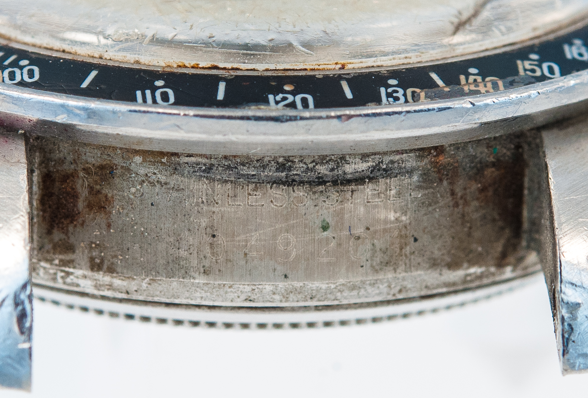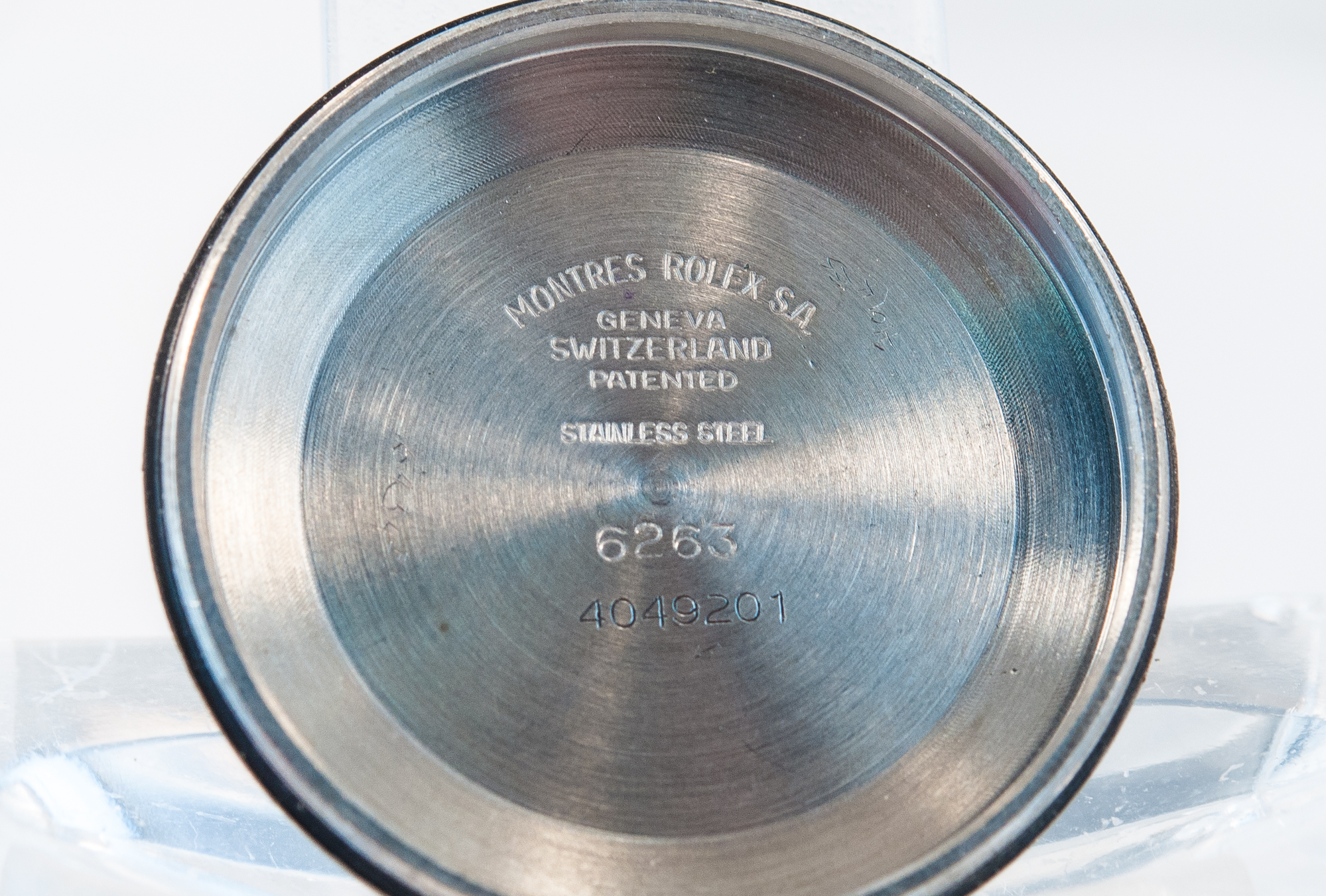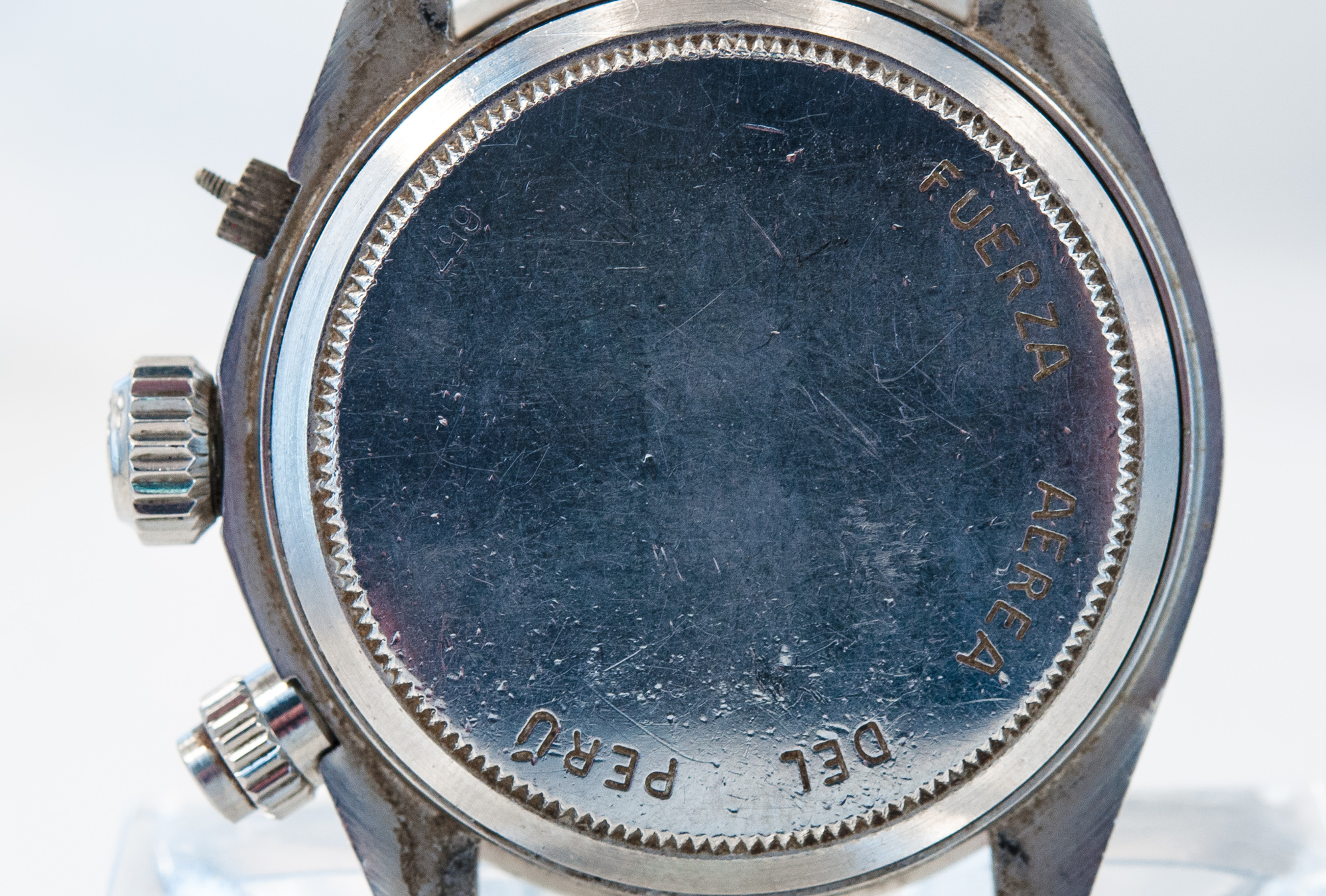 MK Personal Collection The present lot is part of a larger privately held collection and is intended for exhibition purposes only. Rare Rolex Steel Cosmograph Ref 6263 "Fuerza Aerea del Peru" Wristwatch with Original Box and Papers Circa 1974. This very fine men's steel Rolex Cosmograph "Daytona" with a three-body construction case and screwed-down dedicated case back engraved "Fuerza Aerea del Peru" Peruvian Air Force (Internal ID # 657). It has a triplock crown and chronograph pushers (one missing), anti-reflective tachometer graduation black bezel Serial # 4,049.201, bi-color black and matte silver original dial with applied steel bâton indexes and tritium dots, subsidiary "guilloché" black dials for the seconds, the 12-hour and 30- minute registers with luminous steel bâton hands. Cal. 727 rhodium-plated Rolex movement with 17 jewels, straight-line lever escapement, monometallic balance adjusted to 3 positions, shock absorber, self-compensating Breguet balance spring, microstella regulating screws that is in good running condition. The watch is accompanied with the original hanging tag, inner and outer boxes and the blank guarantee Rolex certificate. One of the highest echelons of Rolex collecting is represented by military timepieces, which encompass watches made for the armed forces of a country. The company is known to have at some point in time worked with numerous armed forces or military organizations, including the English Navy, Italian Police, and of course the Peruvian Air Force - as in the case of the present timepiece. Watches made for the Fuerza Aerea Del Perú - or FAP - are today extremely elusive not only in virtue of their intrinsic rarity, but also because of the heavy usage they underwent which implies many pieces were simply lost, and many others were heavily refurbished. While the most obvious characteristic of FAP timepieces is the engraving to the case back, there are two other traits that define these watches. One is that the serial number - all or part of it - has to be present on the inside of the case back, thus linking together case body and case back. The other is a much subtler detail, and often lost due to the reasons mentioned above; on the opposite side of the back from where the FAP engraving is, these watches present an extremely lightly engraved military issue number. So light is this engraving that even a gentle polishing would irremediably erase it. Only a meager percentage of FAP watches still retain this number today, and this piece is indeed one of them, the number 657 still totally readable on the back.
