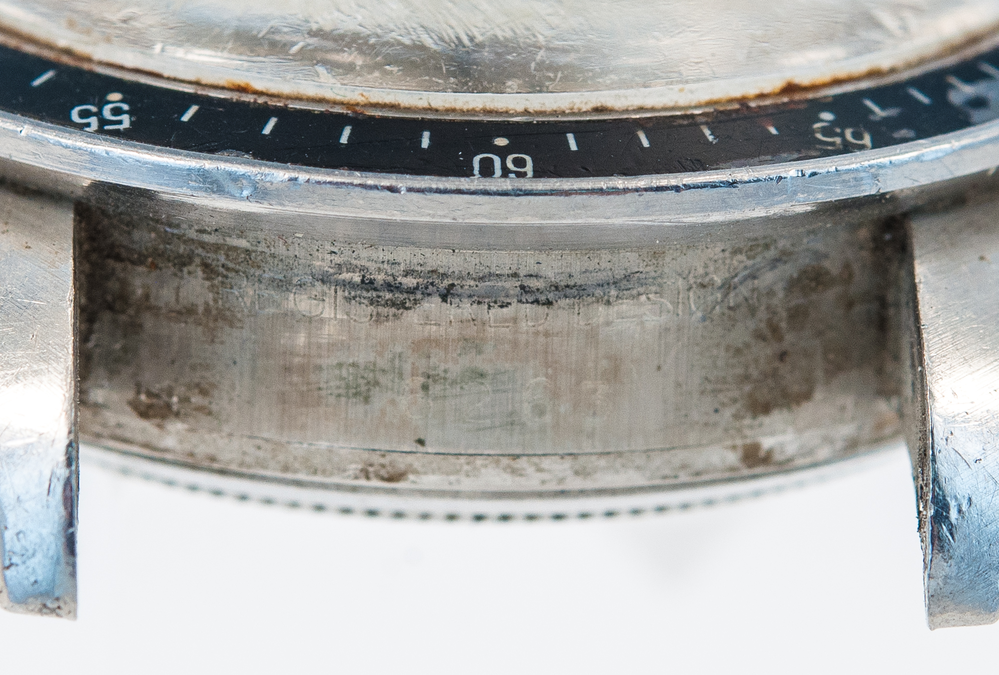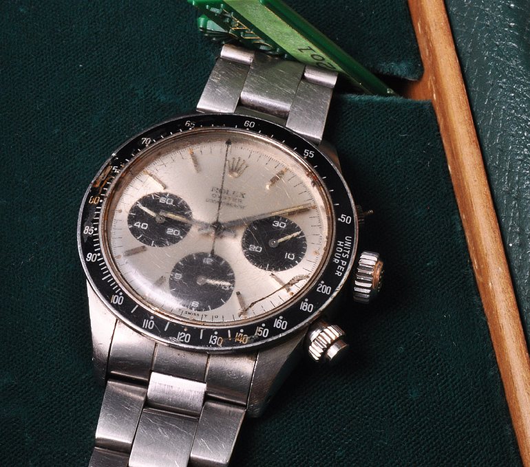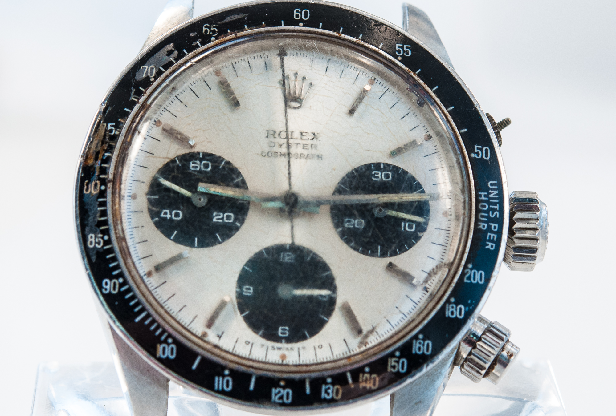 MK Personal Collection The present lot is part of a larger privately held collection and is intended for exhibition purposes only. Rare Rolex Steel Cosmograph Ref 6263 "Fuerza Aerea del Peru" Wristwatch with Original Box and Papers Circa 1974. This very fine men's steel Rolex Cosmograph "Daytona" with a three-body construction case and screwed-down dedicated case back engraved "Fuerza Aerea del Peru" Peruvian Air Force (Internal ID # 657). It has a triplock crown and chronograph pushers (one missing), anti-reflective tachometer graduation black bezel Serial # 4,049.201, bi-color black and matte silver original dial with applied steel bâton indexes and tritium dots, subsidiary "guilloché" black dials for the seconds, the 12-hour and 30- minute registers with luminous steel bâton hands. Cal. 727 rhodium-plated Rolex movement with 17 jewels, straight-line lever escapement, monometallic balance adjusted to 3 positions, shock absorber, self-compensating Breguet balance spring, microstella regulating screws that is in good running condition. The watch is accompanied with the original hanging tag, inner and outer boxes and the blank guarantee Rolex certificate. One of the highest echelons of Rolex collecting is represented by military timepieces, which encompass watches made for the armed forces of a country. The company is known to have at some point in time worked with numerous armed forces or military organizations, including the English Navy, Italian Police, and of course the Peruvian Air Force - as in the case of the present timepiece. Watches made for the Fuerza Aerea Del Perú - or FAP - are today extremely elusive not only in virtue of their intrinsic rarity, but also because of the heavy usage they underwent which implies many pieces were simply lost, and many others were heavily refurbished. While the most obvious characteristic of FAP timepieces is the engraving to the case back, there are two other traits that define these watches. One is that the serial number - all or part of it - has to be present on the inside of the case back, thus linking together case body and case back. The other is a much subtler detail, and often lost due to the reasons mentioned above; on the opposite side of the back from where the FAP engraving is, these watches present an extremely lightly engraved military issue number. So light is this engraving that even a gentle polishing would irremediably erase it. Only a meager percentage of FAP watches still retain this number today, and this piece is indeed one of them, the number 657 still totally readable on the back.