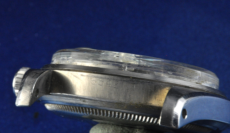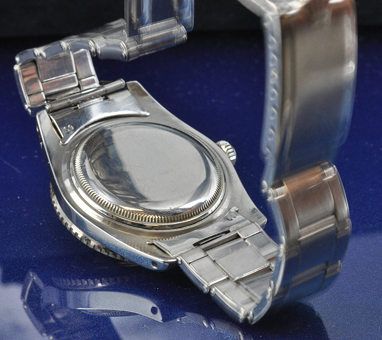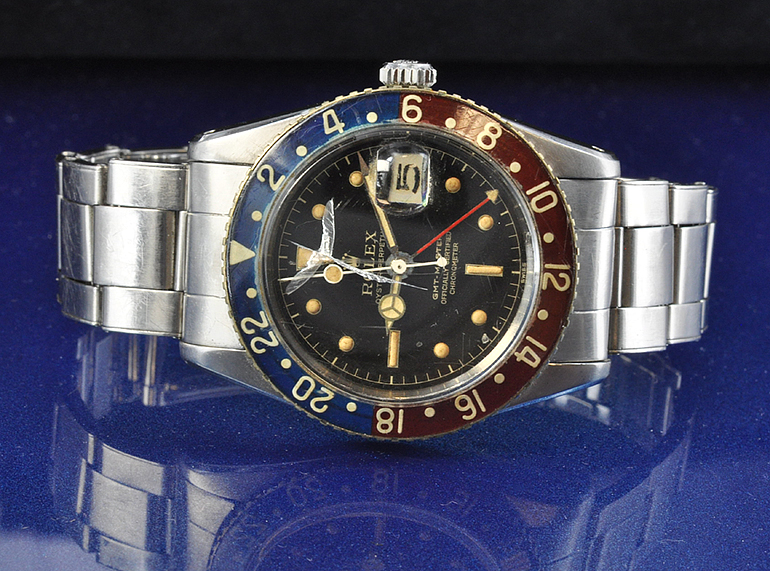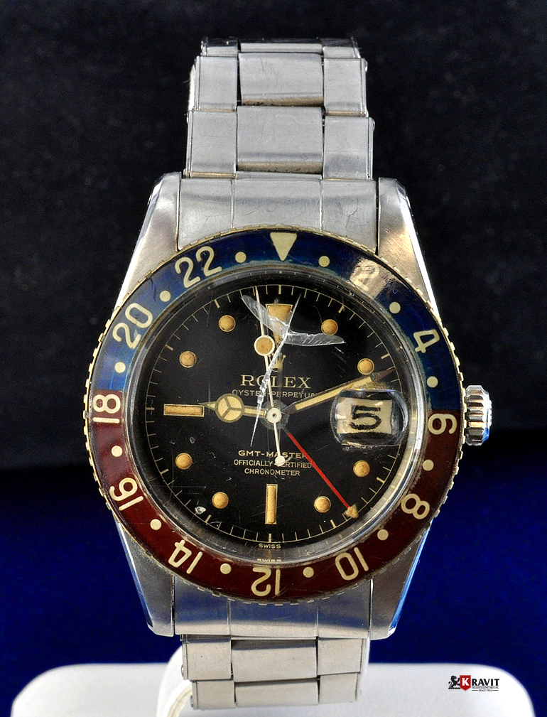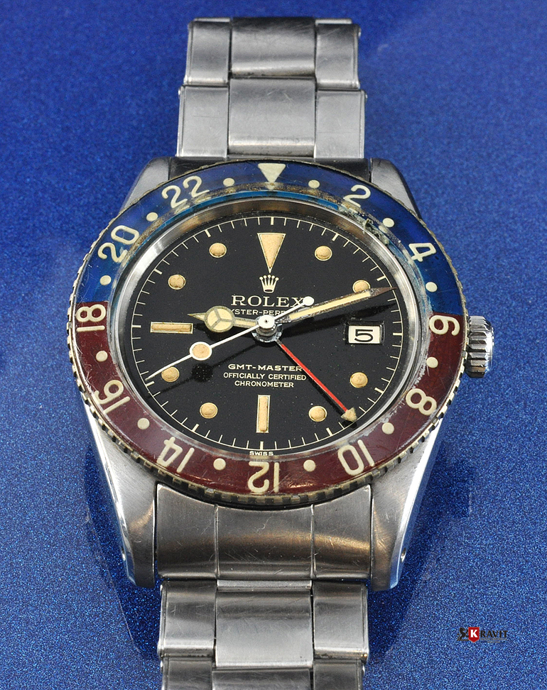 MK Personal Collection Super Rare Tropical Dial Rolex GMT Master Wristwatch Ref 6542 No Crown Guard Circa 1957