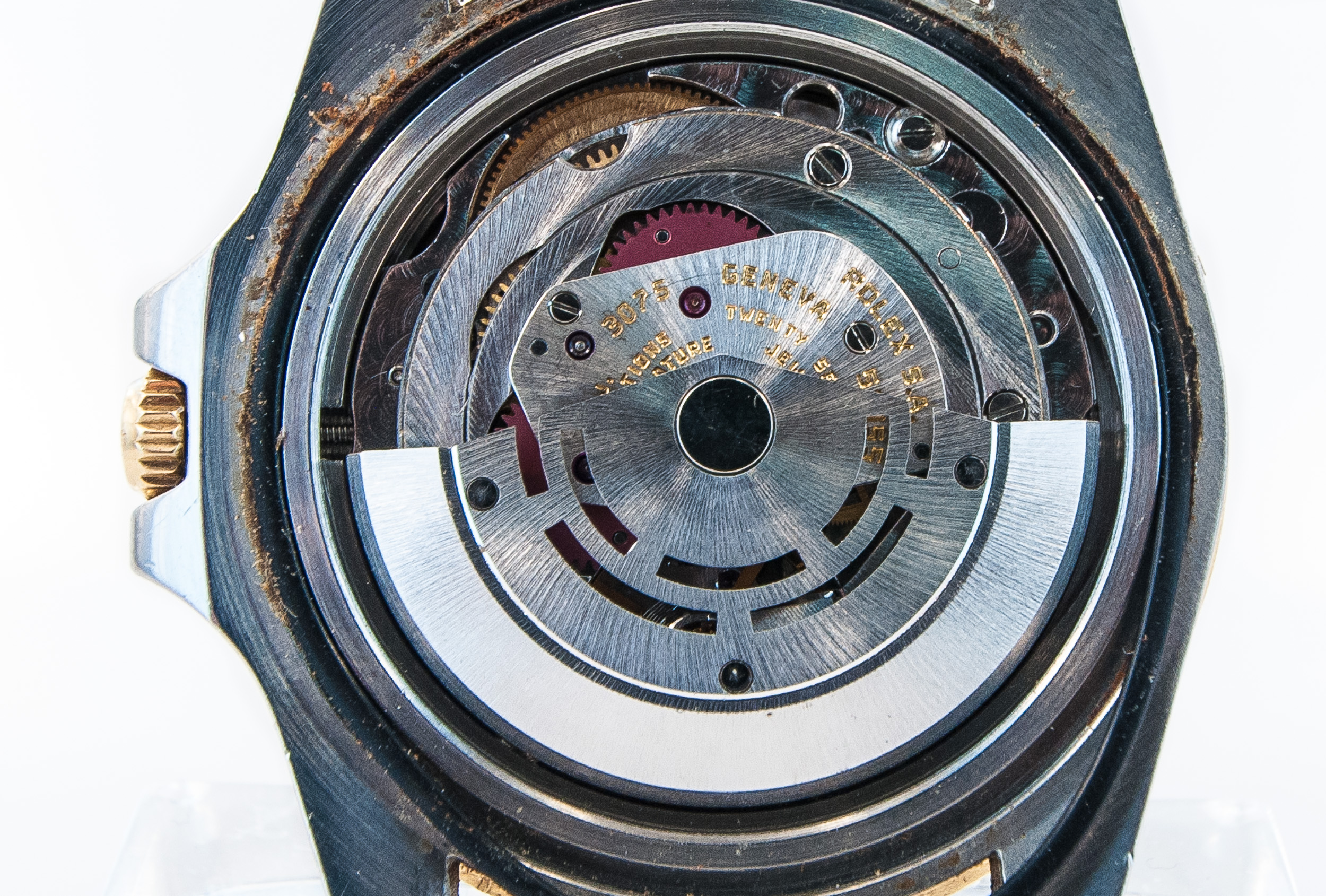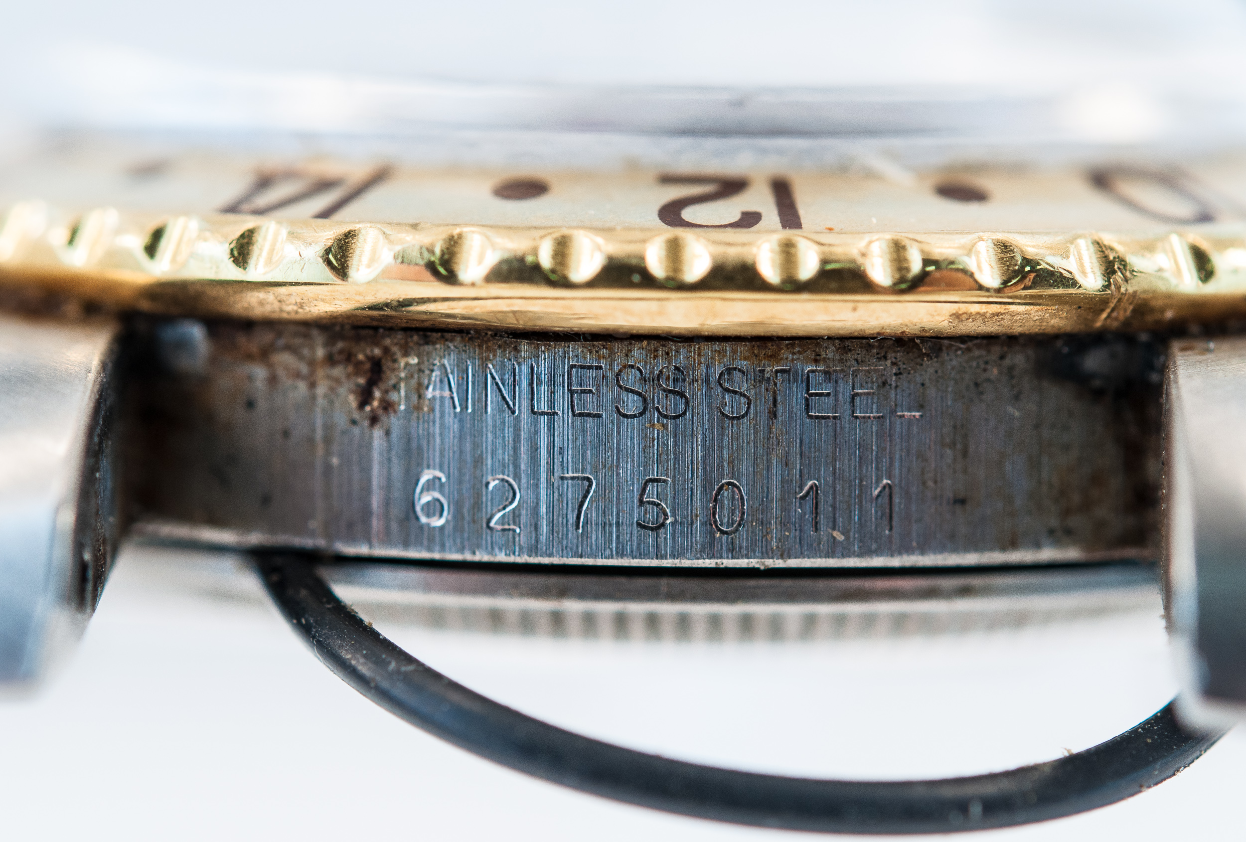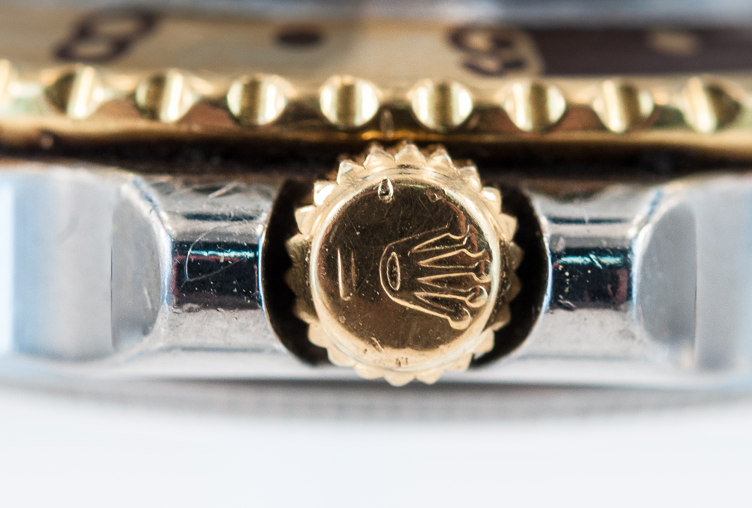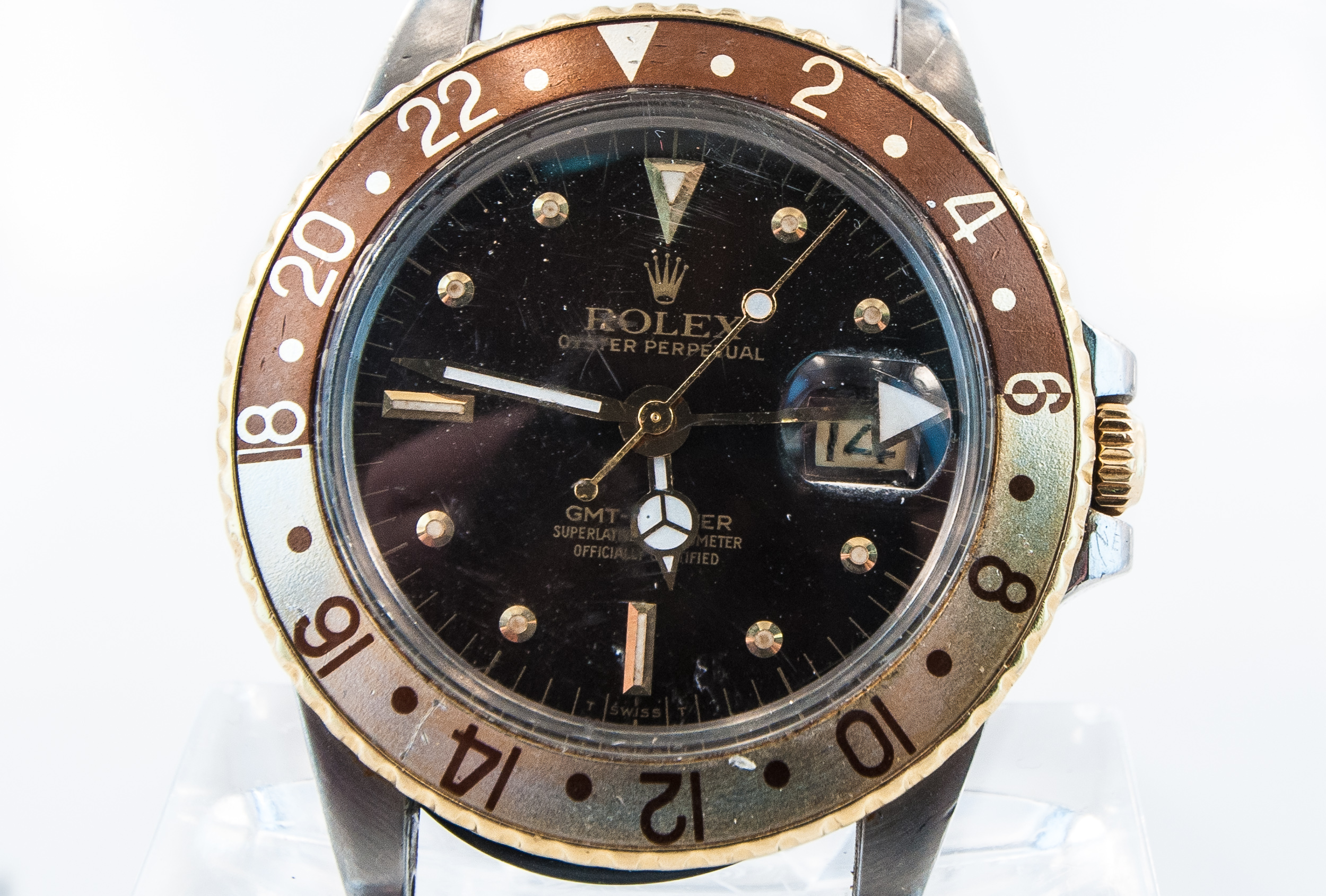 MK Personal Collection The present lot is part of a larger privately held collection and is intended for exhibition purposes only. This is Rolex GMT Master Two-Tone Root Beer Wristwatch Ref 16753 Circa 1980. This is a vintage Rolex GMT Master Ref 16753 circa 1980 in a three piece steel and gold oyster case with a screw down waterproof back Ref 16753 Serial #6.275.011. The watch has a Cal. 3075 rhodium-plated Rolex movement with 27 jewels, straight line lever escapement, monometallic balance adjusted to temperatures and 5 positions, shock-absorber, self-compensating free-sprung Breguet balance spring, Microstella regulating screws that is in running condition. The watch does need an overhaul. The watch Serial #0.615.002 and it is topped with an original GMT "Root Beer" glossy dial gold round, baton and triangular indexes, outer minute/seconds divisions, aperture for the date at three o'cock and it has luminous yellow gold skeleton hands. It is attached to a two tone Rolex bracelet #458 78363 14 that measures 8 1/4" long. The watch is in overall good condition but it does need to be polished.