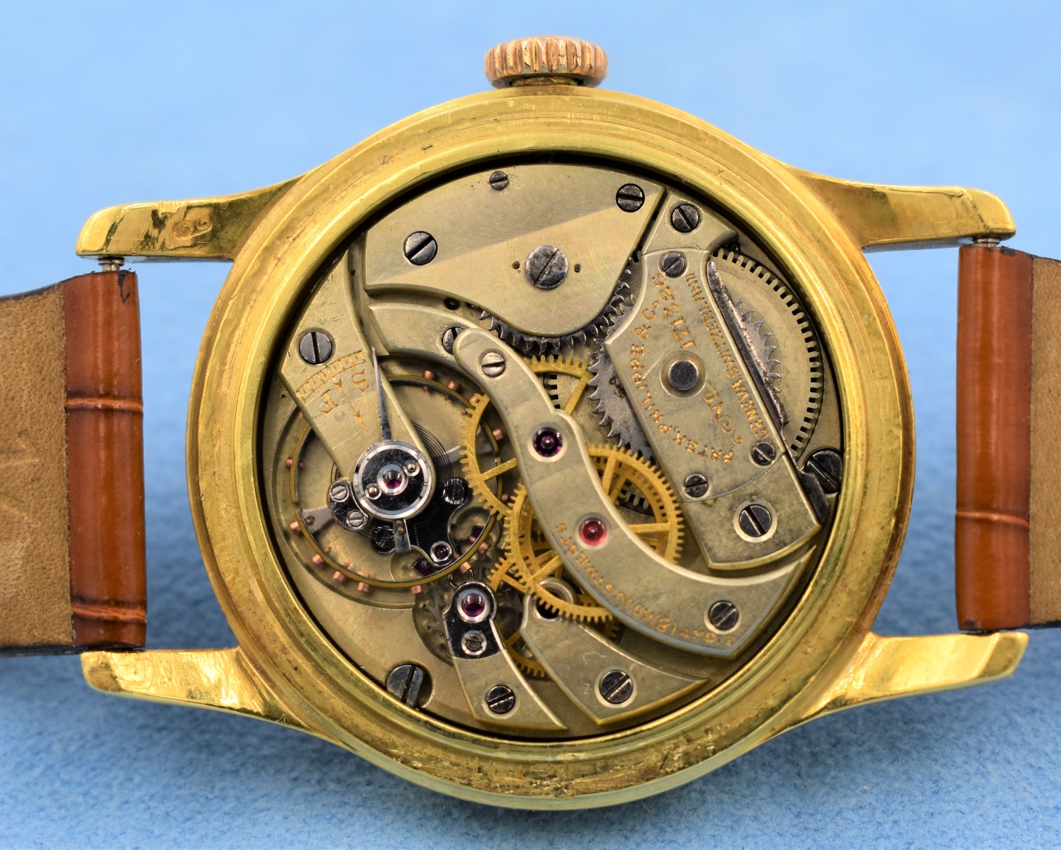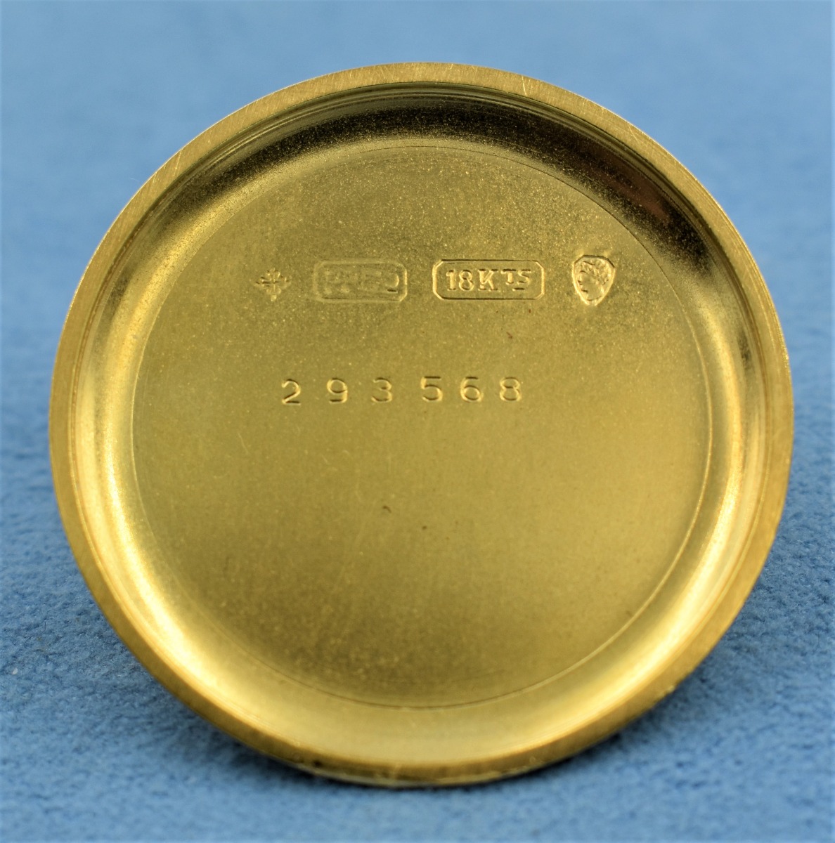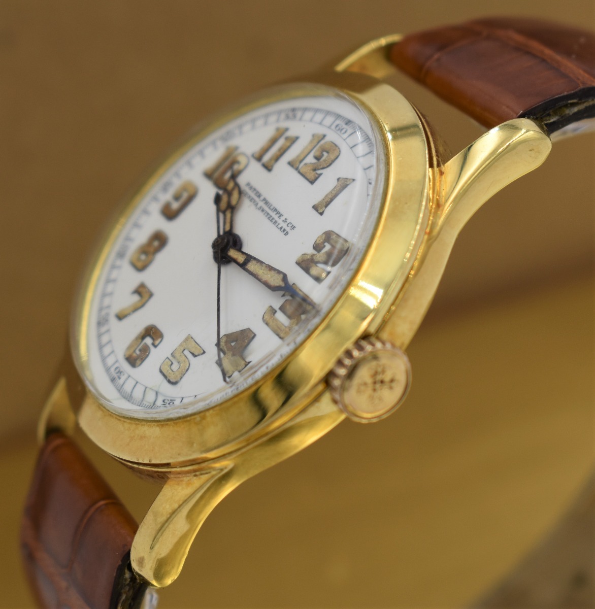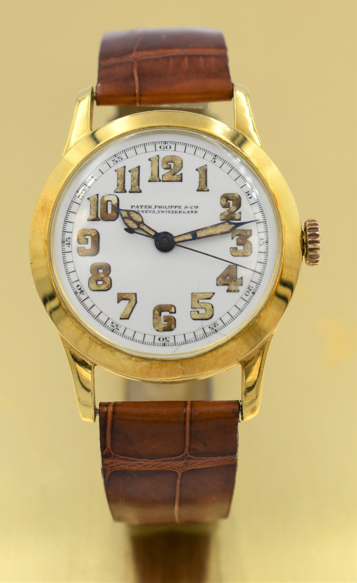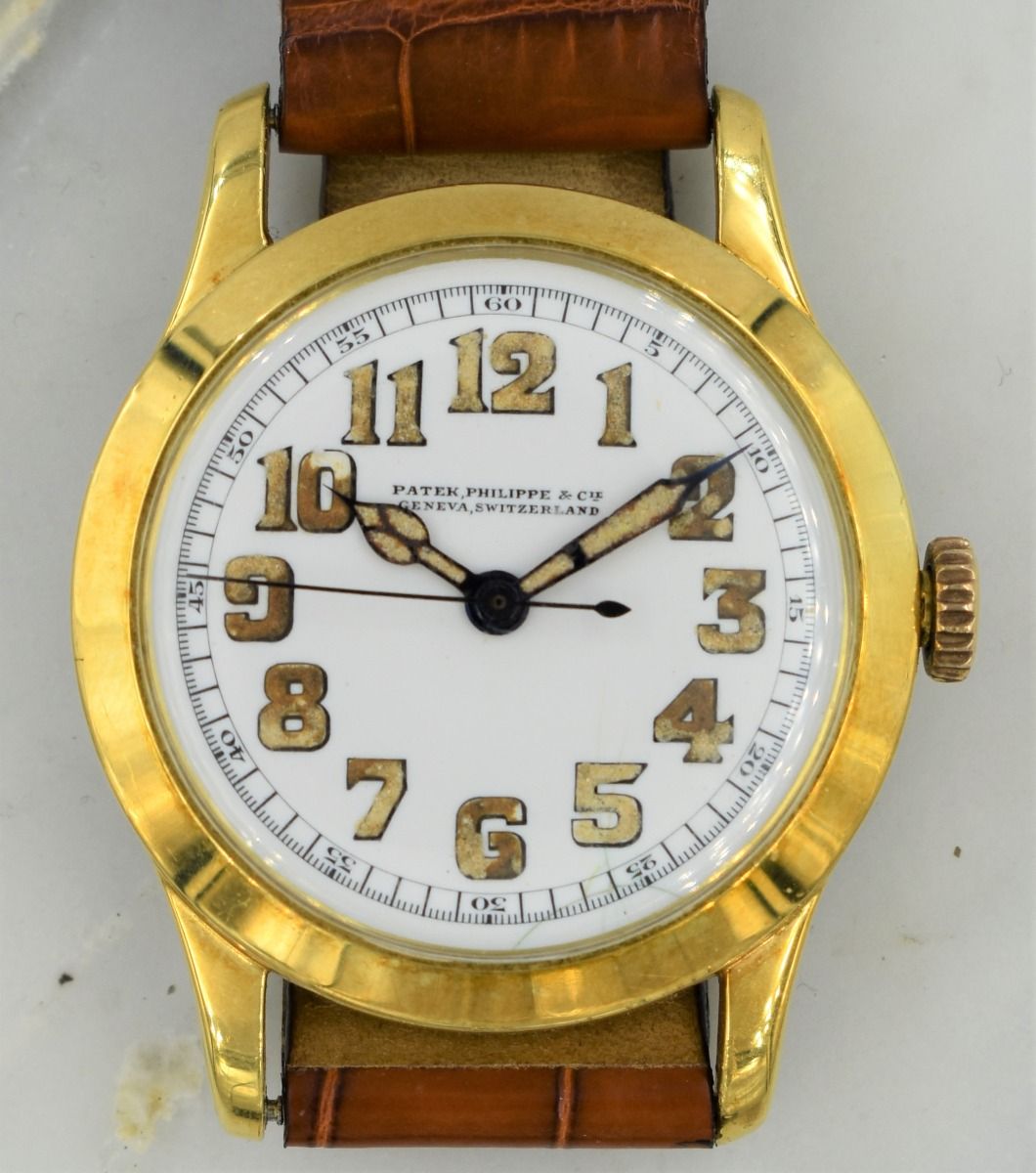 MK Personal Collection Unique 18K Center Sweep Seconds Officers Watch By Patek Philippe Circa 1917. This is a very fine and early 18K yellow gold wristwatch by Patek Philippe. The watch has a sweep center seconds with an enamel dial with large Arabic luminescent numerals and framed with 60 minute outer chapter ring (unique). The watch has a three piece 18K yellow gold circular case signed "PPCo" with Swiss hallmarks stamped on the inside back and the back of the lugs as well (Serial # 293.568). The watch measures 44.00mm lug to lug x 34.00mm without the crown. The watch has a high grade Swiss nickel plated indirect center sweep second movement by Patek Philippe featuring a 17 jewel rhodium-plated movement with fausses cotes decoration, straight line lever escapement, cut bimetallic balance and self-compensating Breguet balance spring topped with a micrometer regulator (Serial # 171.326). The movement is in running condition. It is topped with an original white porcelain Sector dial with large Arabic Indexes, highly unusual 60 second chapter ring to be used in collaboration with the sweep seconds (early pilots?). Please note the dial does have a hairline crack. This model, commonly known as an officer's wristwatch, gets its name from the fact that timepieces of this style were used by military personnel on both sides of the conflict in the First World War. The enamel dial, the relatively small size, the simple shape of these pieces and the use of a cuvette harken back to the pendant watches from whence they evolved. Indeed, the main differences between these early watches and their forebears are the lugs and strap as well as the crown's new position at 3 o'clock for ease of winding.