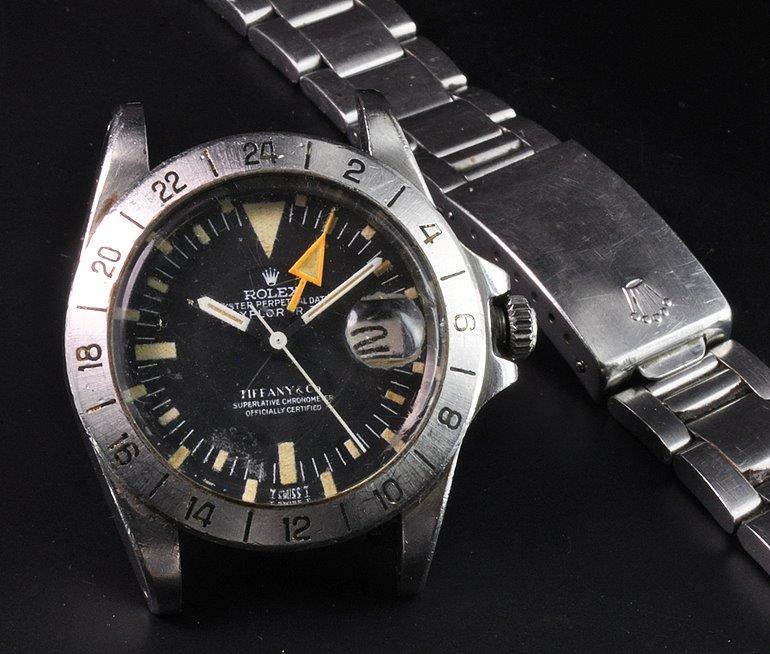 MK Personal Collection The present lot is part of a larger privately held collection and is intended for exhibition purposes only. Unique Rolex Tiffany & Co Steve McQueen Orange Hand Explorer II Wristwatch Ref 1655 Circa 1972. This very rare and unusual Rolex Explorer II with orange hands in a steel three piece case is topped with an engraved black fixed bezel crown, Ref 1655, Serial # 3.343.XXX. It has a Cal. 1575 GMT, rhodium plated, 26 jewels, straight-line lever escapement, monometallic balance adjusted to temperatures and 5 positions, shock absorber, self-compensating free-sprung Breguet balance spring, Microstella regulating screws, hack mechanism that is in good running condition. The watch is topped with a rare original black Tiffany & Co dial with luminous indexes, aperture for the date at 3 o'clock with luminous white bâton hands and a large orange arrow to indicate the diurnal and nocturnal hours on the 24-hour graduated bezel. The watch is in overall excellent condition. the most iconic vintage Rolex references, the so-called Freccione (Italian for big arrow) or Steve McQueen was in production from 1971 to 1985. True to Rolexs philosophy of producing highly reliable timepieces often focused on professional use, this model was conceived as a speleologists watch. The generous amount of luminous details on the dial, and the very bright 24 hours orange hand are features dedicated to these researchers who spend, at times, days underground in the dark.The present example is enhanced with its double-signed dial, showcasing the American retailer's signature, Tiffany & Co., as well as that of Rolex.