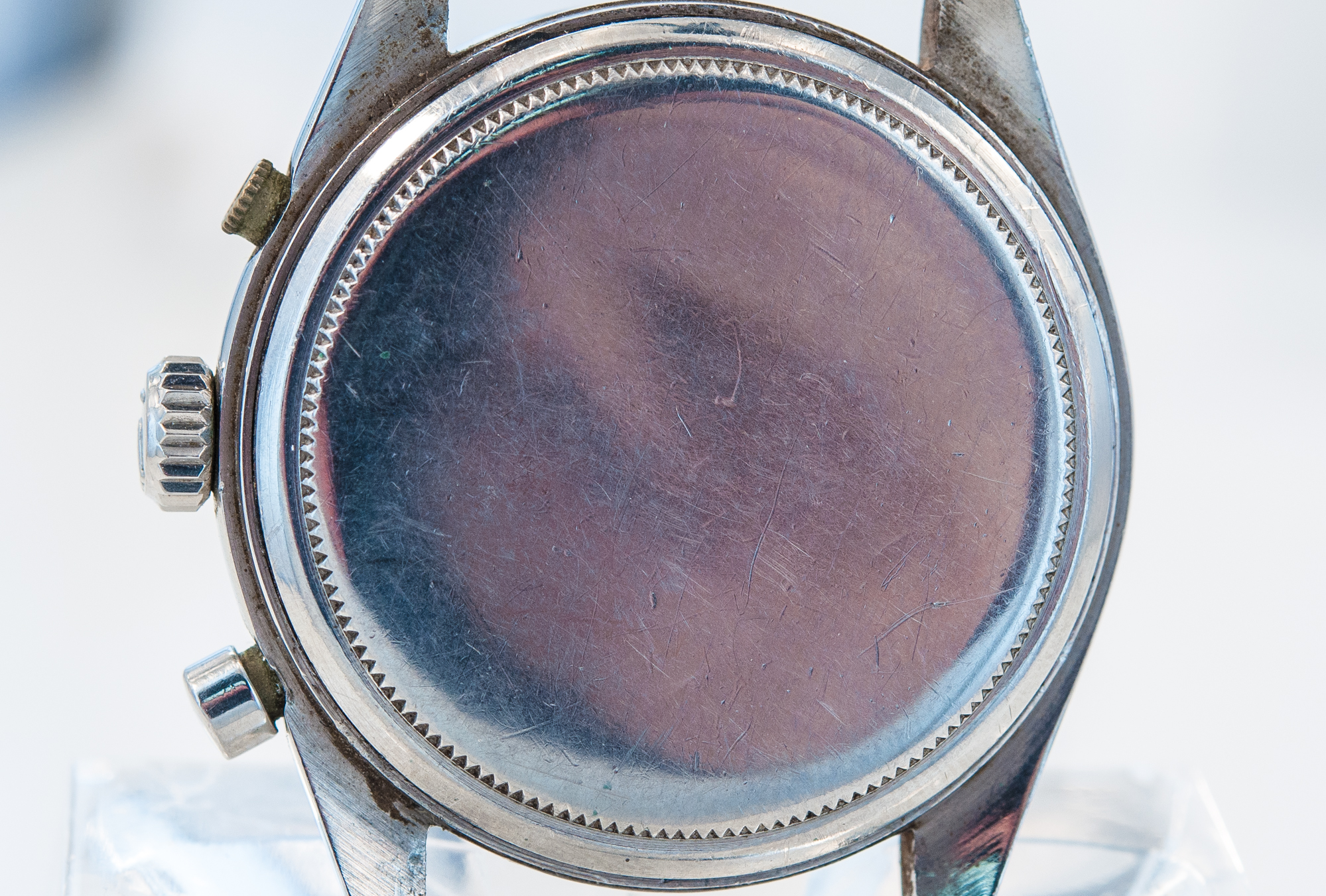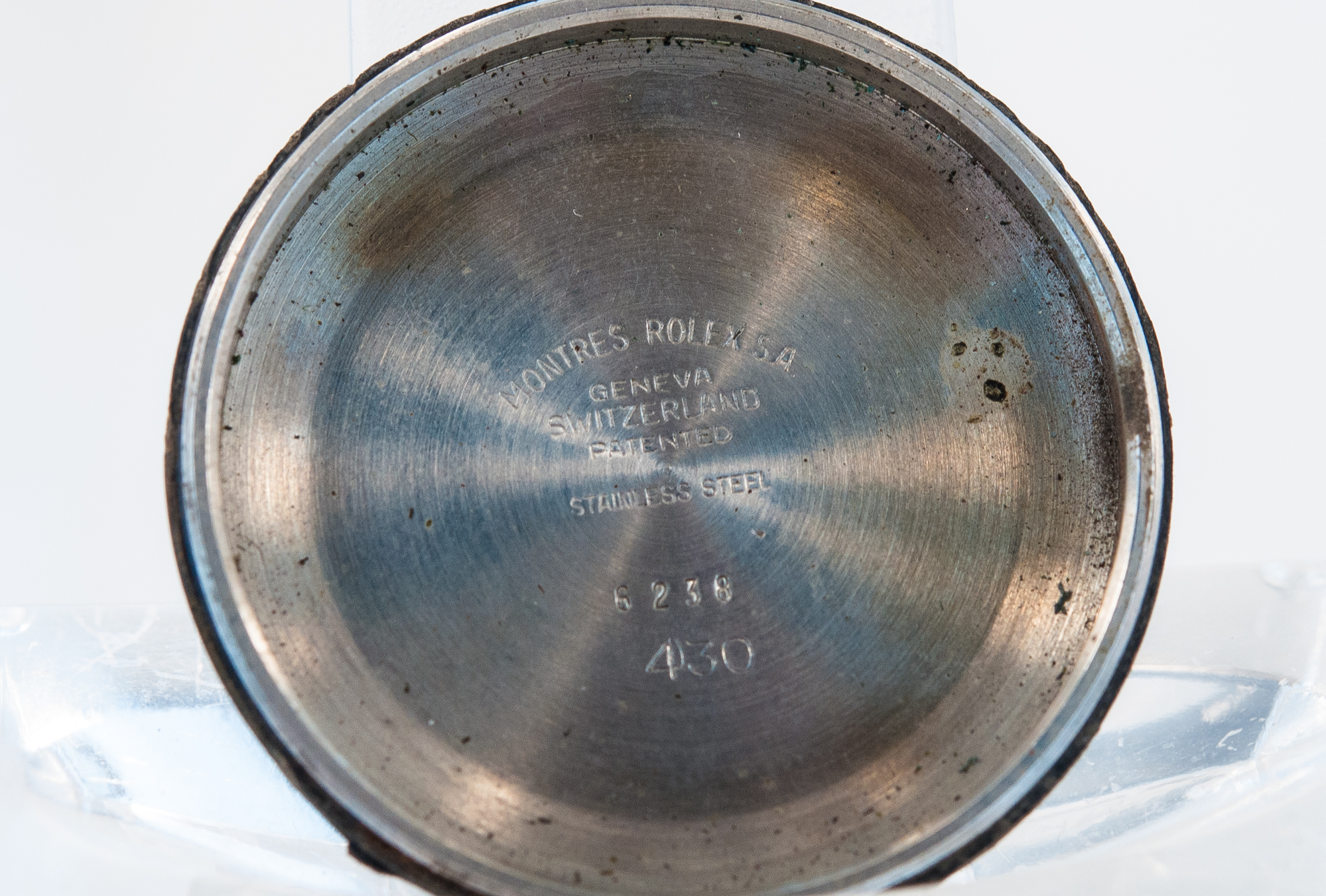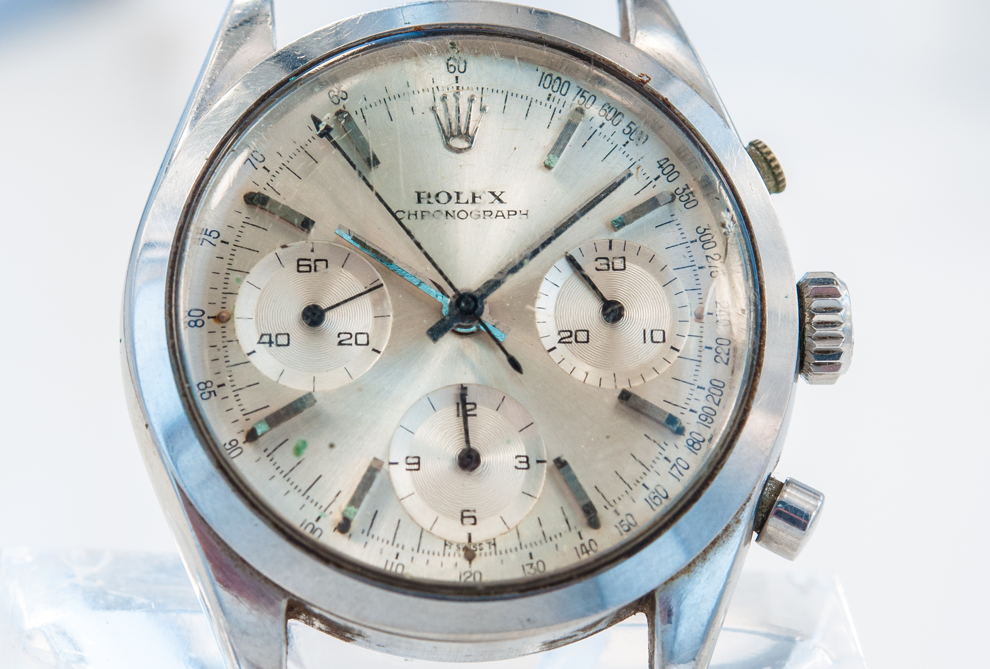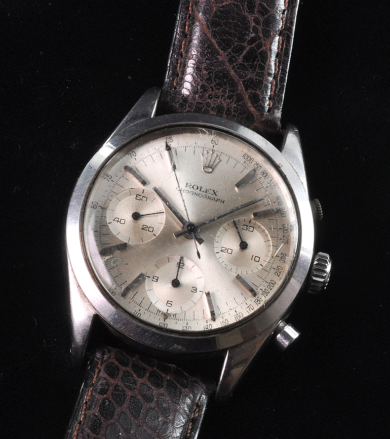 MK Personal Collection The present lot is part of a larger privately held collection and is intended for exhibition purposes only. Very Rare "So Called" Pre Daytona Rolex Oyster Chronograph Wristwatch Ref 6238 Circa 1966. This is a very rare "Pre Daytona" Rolex Oyster Chronograph, Ref 6238, wristwatch, circa 1966. This is a water resistant stainless steel gentlemen's wristwatch with round button chronograph, registers and tachometer. The case is three body, polished and brushed, screwed down case back and crown (Serial #1.102.430, It is interesting to note that the last 3 case numbers between the lugs are also engraved inside the case back.), The watch is topped with a satine silver dial with applied steel baton indexes and tritium coated dots, subsidiary "guilloche" dials for the seconds, the 12-hour and 30-minute registers, tritium coated steel "baton" hands. Cal 72B rhodium plated, 17 jewels, straight line lever escapement, monometallic balance, shock absorber, self compensating Brequet balance spring, microstella regulating screws. The dial, case and movement are signed. Produced from approximately 1960 to 1967, the Rolex reference 6238 is a perfect embodiment of the timeless chronograph. Referred to as the Pre-Daytona by collectors, the reference 6238 shares similar case size, pushers and baton hands as its contemporary, the first Cosmograph Daytona reference 6239. While the Cosmograph Daytona always features a two tone dial with either black with silver sub dials or vice versa, the reference 6238 was offered only with a monochromatic dial. Marking the end of an era, the 6238 was also the last Rolex chronograph to feature a smooth bezel and a graduated tachymeter scale printed on the dial. Rolexs later Daytona models would all display the scale on the bezel. The present example Rolex Pre-Daytona ref. 6238 features a well-preserved silver dial with the cal. 72B making it one of the last examples before it was transitioned to the cal. 722 featured also in the ref. 6239. With a T SWISS T designation at 6 Oclock, the present second-generation dial indicates the use of tritium for the luminous material applied on the hands and indexes.