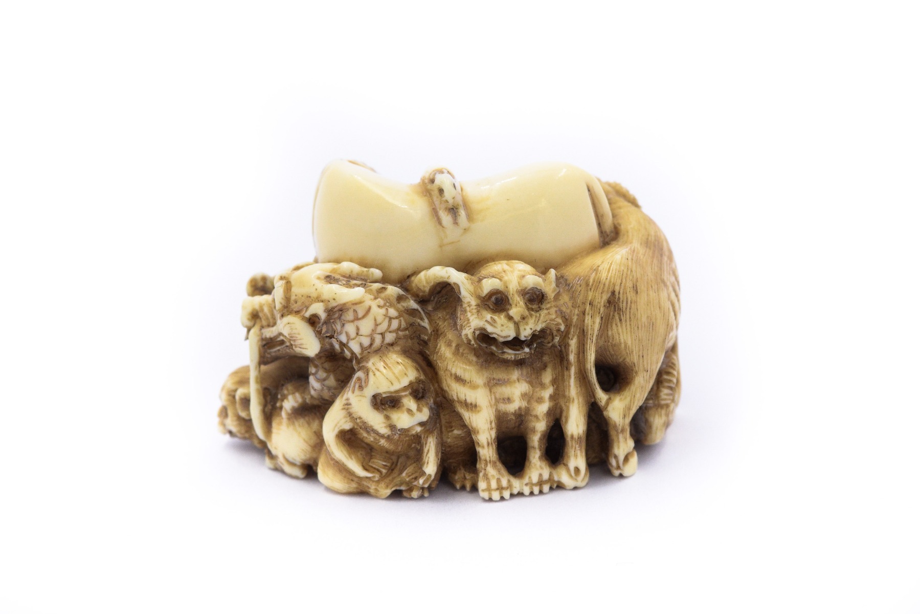 Netsuke Chinese Zodiac with Animals 0622; Measures 42.16mm x 26.80mm; Weighs 14.8dwt/23.01g with certificate of appraisal.