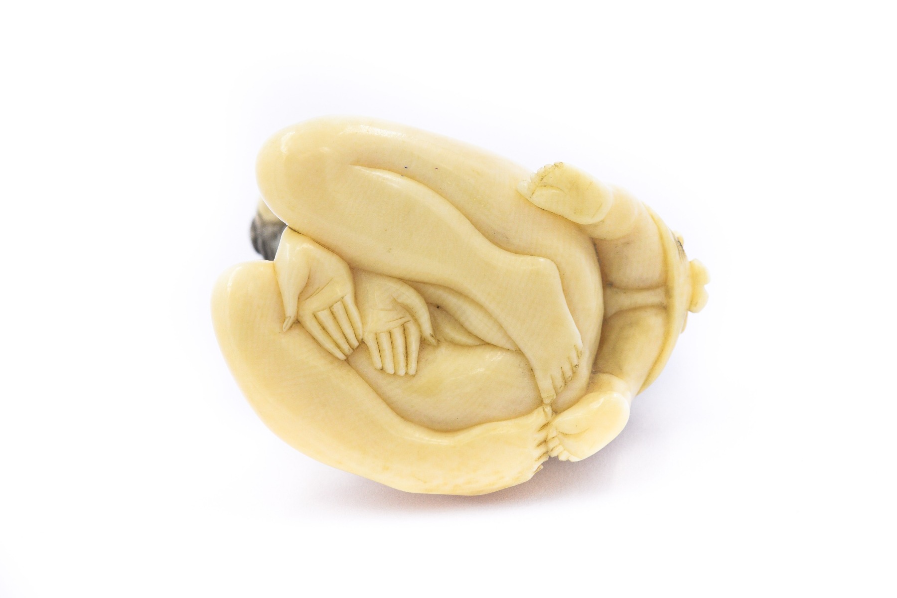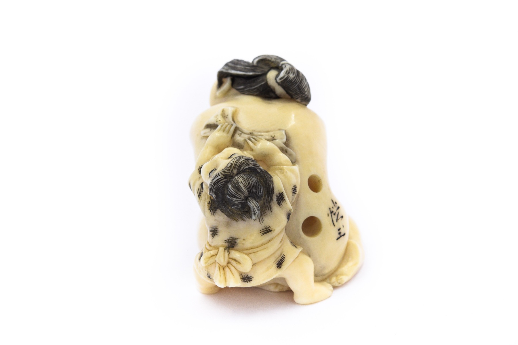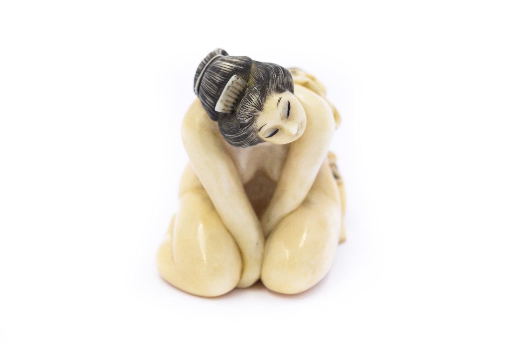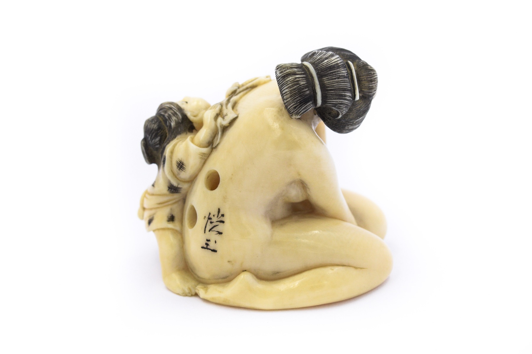 Netsuke Geisha Washing Boy by Royosei 0611; Measures 35.29mm x 39.74mm; Weighs 18.2 dwt/28.30g with certificate of appraisal