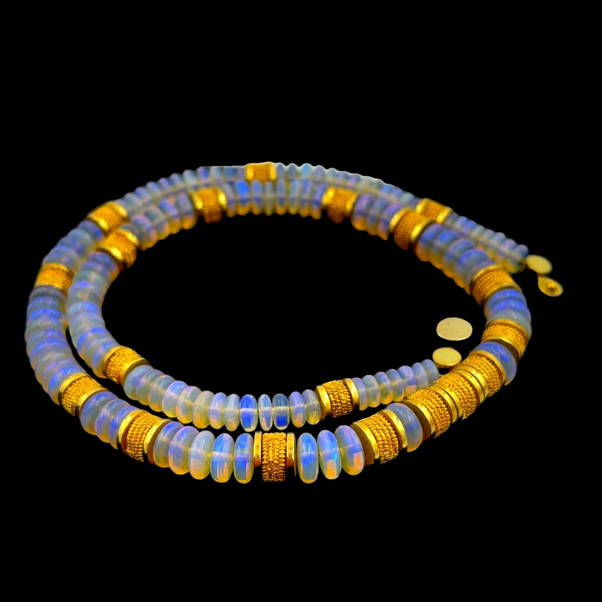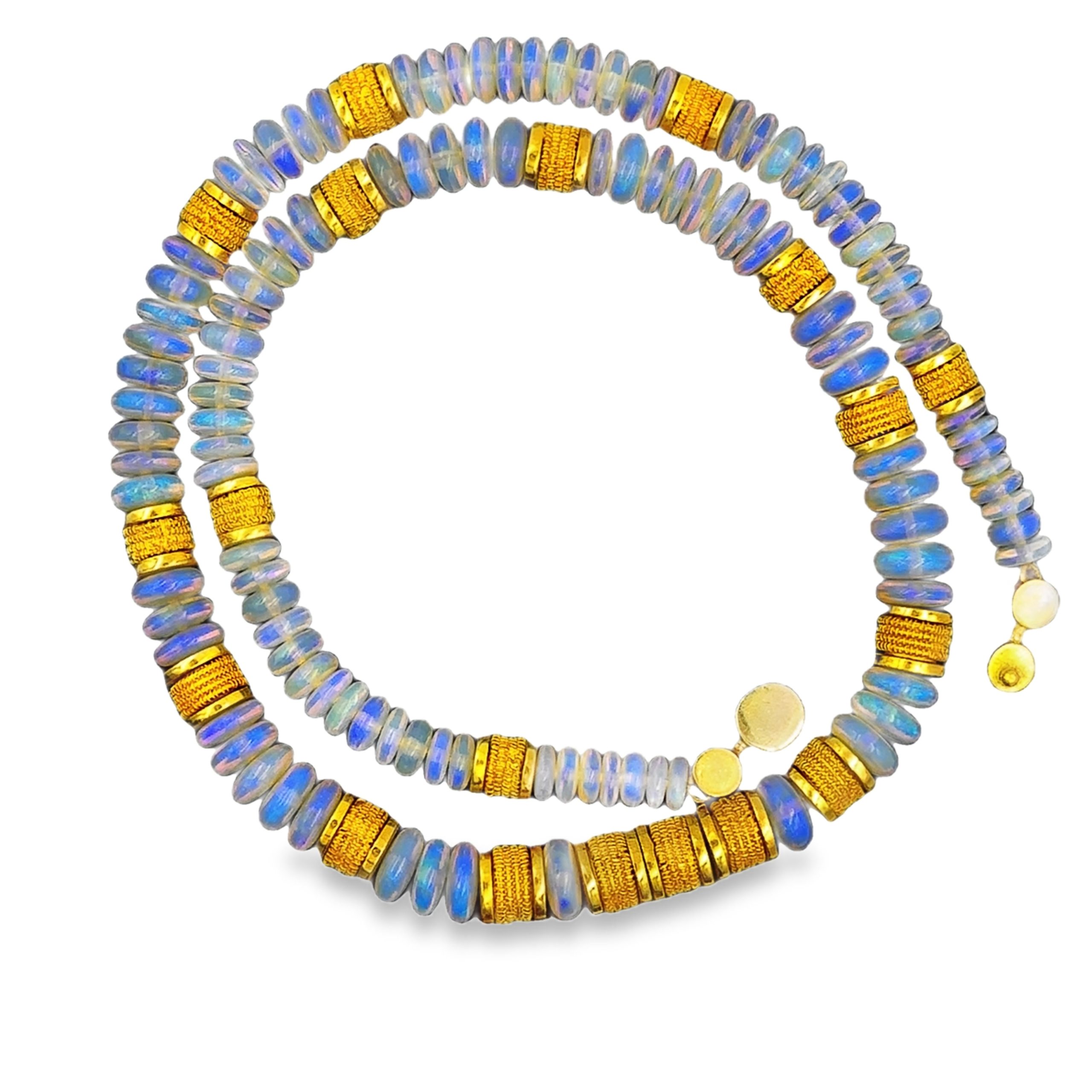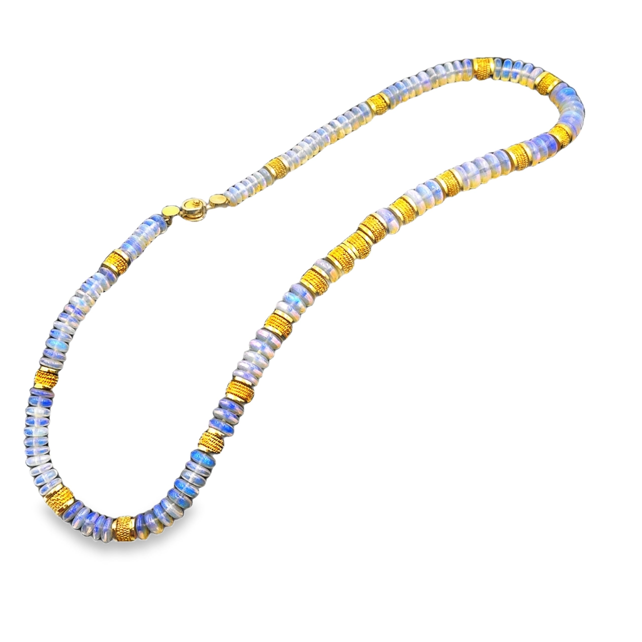 Beaded 18K Yellow Gold & Australian Opal Necklace, featuring 115 graduating circular cut jelly opal beads that range from 5mm to 7.50mm in width flanked by textured gold spacers, adding an extra touch of sophistication to the design. The necklace weighs 34.70Dwt and measures approximately 16 3/4 inches in length