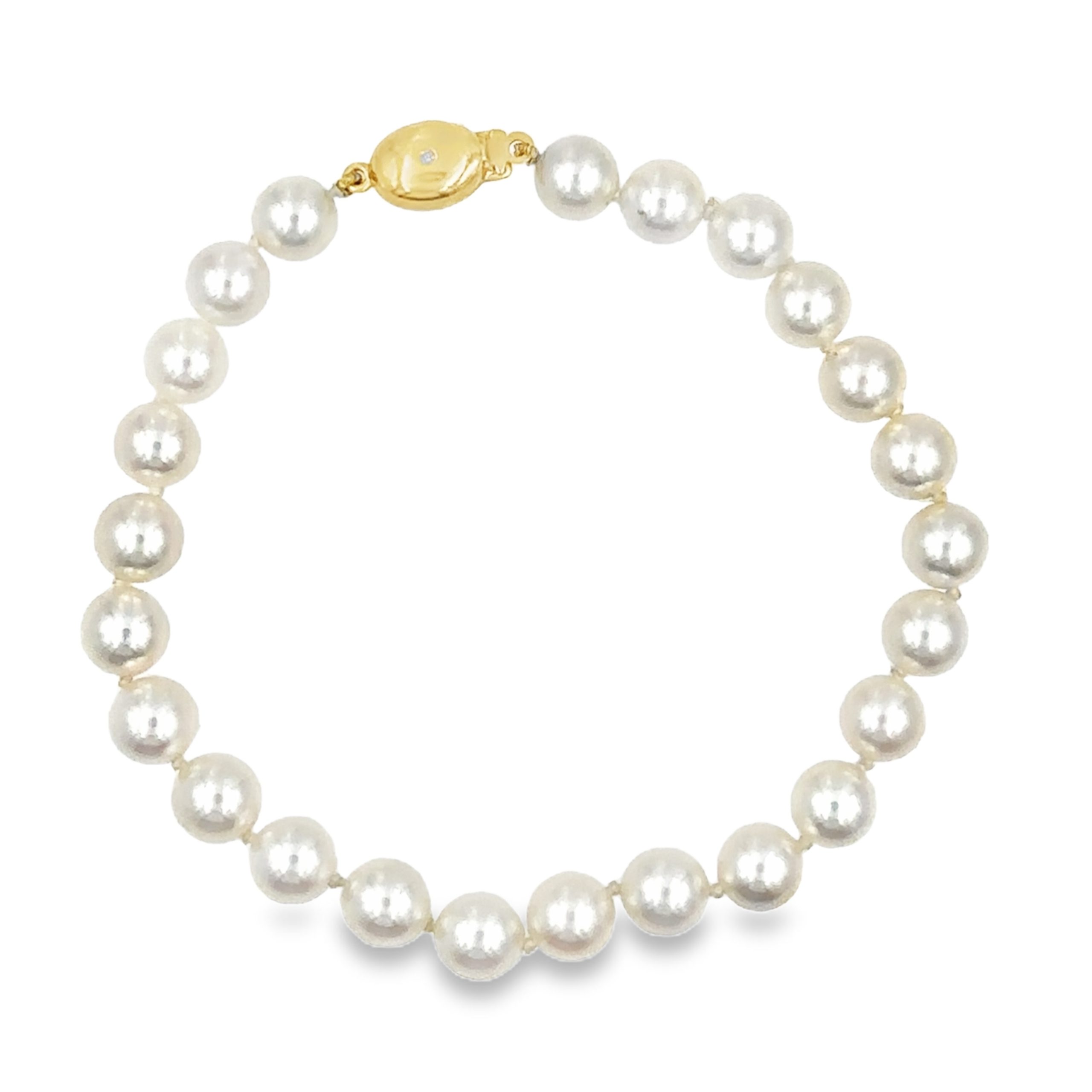 Cultured Akoya Pearl Bracelet by JKa Kohle & Co, strung with 24 pearls measuring 7mm each, and terminating in an 18K oval double-sided diamond clasp. Bracelet length: 7 1/2 inches.