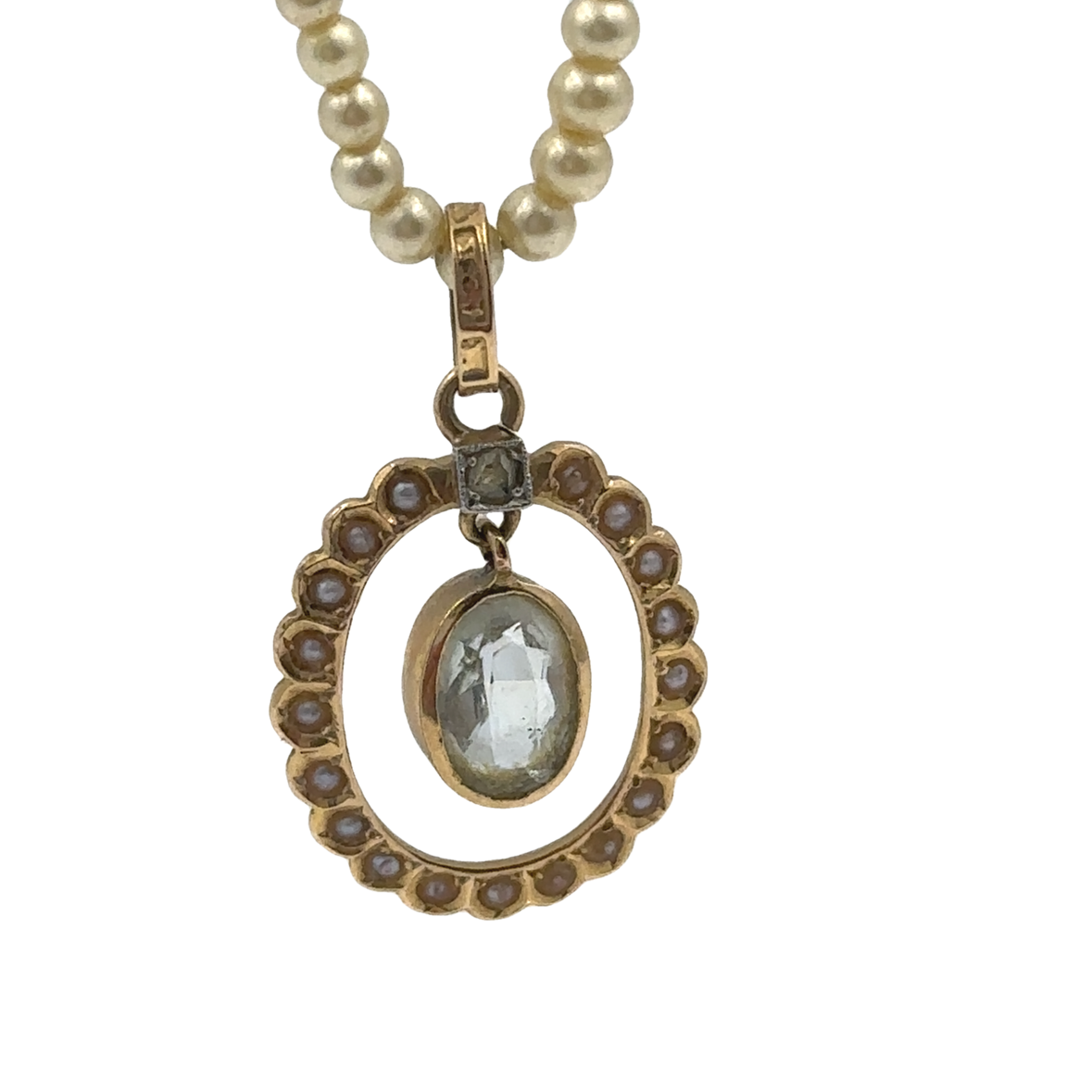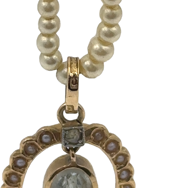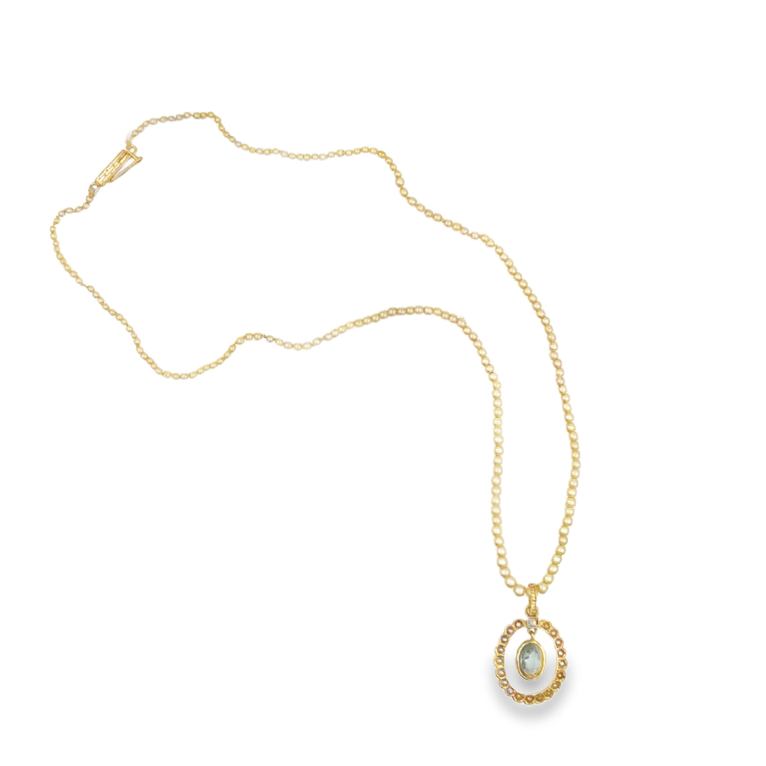 This Victorian Pearl & Aquamarine pendant by Garrard & Co. features a centrally set oval cut aquamarine weighing approximately 0.50 carats. The pendant, measuring 20 x 15 mm, suspends from a 14-inch long graduating cultured pearl necklace. The entire piece weighs 2.80 Dwt (4.30 grams).