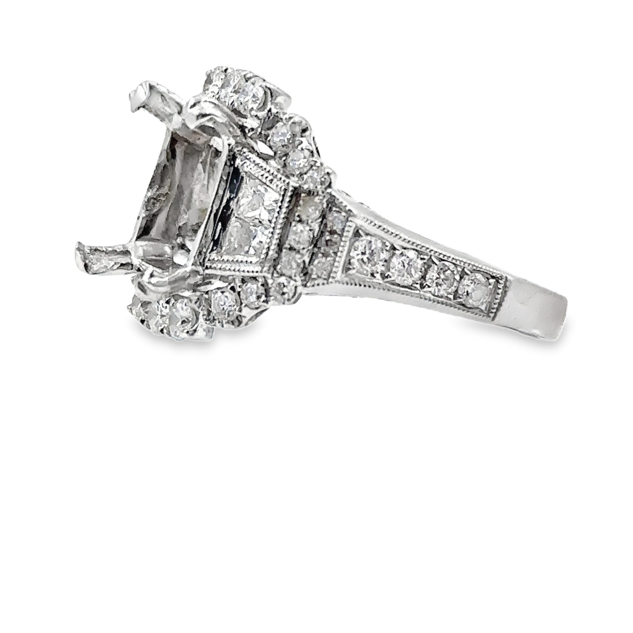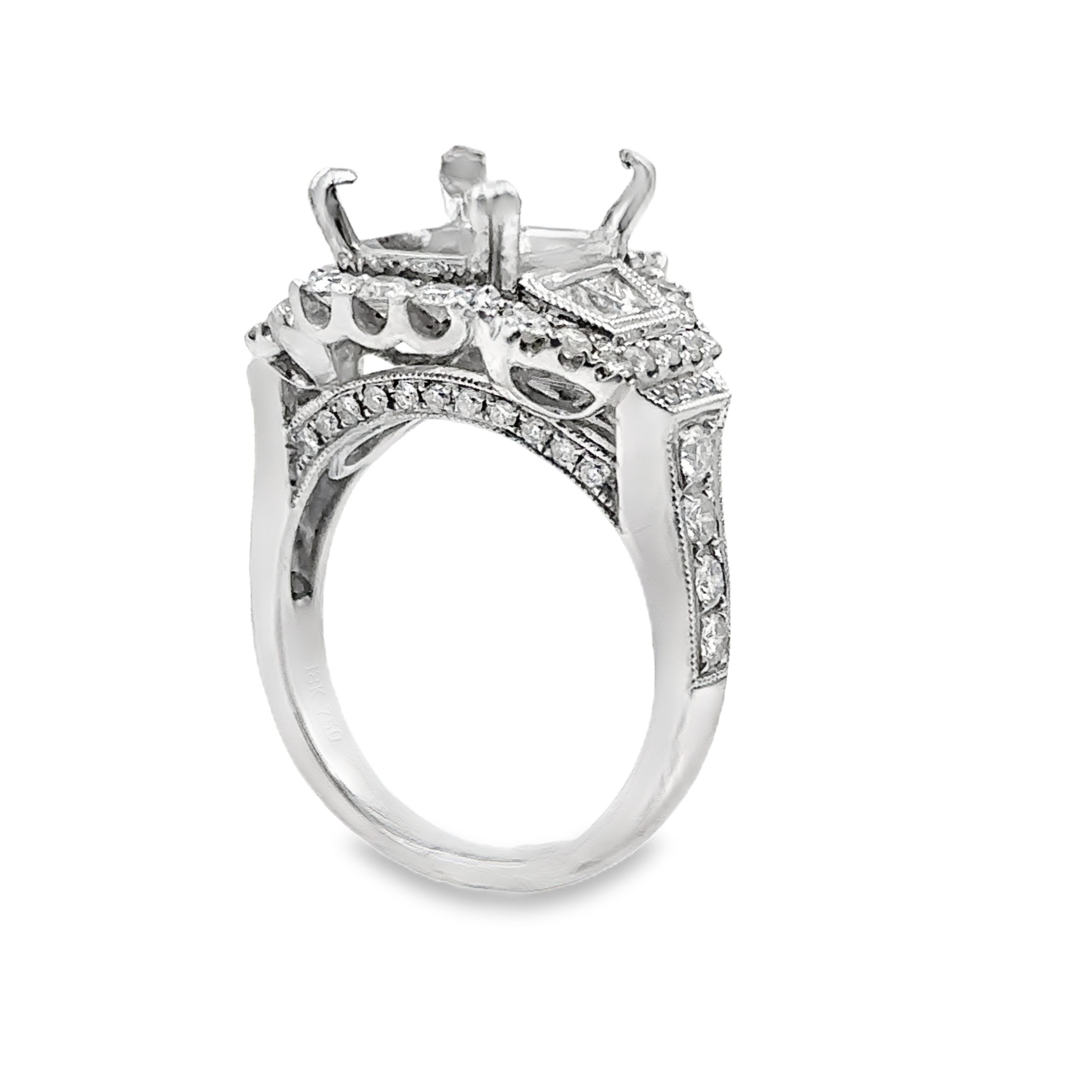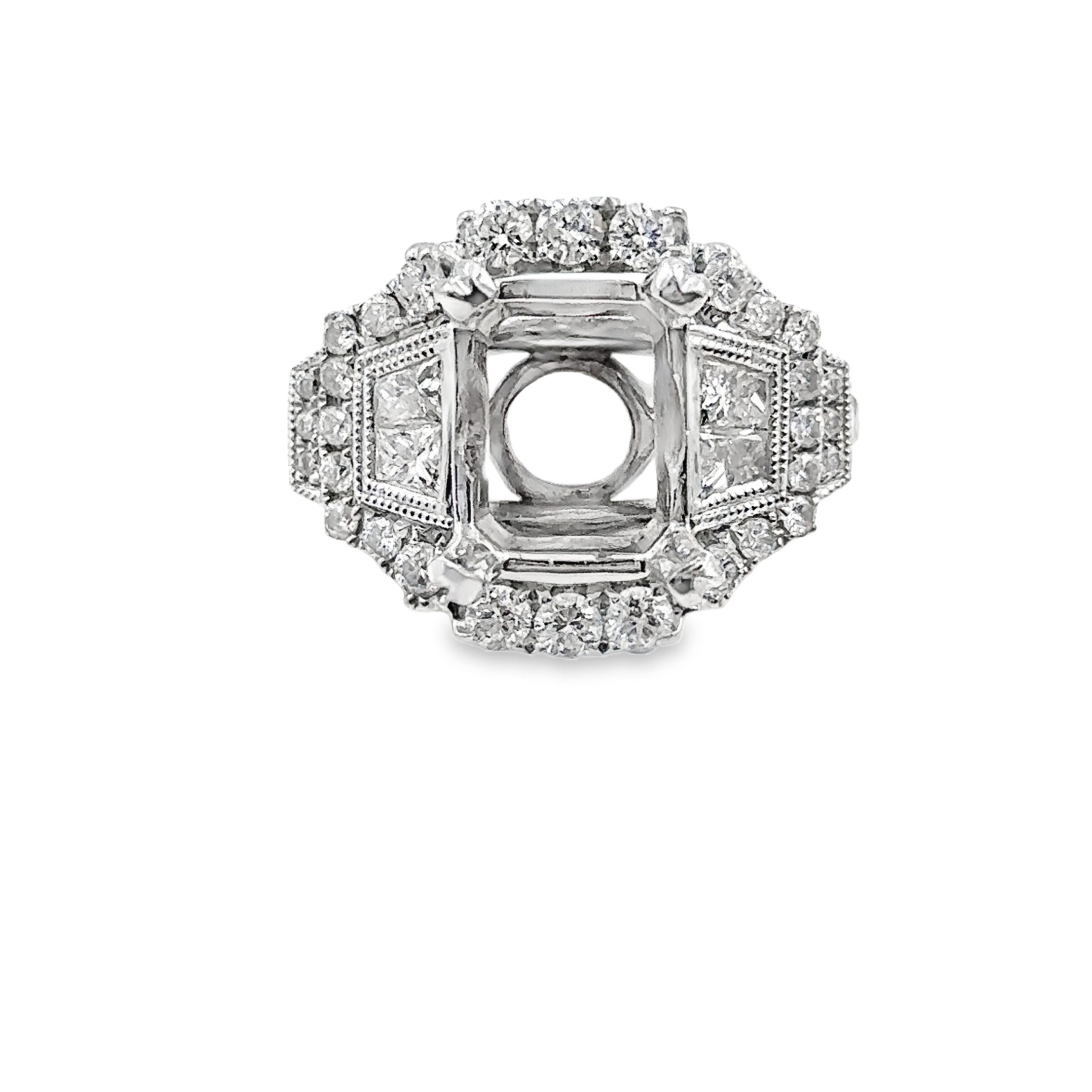 18K White Gold Semi-Mount Ring featuring 58 diamonds with a total weight of 2.00cts. The center basket measures 9.5 x 7mm, and the ring has a weight of 7.90 grams (5.00 dwt). Ring size is 6 1/4.