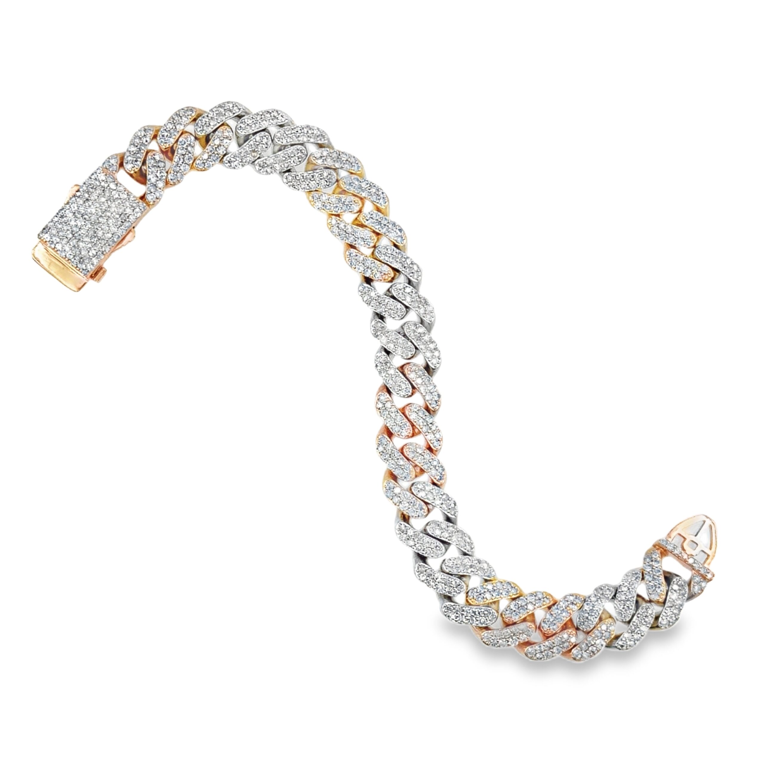 The two-toned diamond Cuban link bracelet features 580 pave-set diamonds weighing a total of 13.24 carats, intricately arranged in 10K rose and white gold links. The bracelet weighs 60 dwt (93 grams) and measures 8 3/4 inches in length.