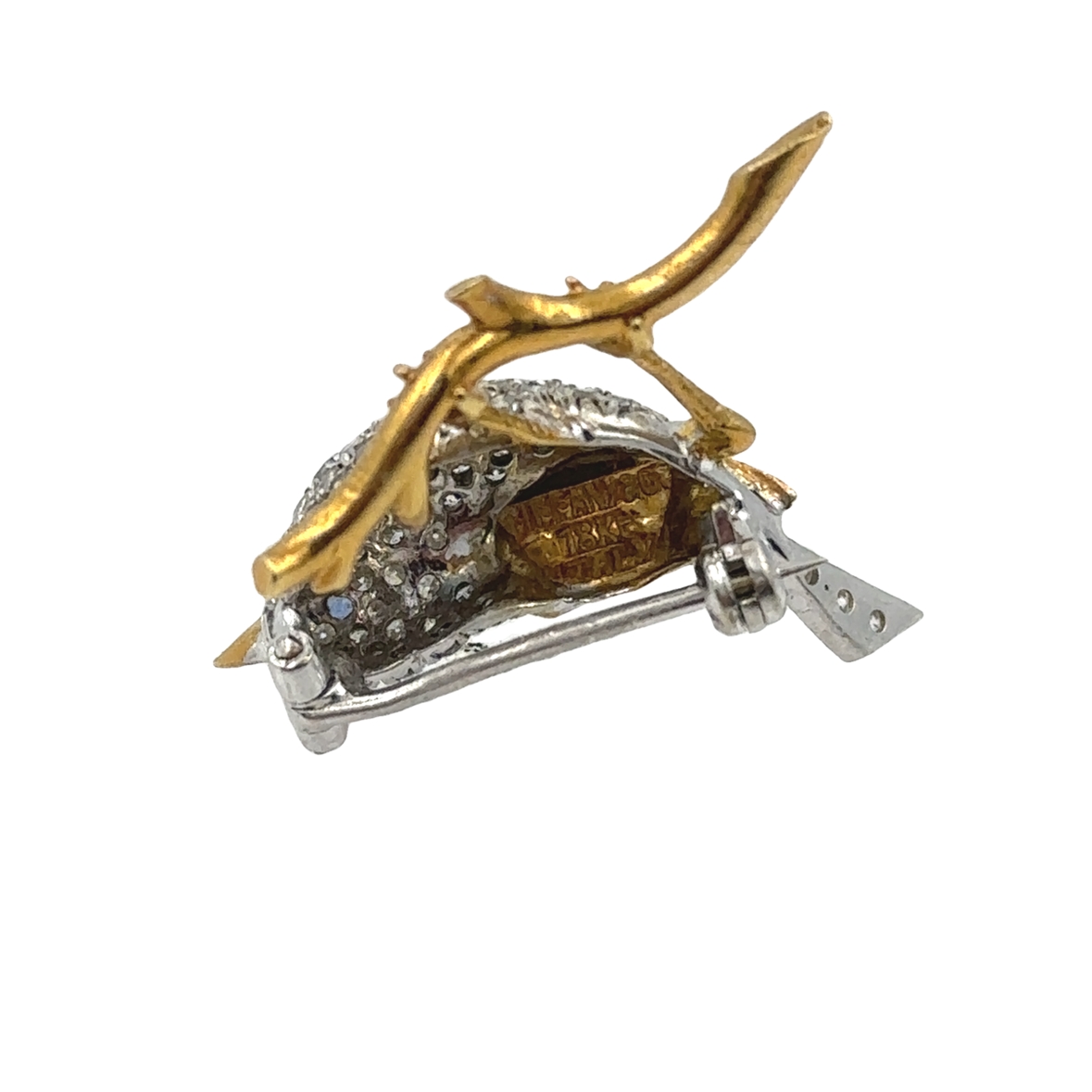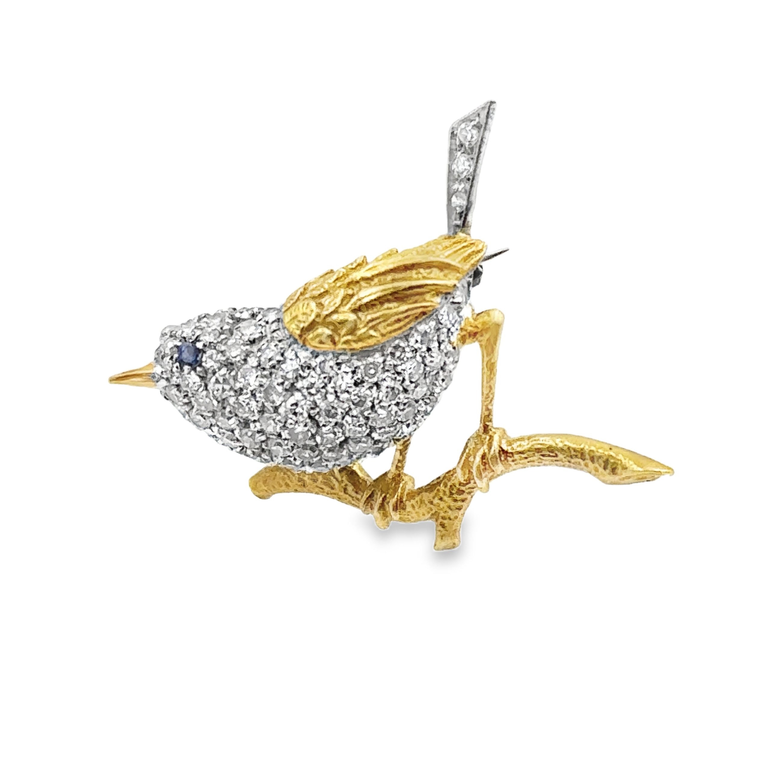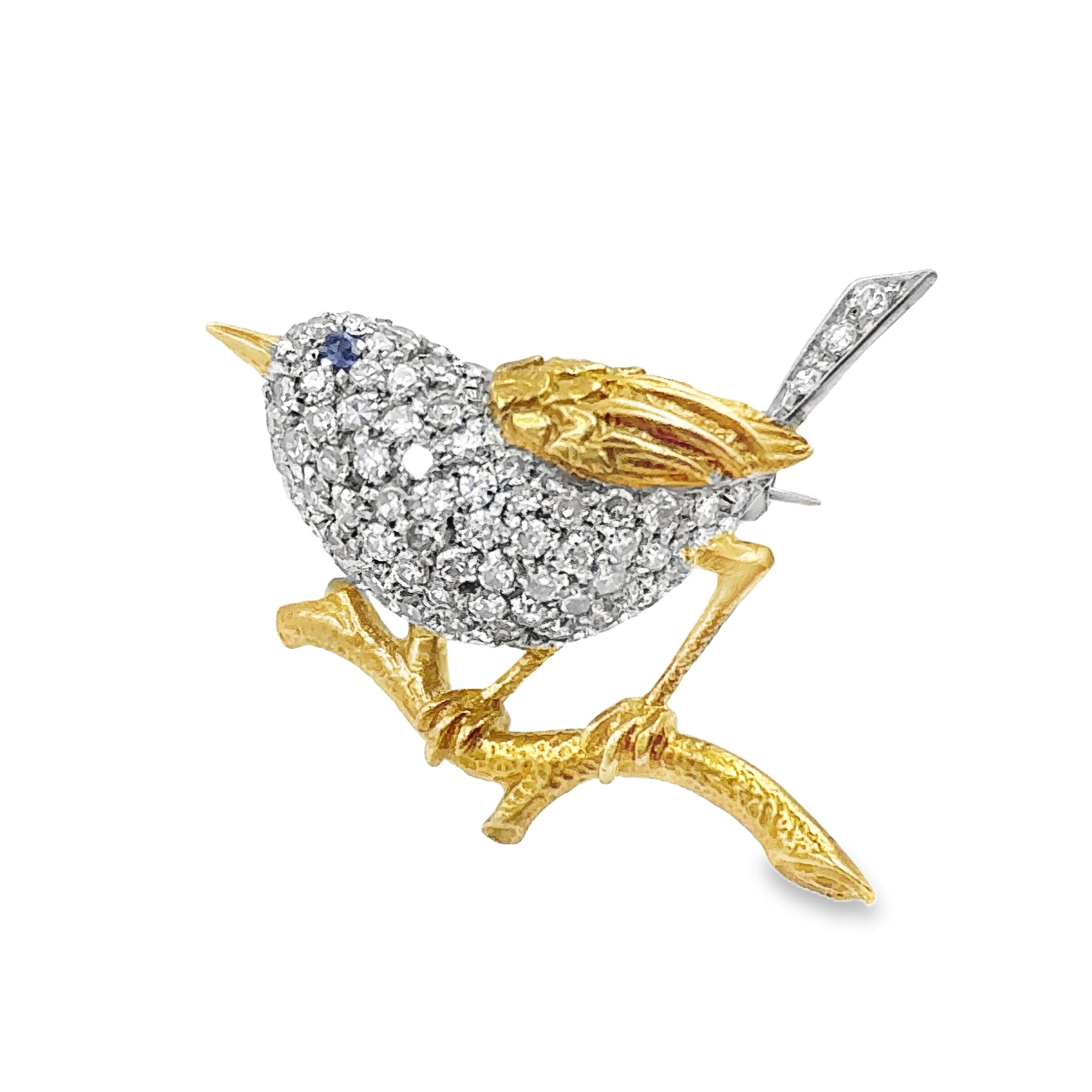 Tiny Whimsical Diamond Studded Sparrow Pin by Tiffany & Co, featuring a perched bird on a branch with a pavé set diamond body accented with yellow gold highlights. The pin measures 25 x 21mm.