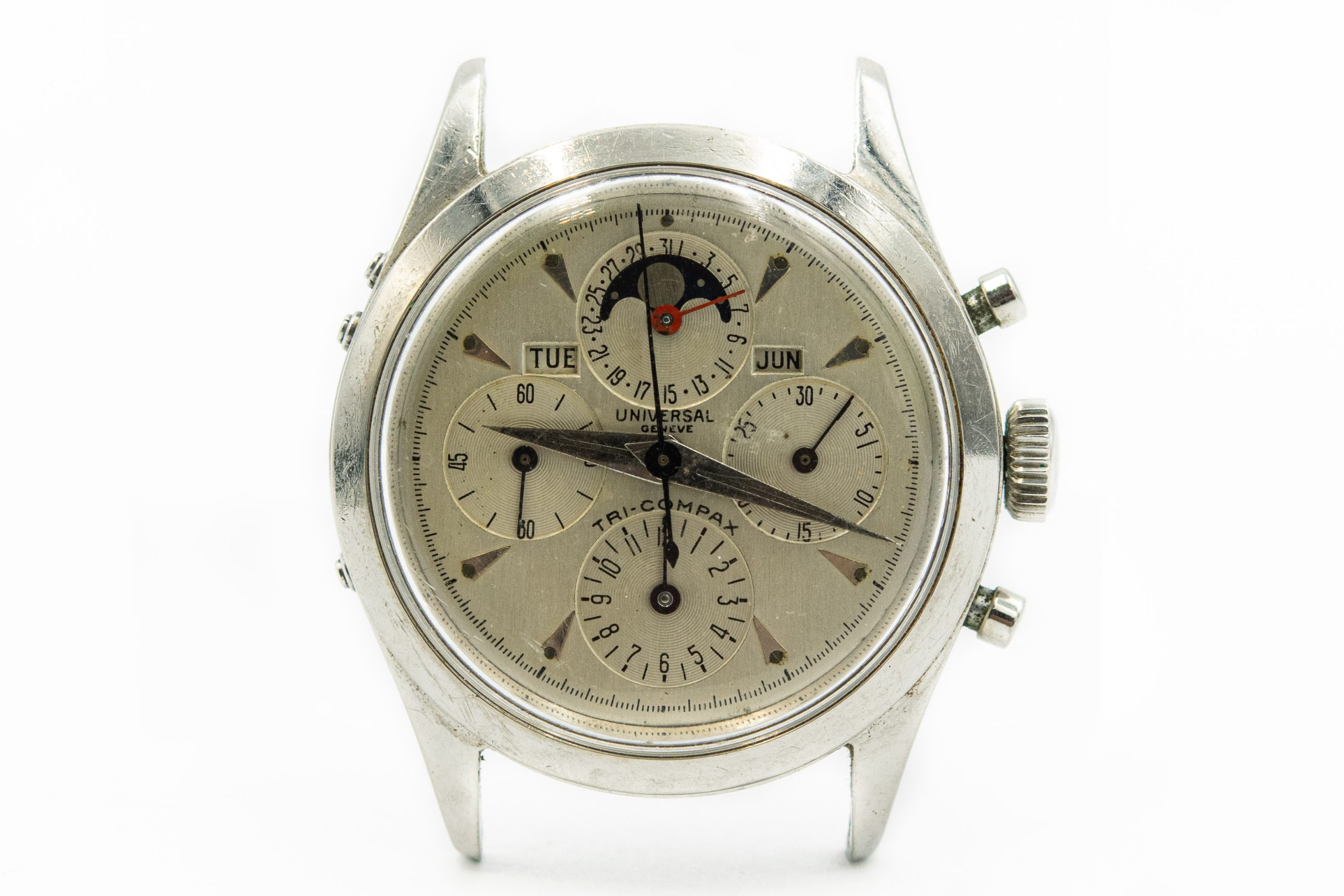 Universal Geneve Tri-Compax Stainless Steel/Silver Dial 1957 Wristwatch. The watch is signed Universal, Geneve, Tri-Compax, Ref. 22297-3, Case No. 1'748'072, Circa 1956. The watch has a Cal. 281 nickel-finished lever movement, 17 jewels and metal dust cap. It features an original and unique "no outer minute division" dial which was a custom order item from the factory. It was printed without the classic Arabica minute divisions, applied dagger numerals with luminous accents, luminous hands, four subsidiary dials for date and moon phases, constant seconds, 30 minutes and 12 hours registers, two windows for day and month, circular water-resistant-type steel case. It measures 42mm x 35mm in width without the crown. The watch has a screw down back and as you can see from the photos the watch is in overall excellent condition.