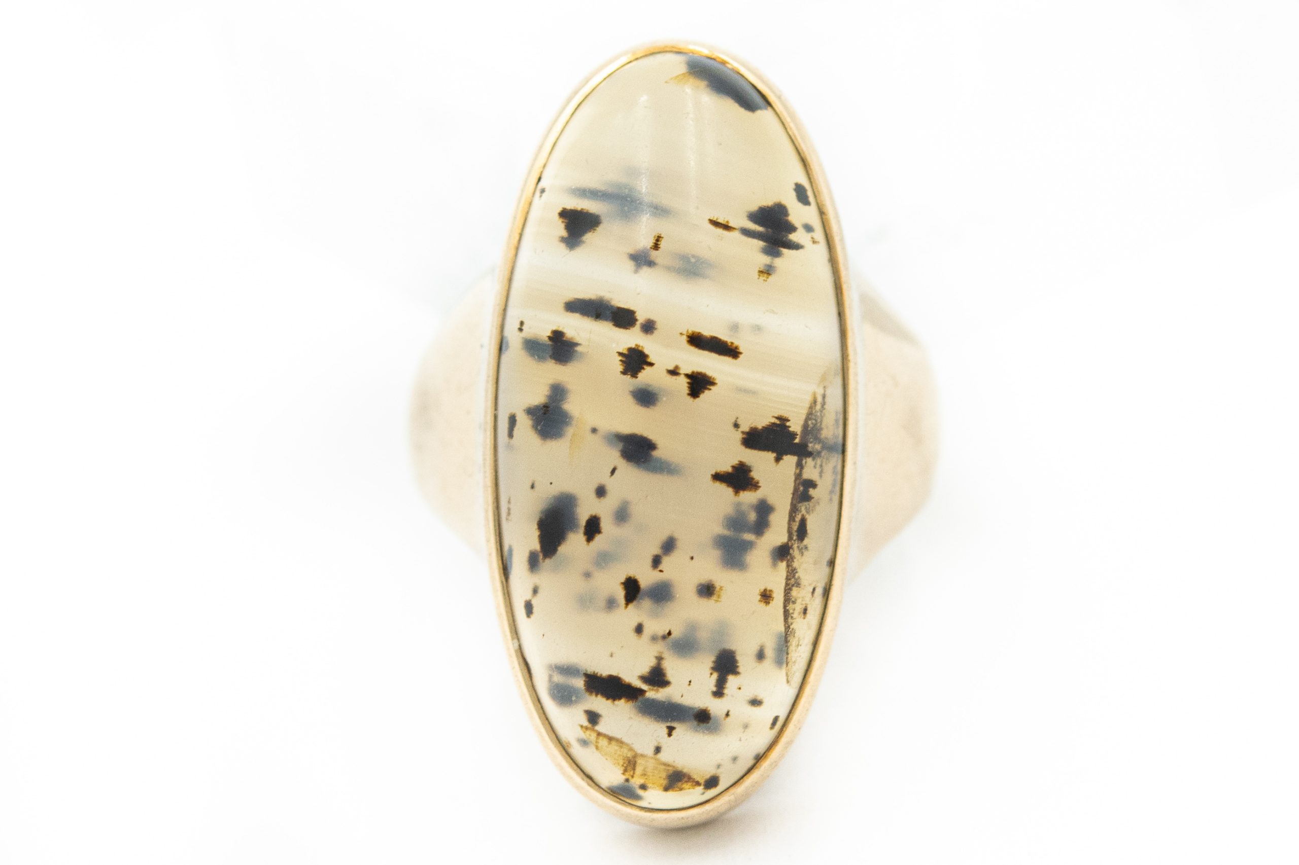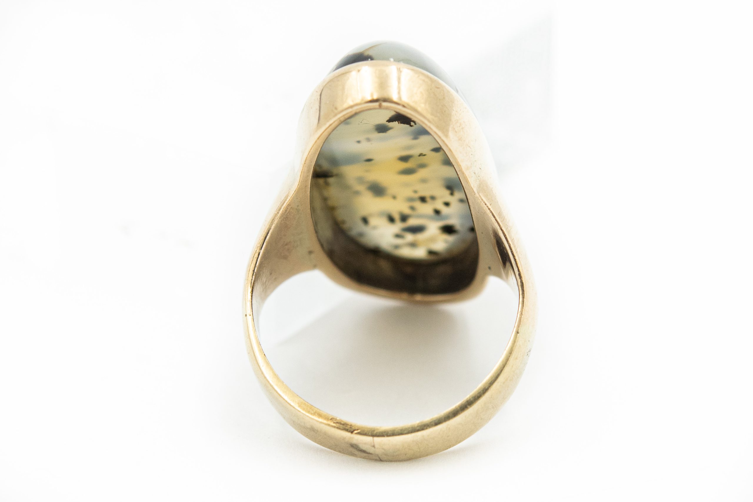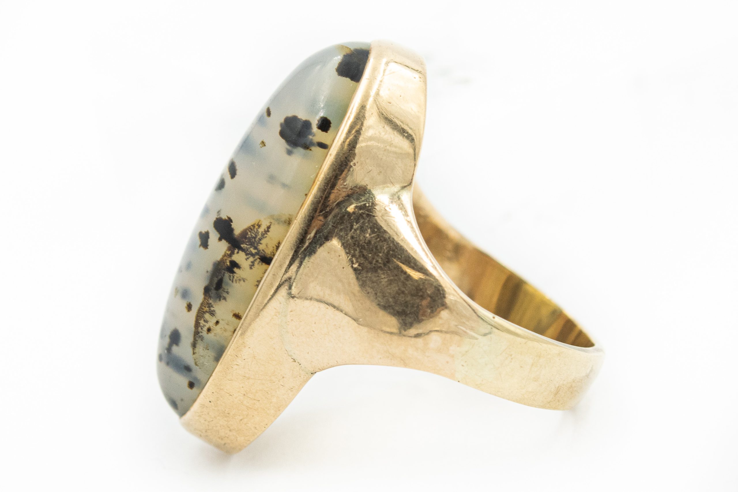 Victorian Yellow Gold and Plume Agate Ring. The ring is centrally set with a large oval cabochon cut spotted agate with a pretty transparent body and eye pleasing translucency. It is bezel set in a handmade 10K yellow gold mounting that weighs 8.9dwt/13.9g. The agate measures 30mm x 15mm. The ring is a size 9.