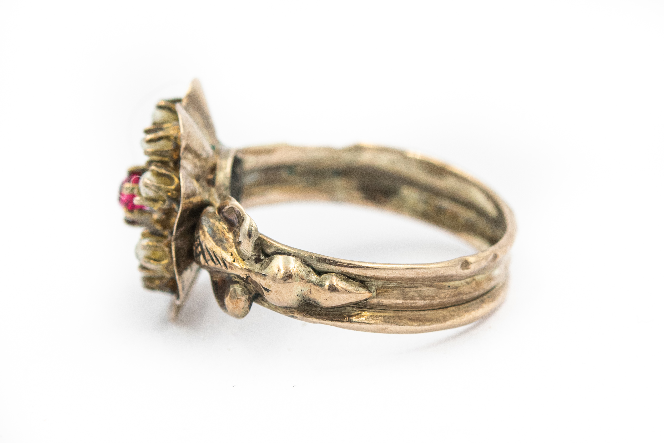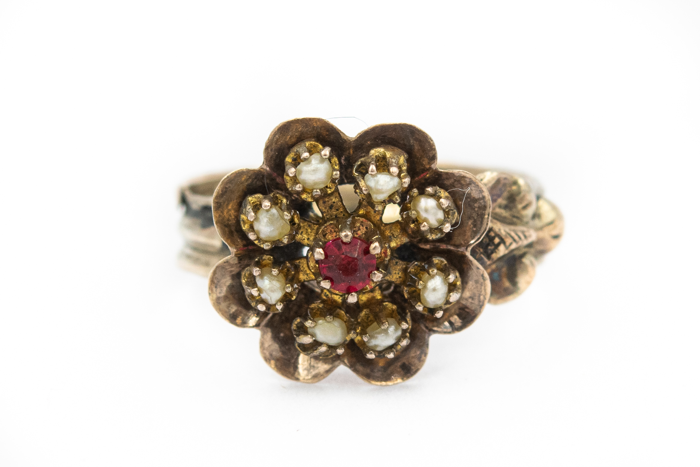 Victorian Yellow Gold Red Gemstone and Seed Pearl Ring
