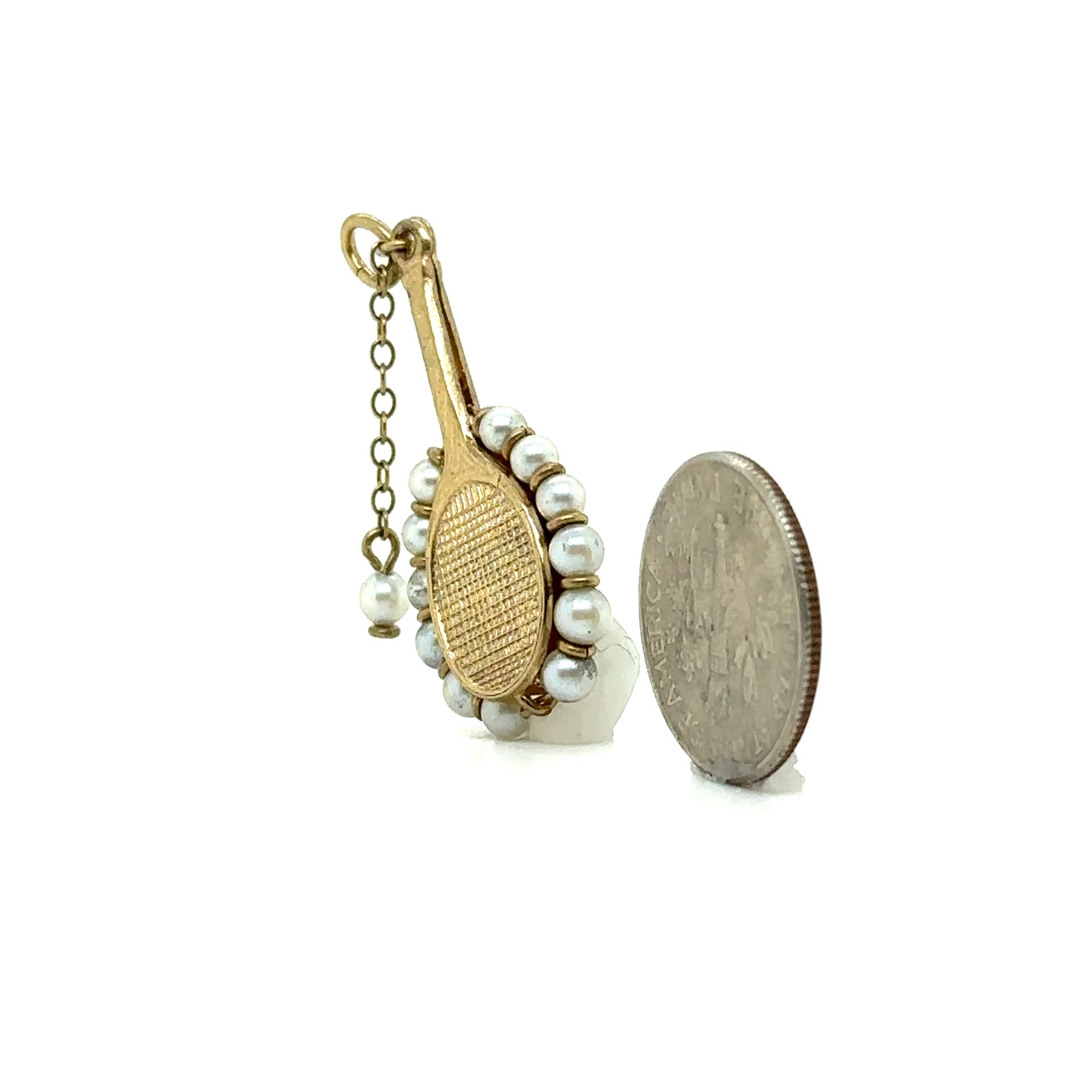Vintage Yellow Gold and Pearl Tennis Racquet and Ball Charm; 14k yellow gold; 2.10dwt/3.30g; 32mm x 15.75mm (widest point)