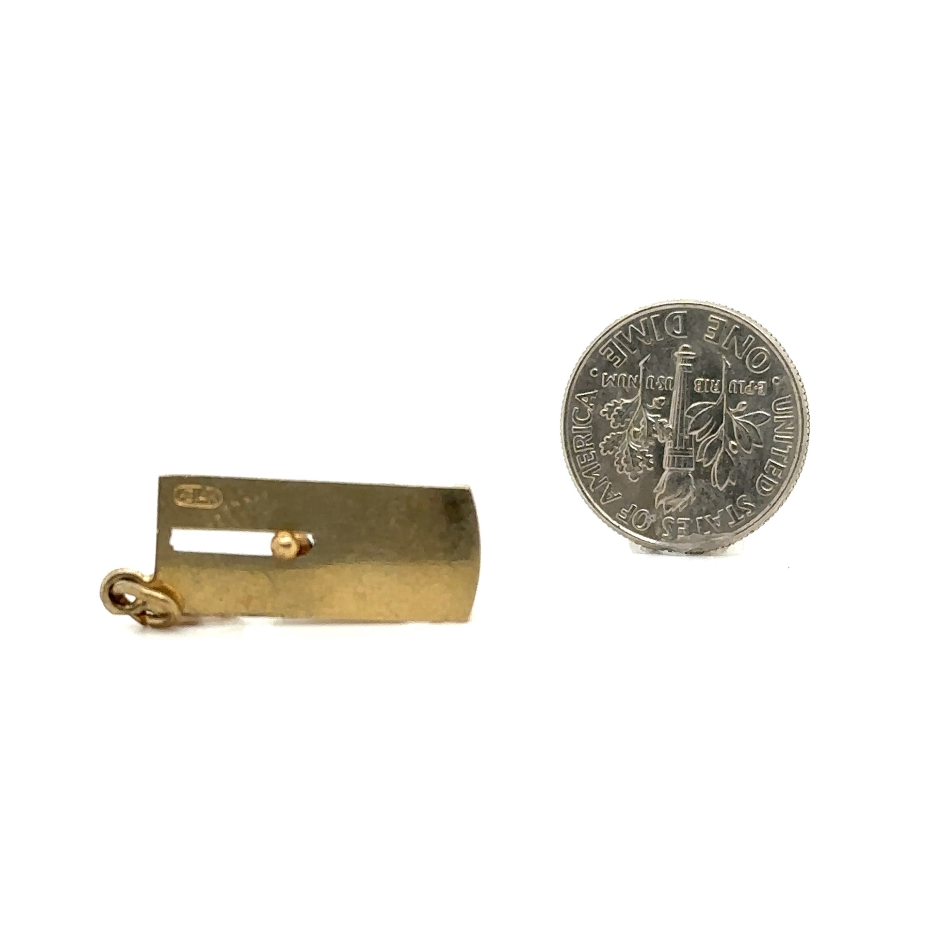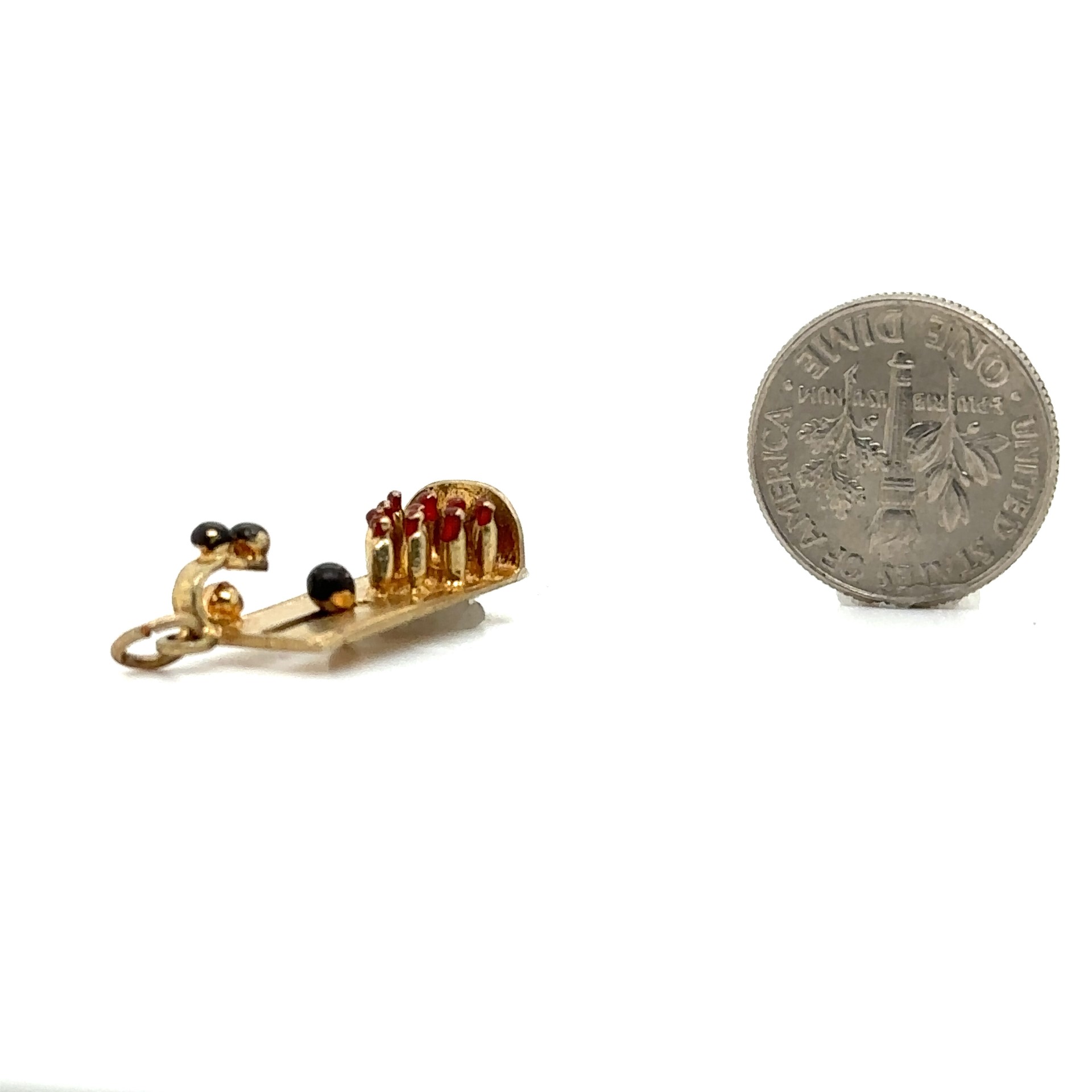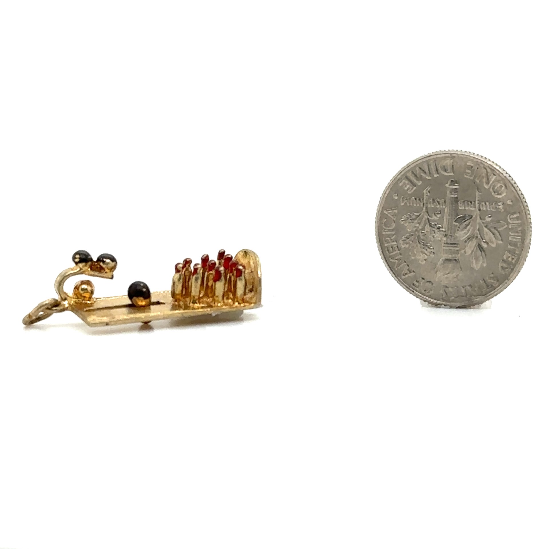 Vintage Yellow Gold Bowling Alley Movable Charm; 14k yellow gold; 1.90dwt/2.90g; 21mm x 8.70mm wide; Signed "AE14K"