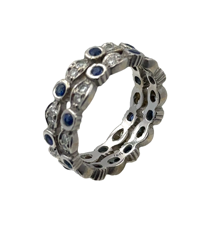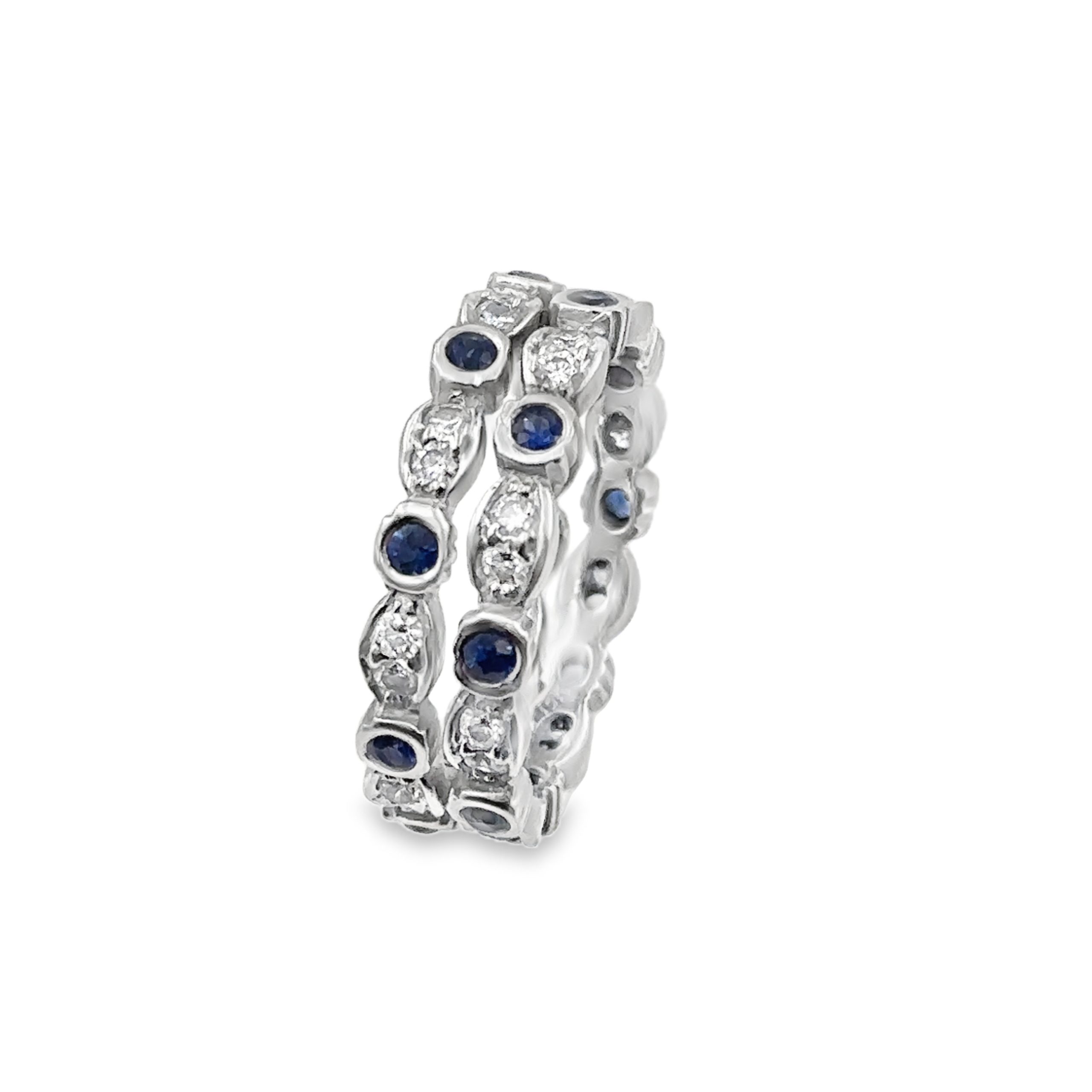 An 18K white gold diamond and sapphire wedding band set, featuring 32 diamonds totaling 1.00 carats and 16 sapphires totaling 0.60 carats, in a size 6 1/4.