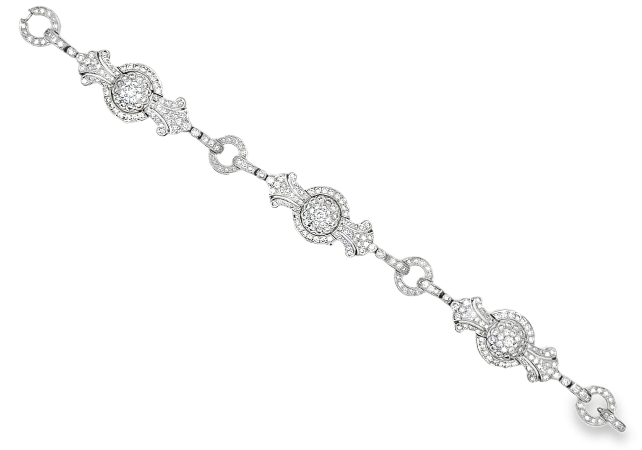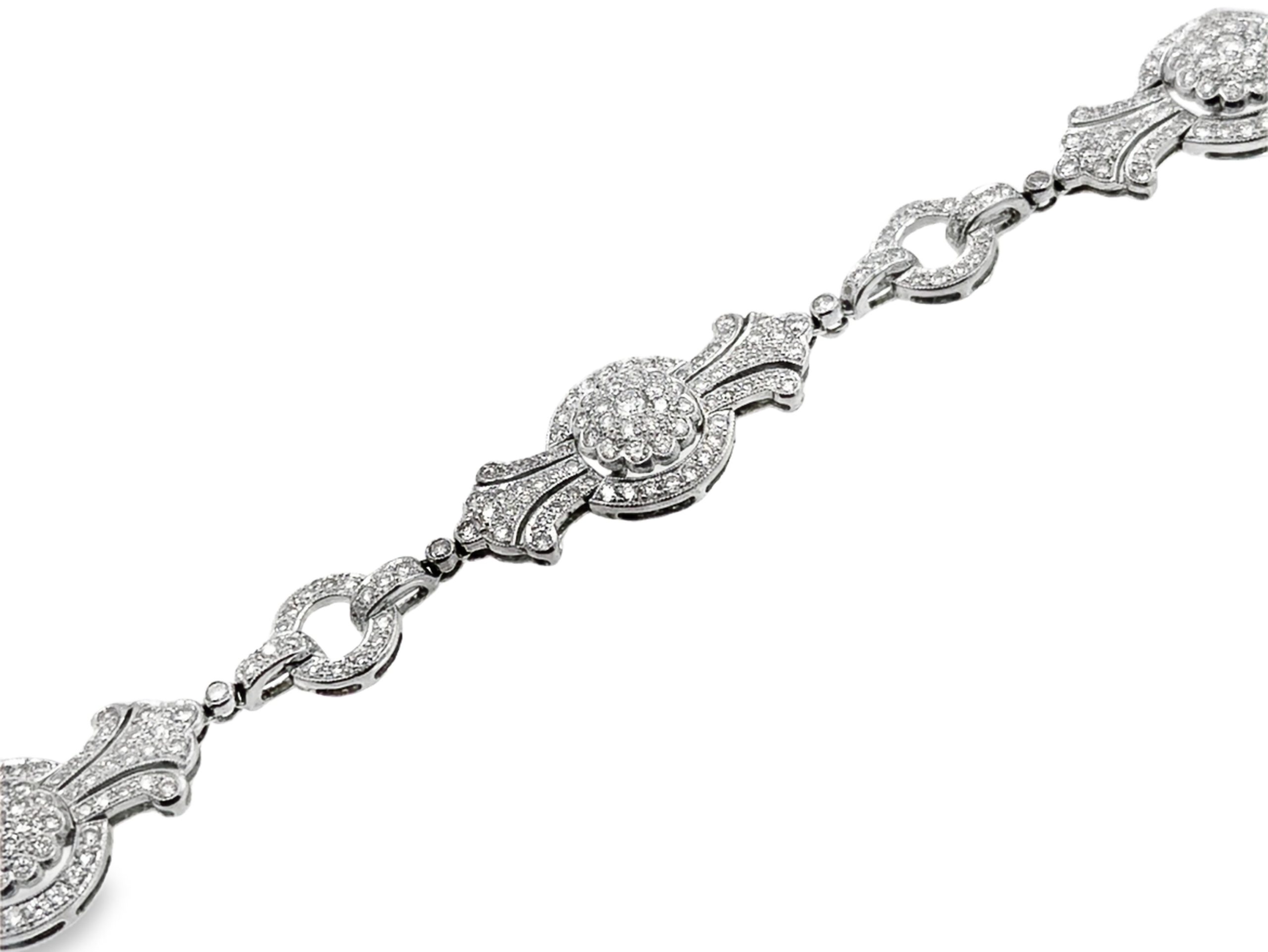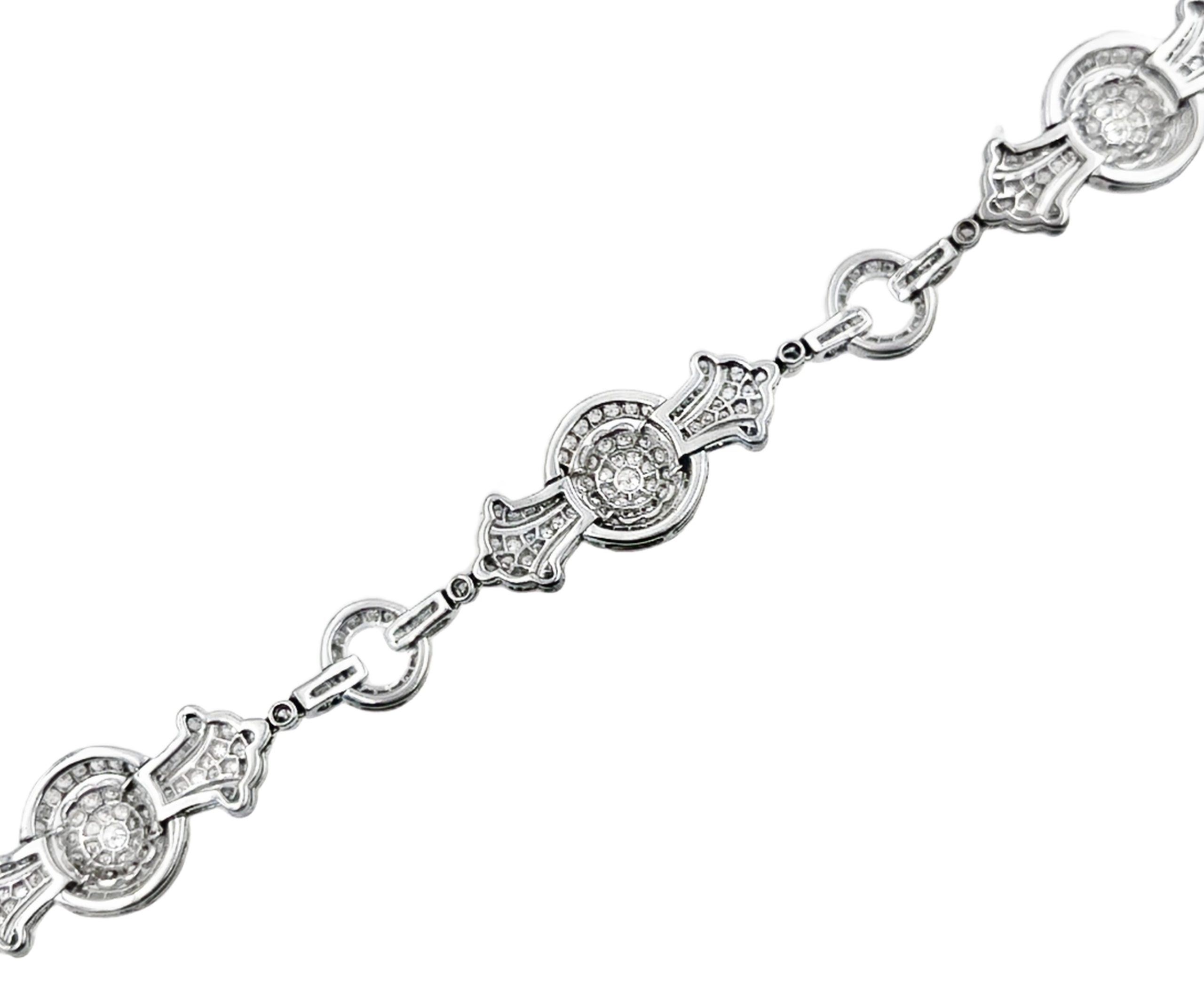 18K white gold diamond bracelet featuring a sectional design with 297 round-cut diamonds totaling 4.50 carats. The bracelet weighs 11.80Dwt (18.30Gr) and measures 6 3/4 inches in length.