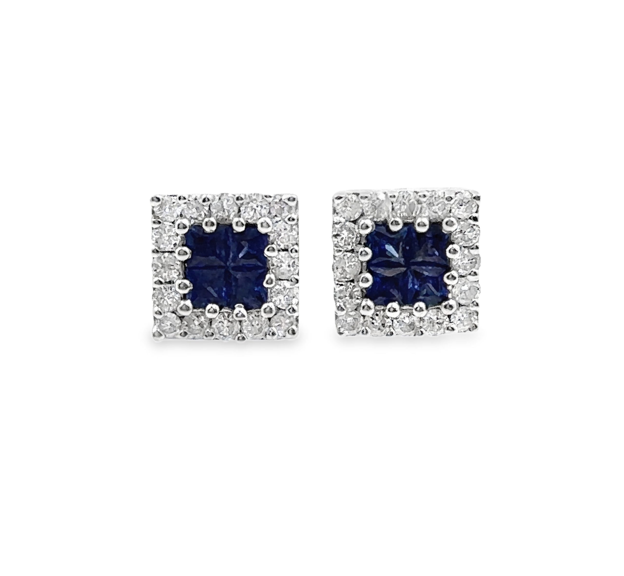 18K white gold earrings set with 32 round-cut diamonds totaling 0.50 carats and 8 centrally set square cut sapphires weighing 1.00 carat. Total weight: 2.00Dwt (3.10Gr).