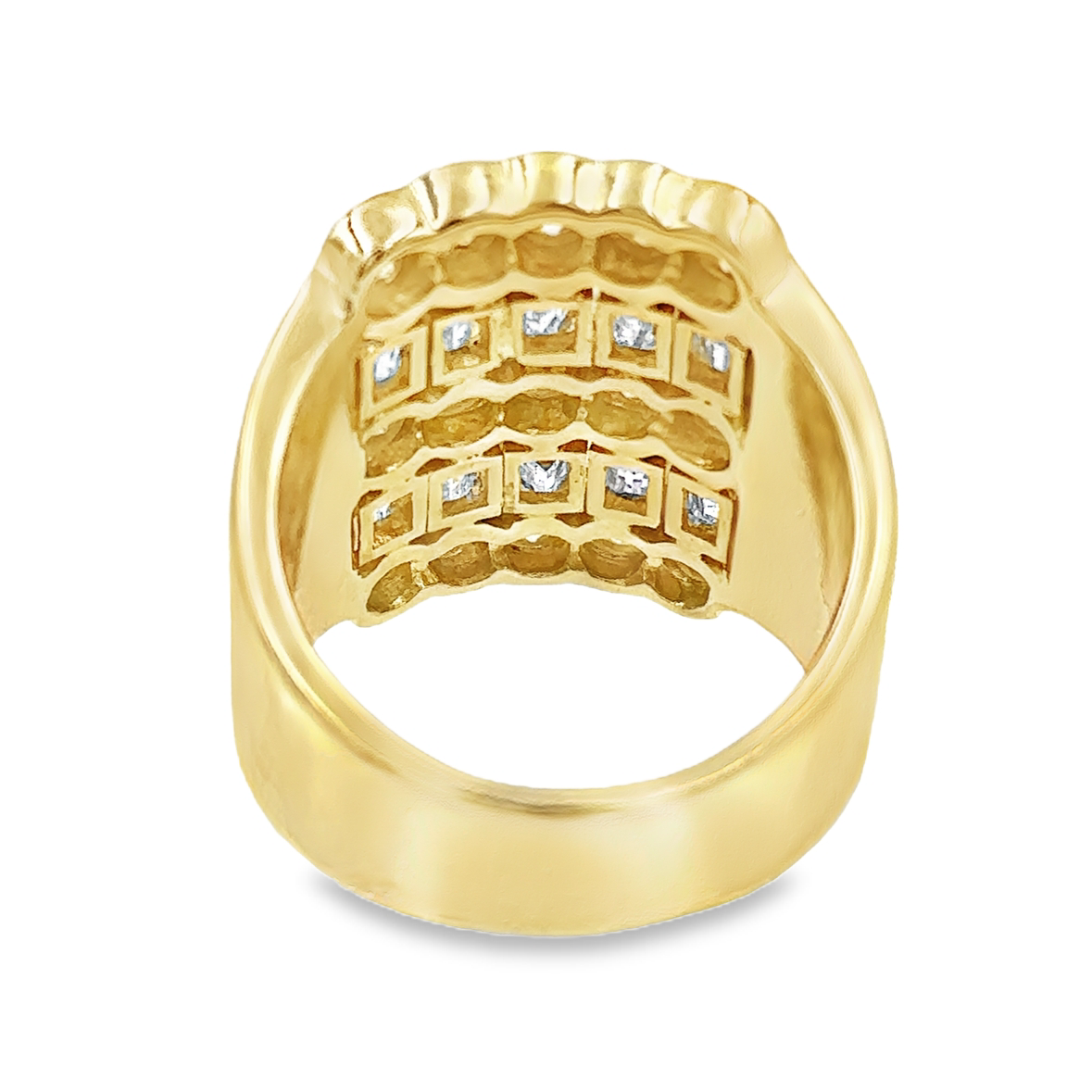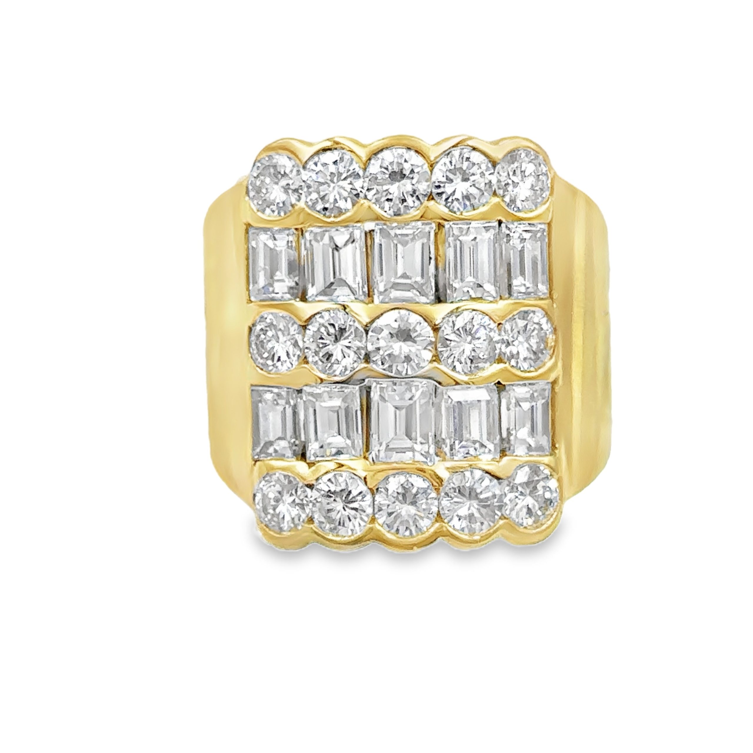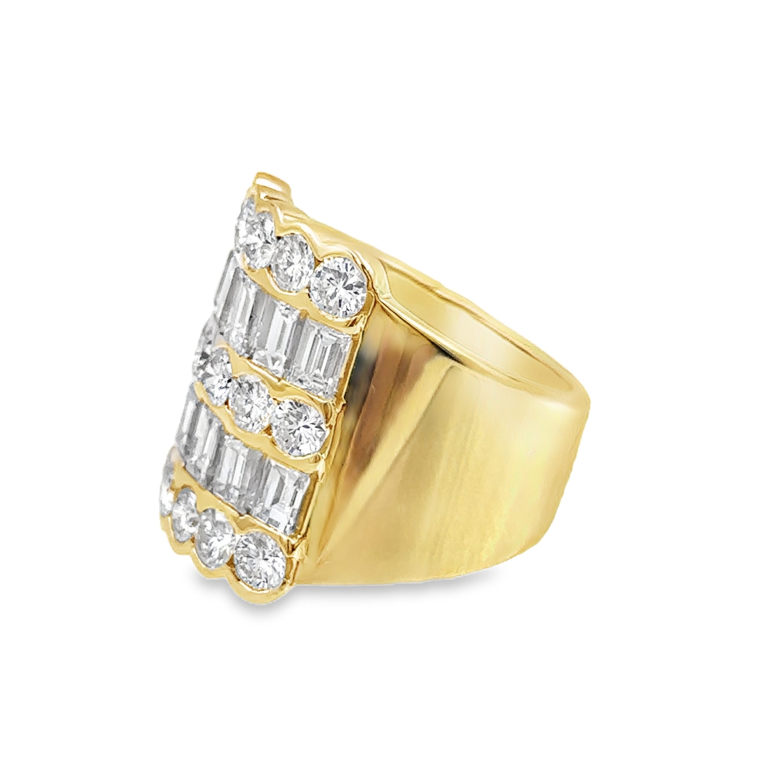 This elegant 18K yellow gold band features five rows of alternating emerald cut and round brilliant-cut diamonds, totaling 5.50 carats. The ring weighs 12 Dwt (18.70 grams) and is a size 7 3/4.