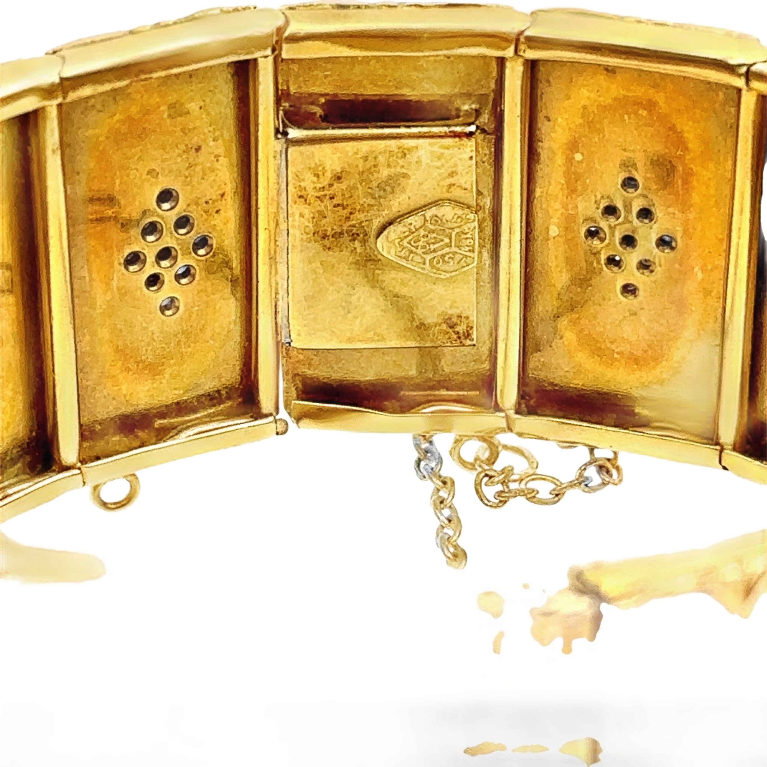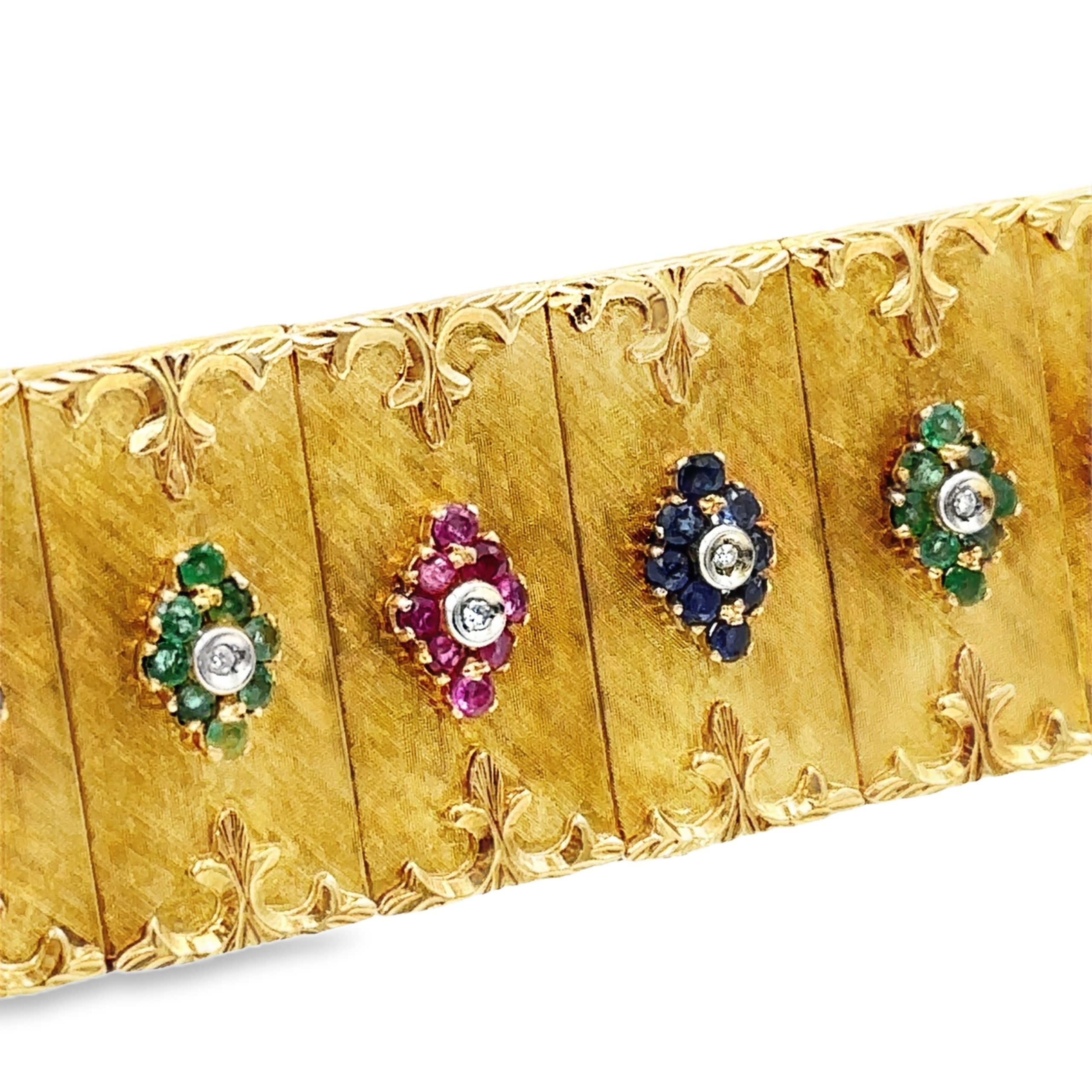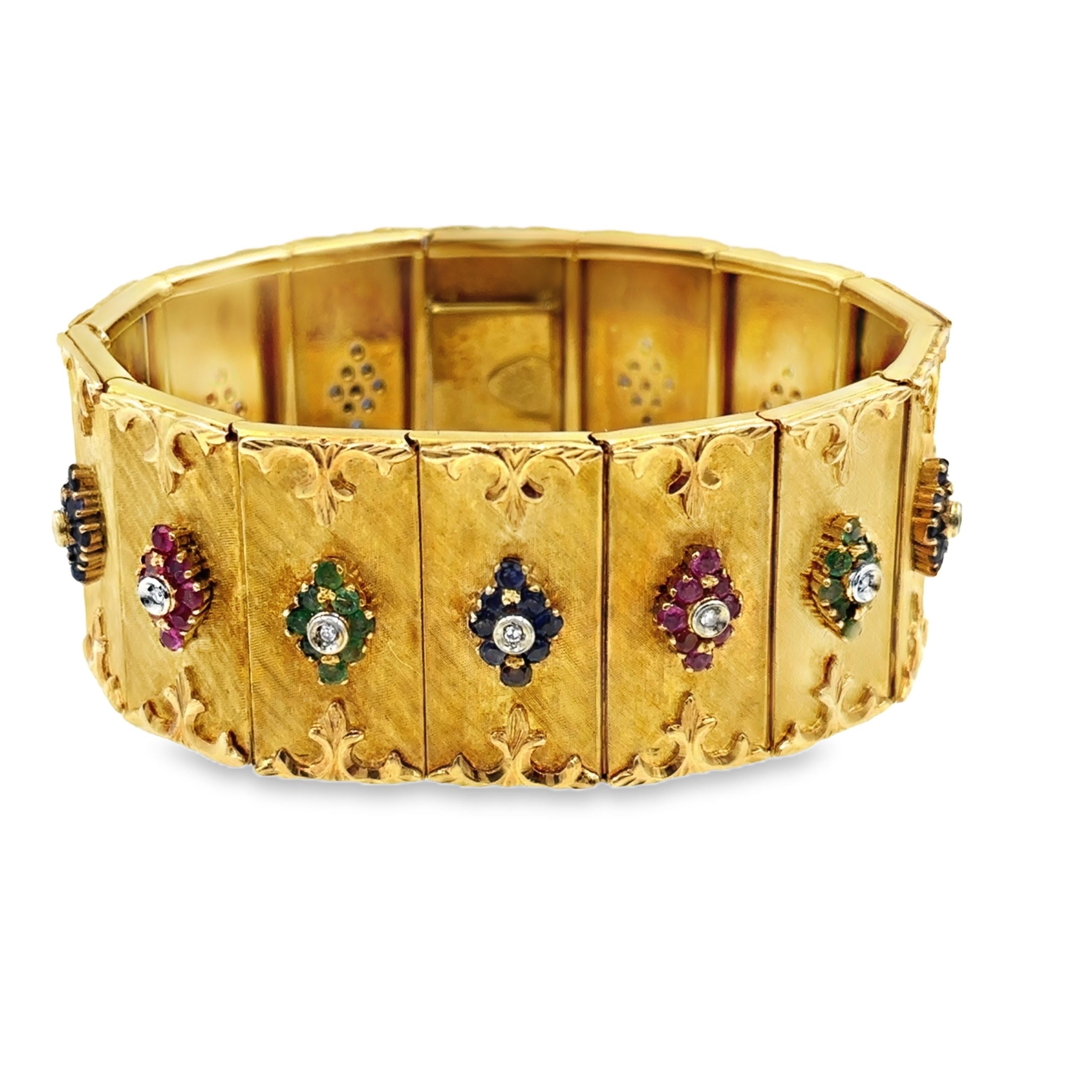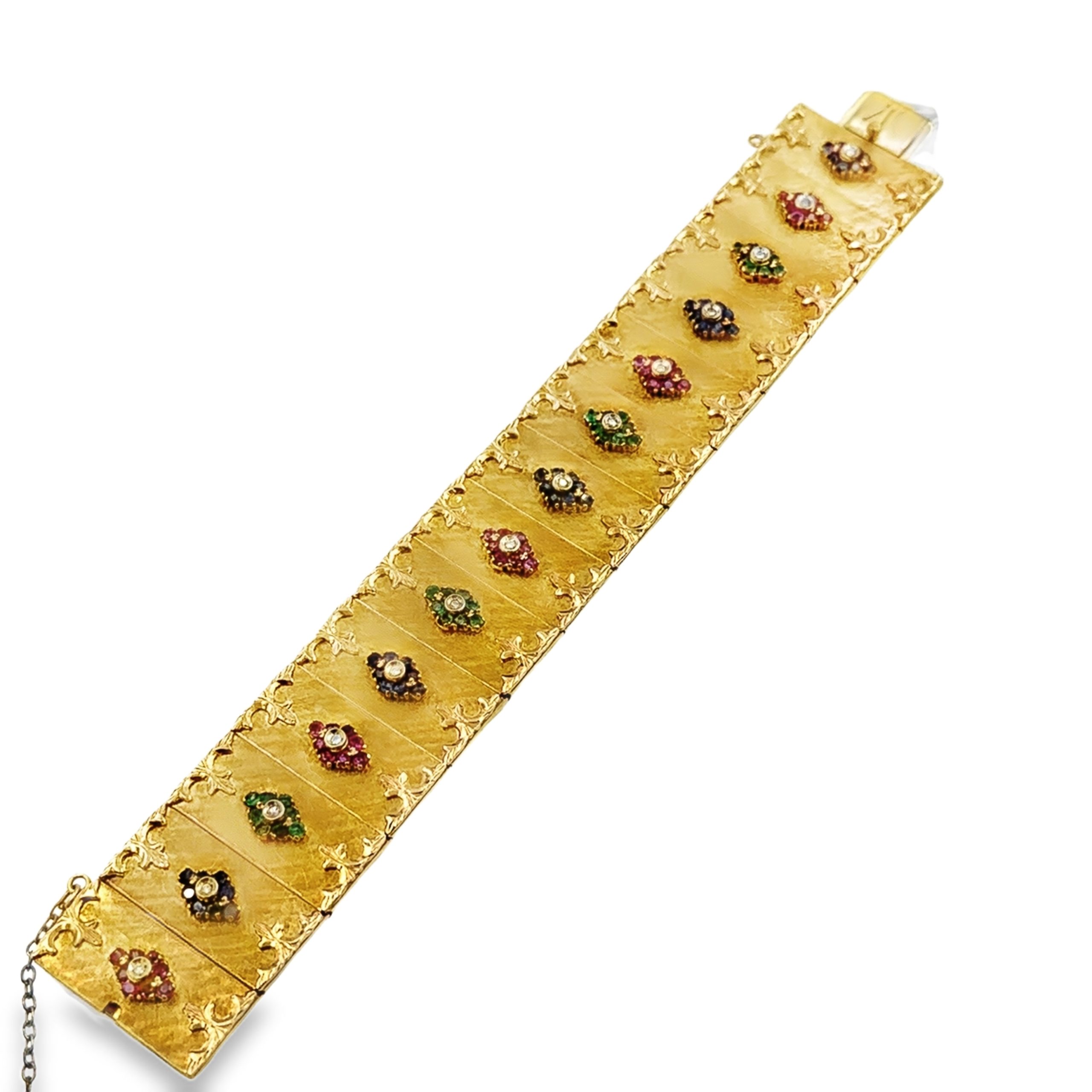 Vendorafa Lombardi 18K Multi-Colored Gemstone Bracelet. This bracelet features a Florentine finish, set with 14 diamonds totaling 0.25 carats, and 112 rubies, sapphires, and emeralds weighing 5.50 carats. It weighs 46 dwt (71.53 grams) and measures 7 1/4 inches in length by 1 1/8 inches in width. Maker's mark on the clasp.
